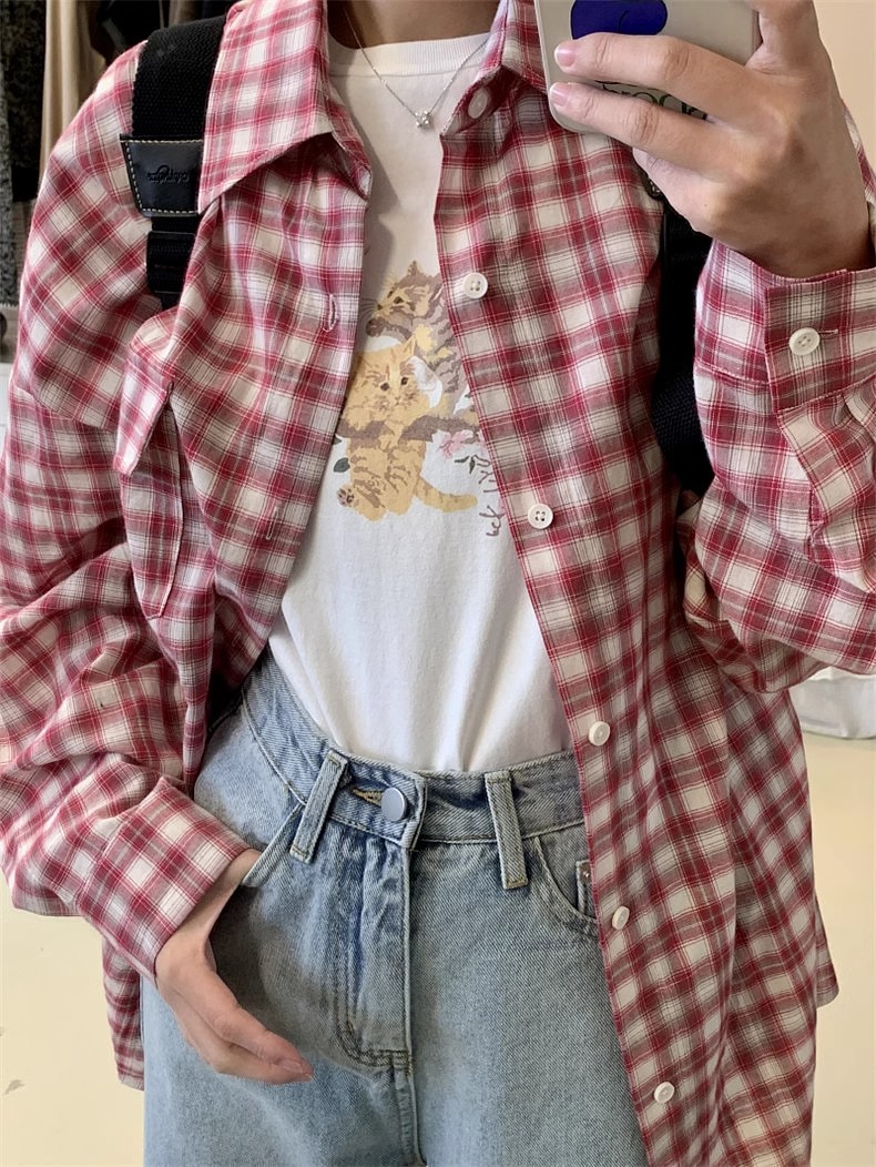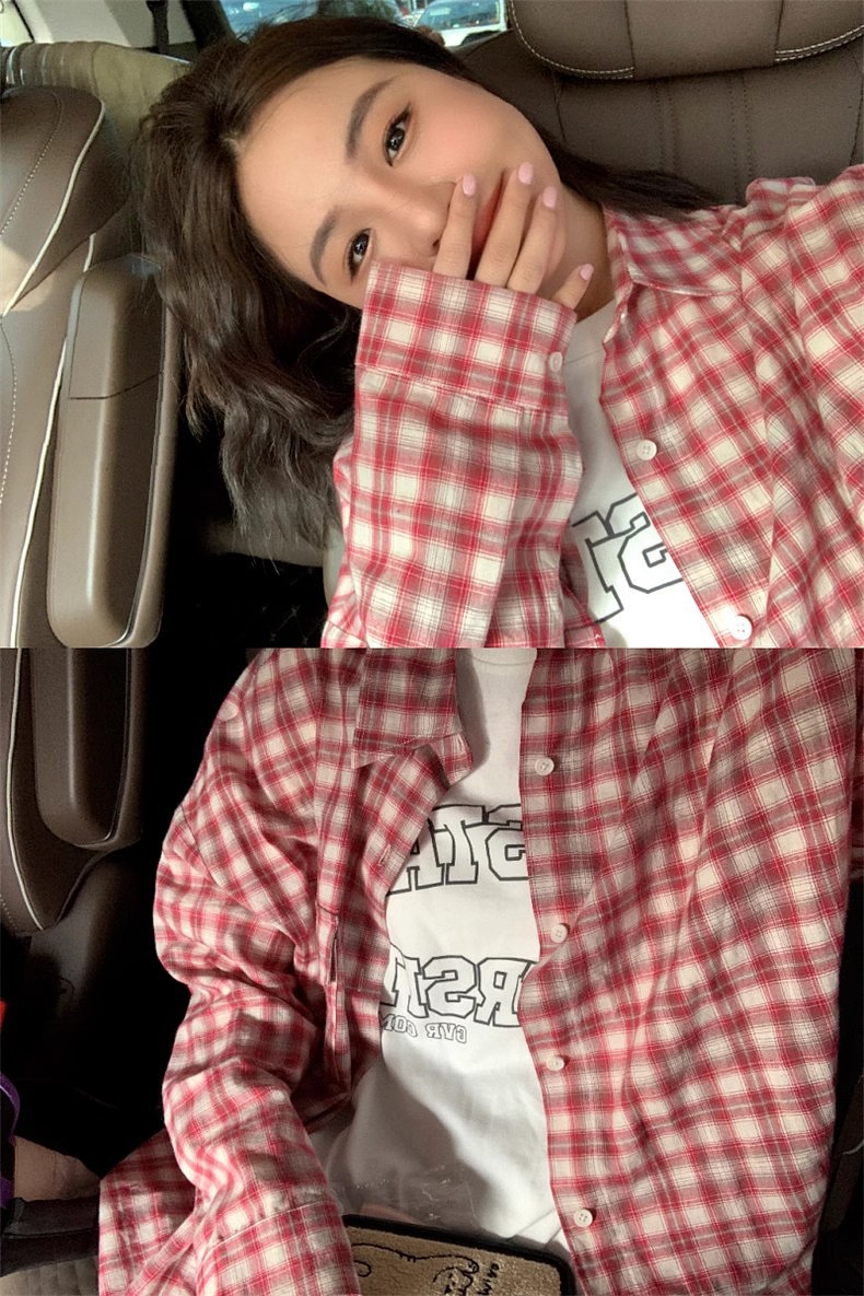 2026 새로운 스타일의 순면 레트로 레드 체크 셔츠 여성용 봄 신상 루즈핏 셔츠 자외선 차단 얇은 재킷스토어 가기