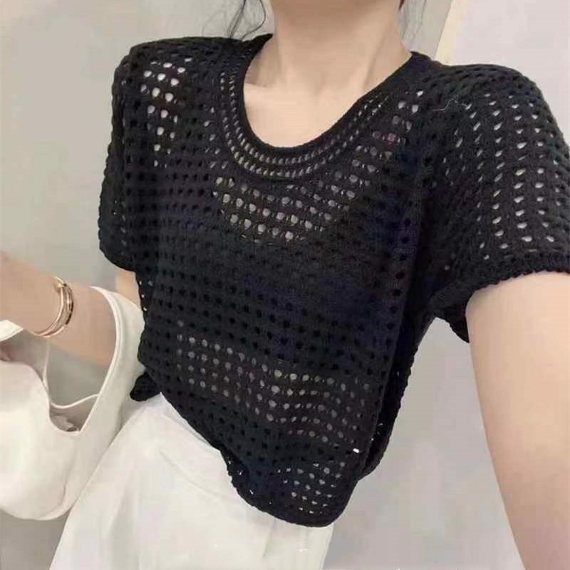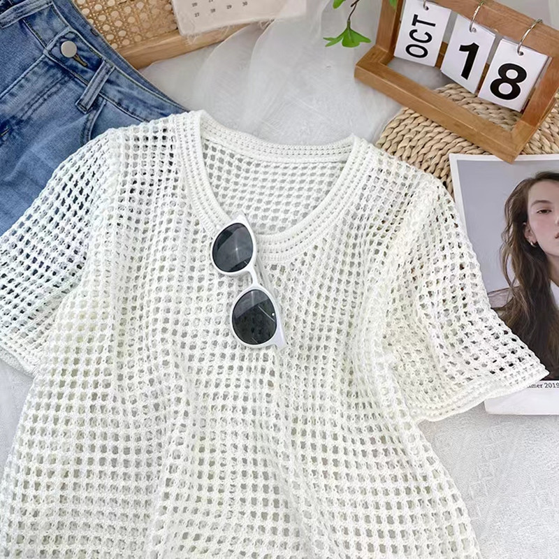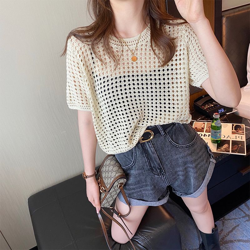 중공 반팔 스웨터 여성의 여름 얇은 디자인 센스 틈새 세련된 독특한 루즈 올 매치 블라우스 탑