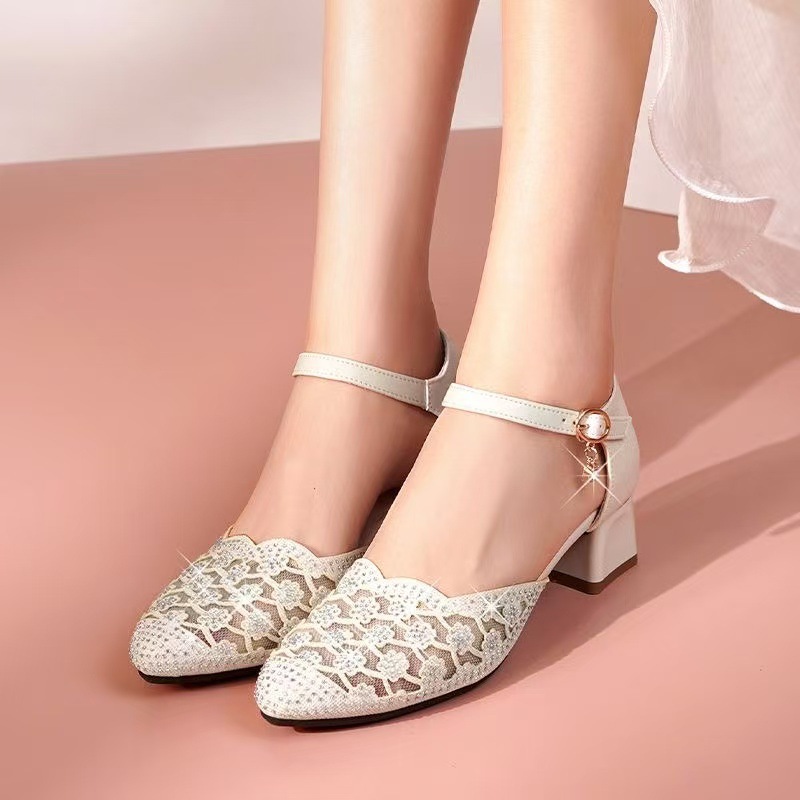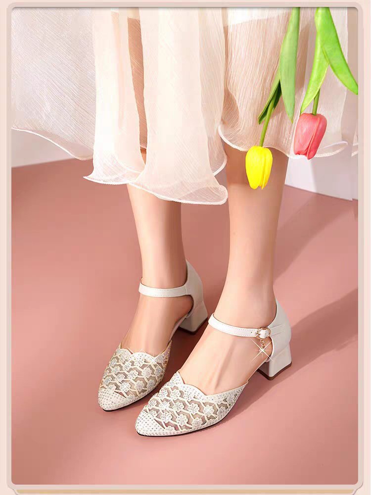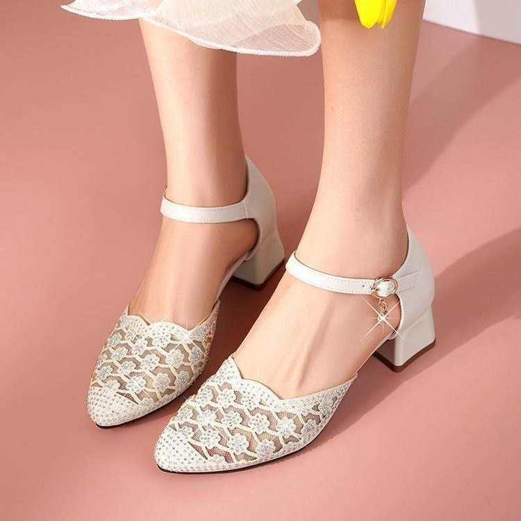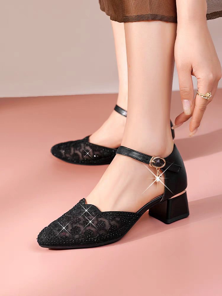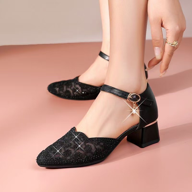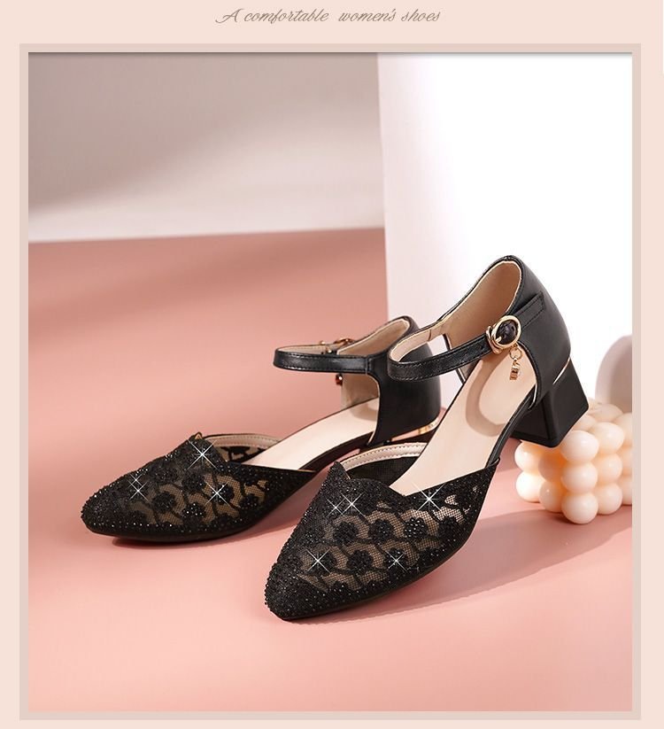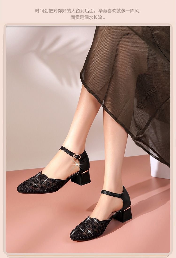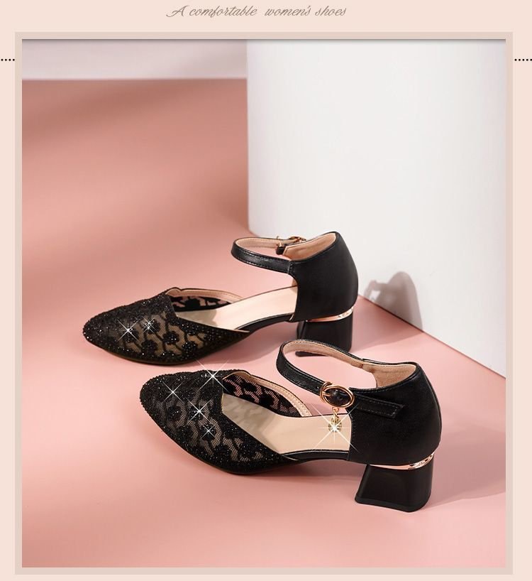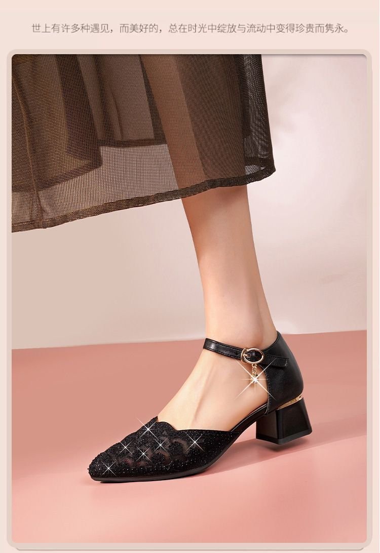 여성용 할로우 샌들 뉴 할로우 소프트 하단 소프트 표면 미드 힐 두꺼운 힐 포인팅 라인스톤 버클 하이힐