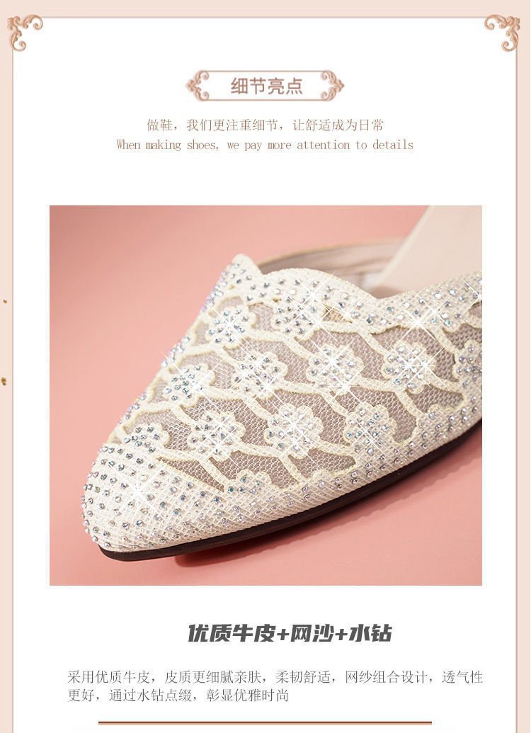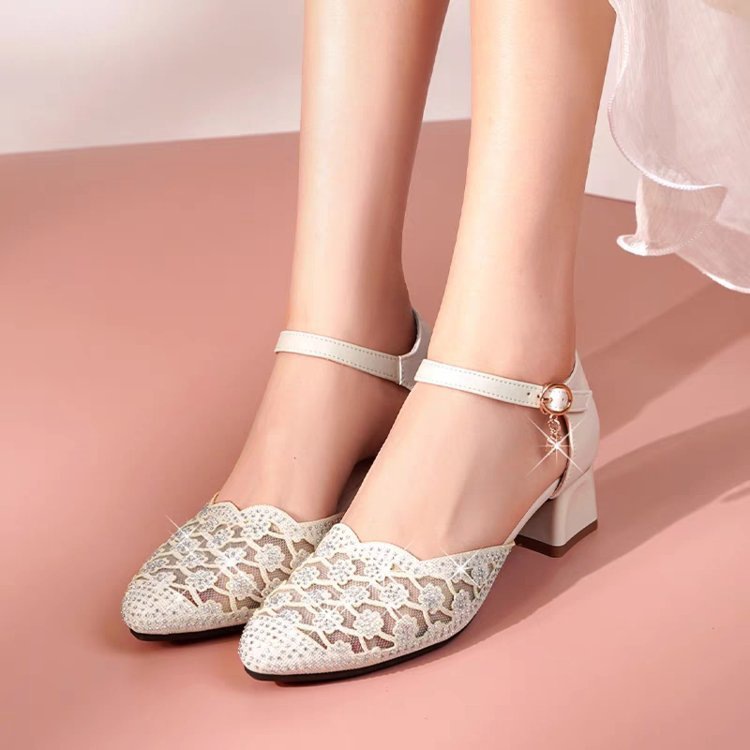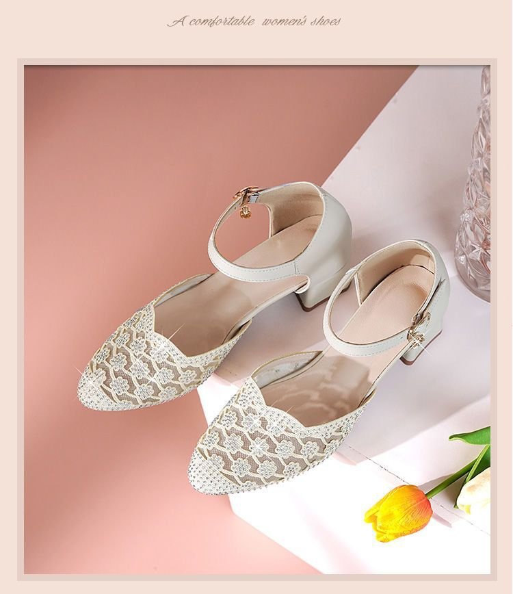 여성용 할로우 샌들 뉴 할로우 소프트 하단 소프트 표면 미드 힐 두꺼운 힐 포인팅 라인스톤 버클 하이힐스토어 가기