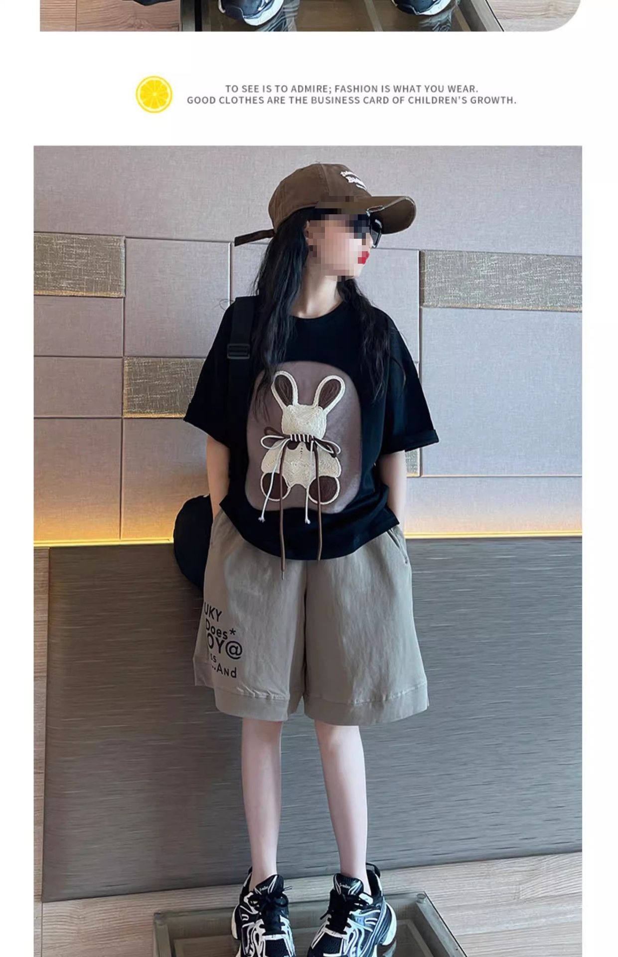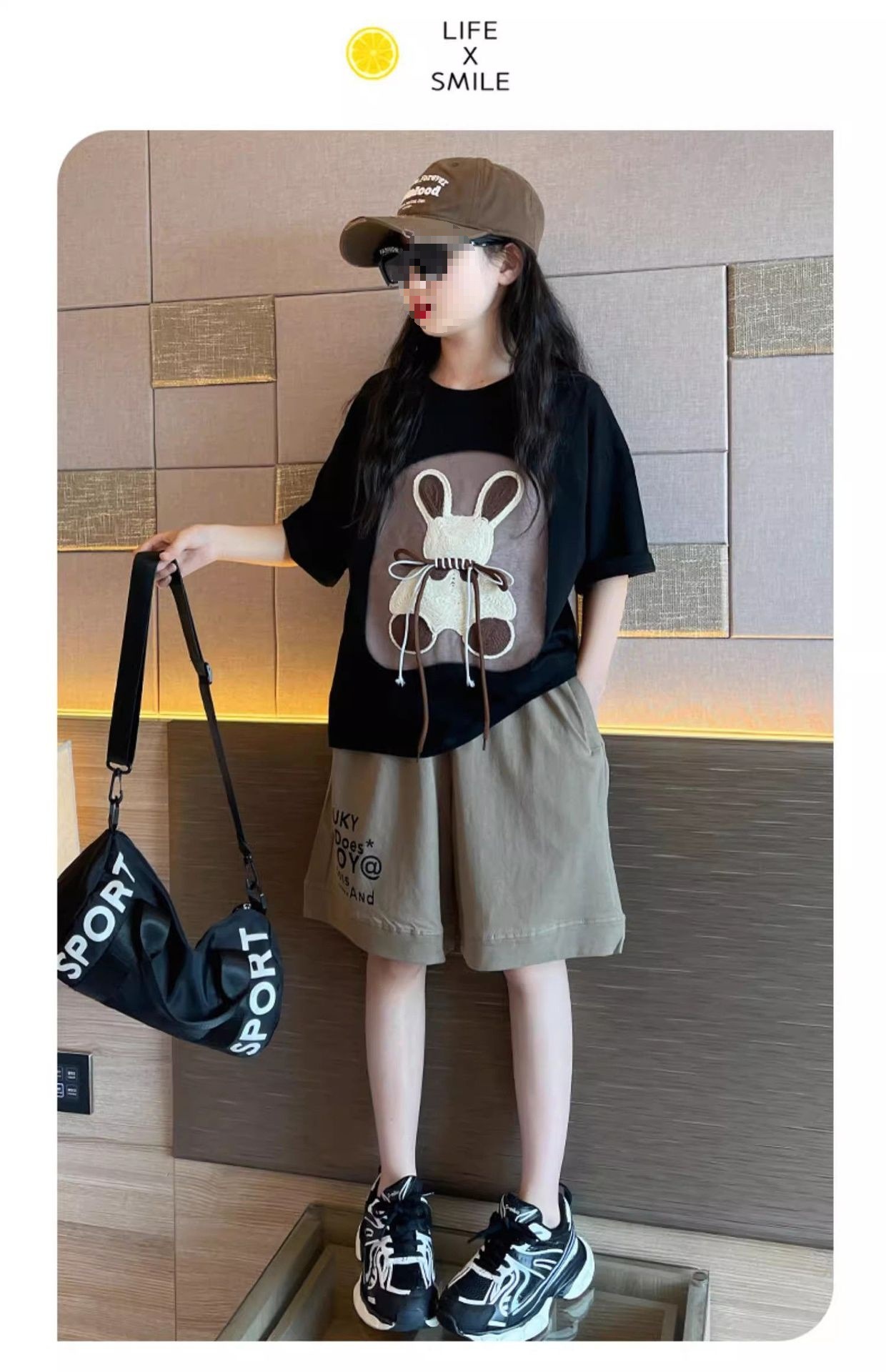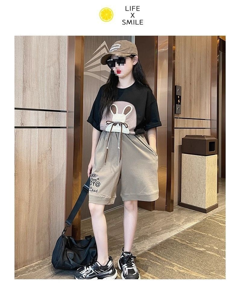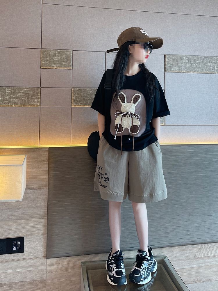 여자 여름 만화 티셔츠 5 점 바지 투피스 세트 2025 새로운 한국 스타일 얇은 스포츠 세트 트렌디스토어 가기