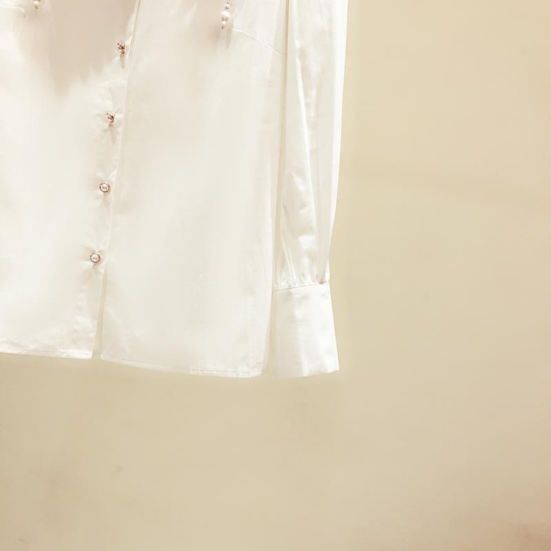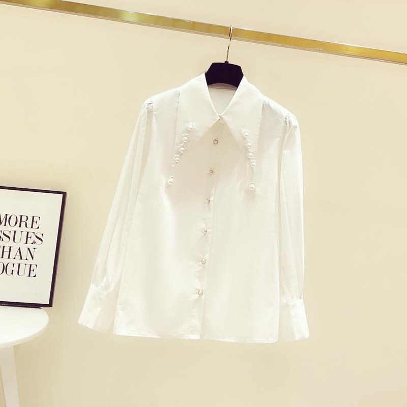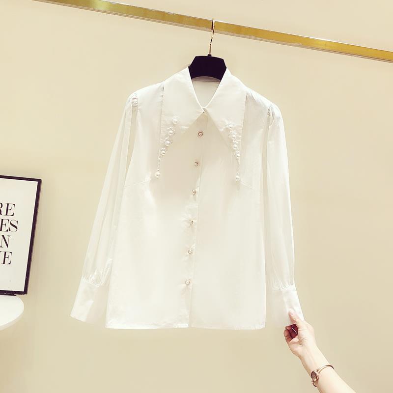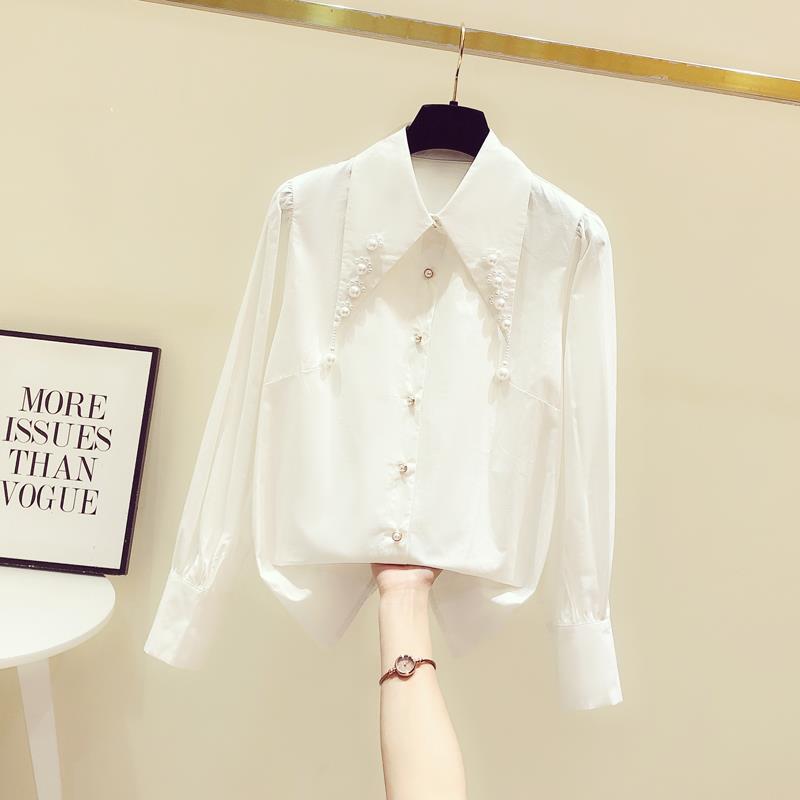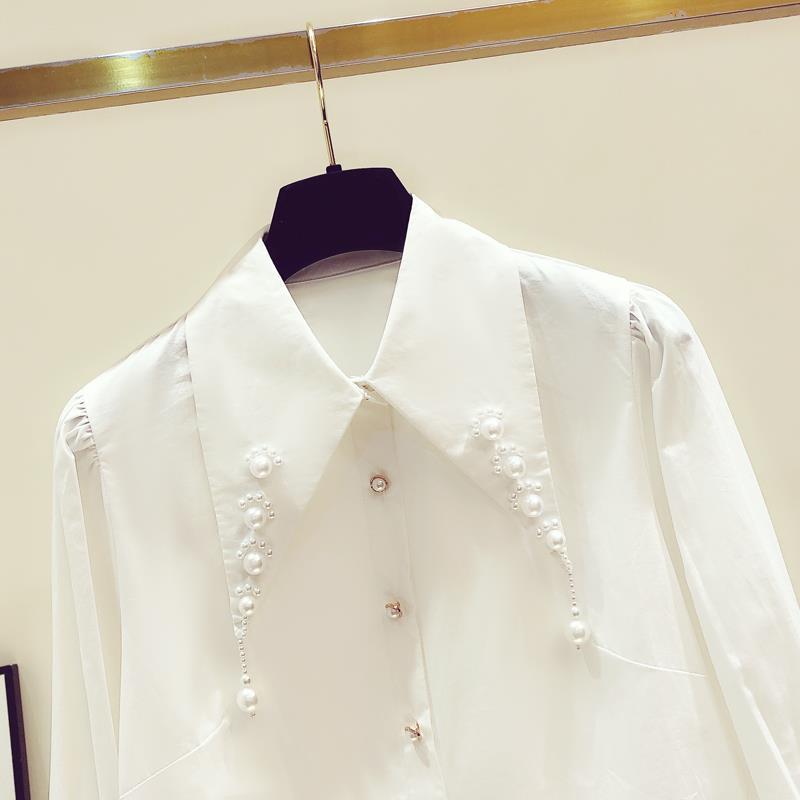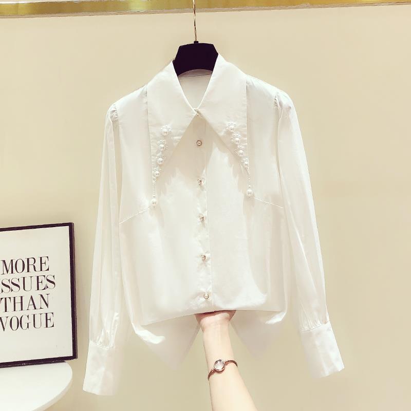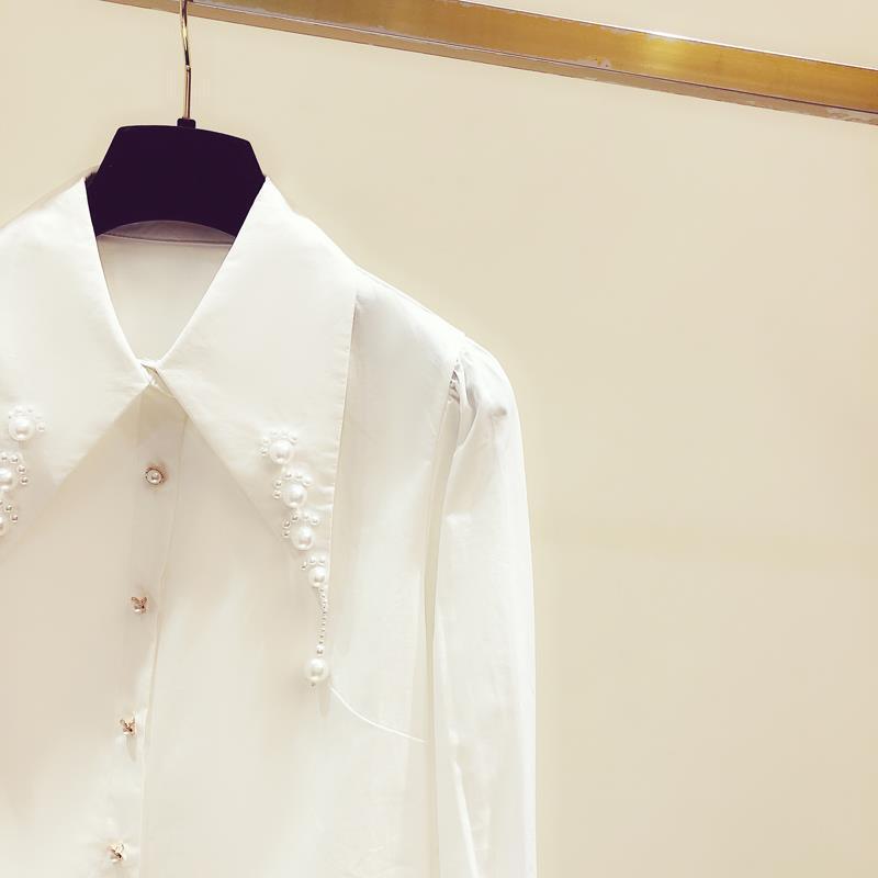디자인 구슬 흰색 셔츠 여성의 이른 봄 새로운 프랑스 스타일 우아한 진주 포인트 칼라 긴 소매 셔츠 탑
