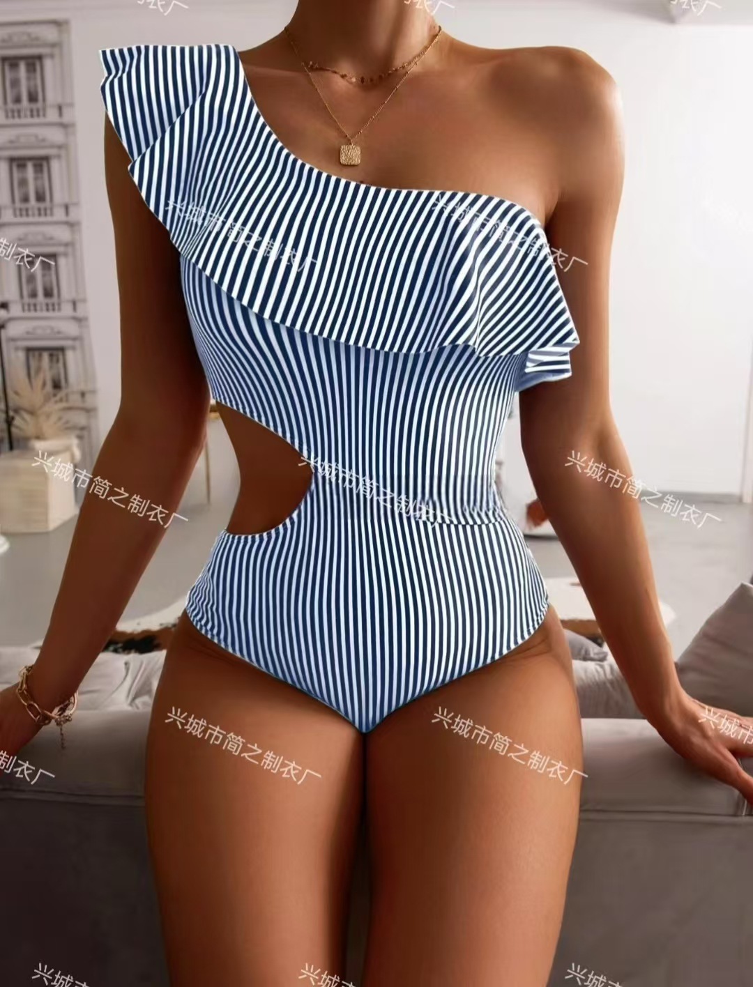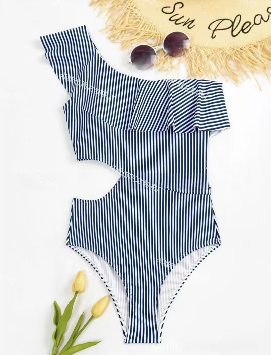 비키니 AliExpress 연꽃 잎 수영복을위한 원피스 수영복 새로운 블루 스트라이프 프린트 비키니 크로스 테두리스토어 가기
