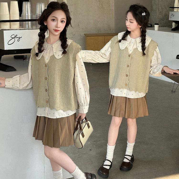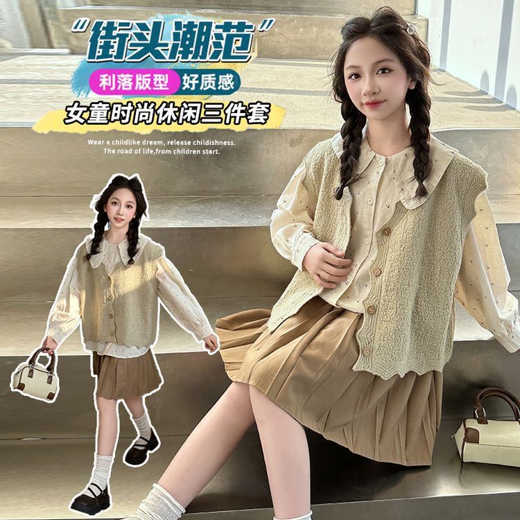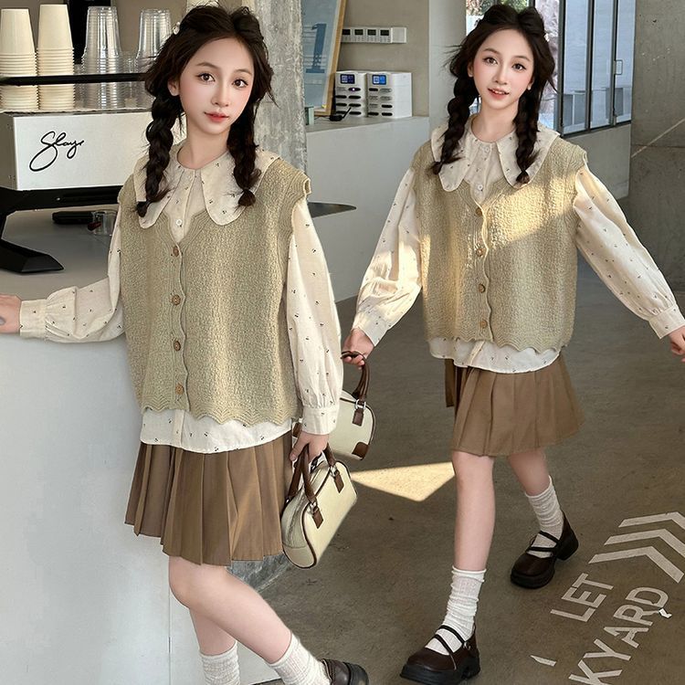 여자 스웨터 조끼 세트 2025 새로운 여자 유행 니트웨어 어린이 가을 캐주얼 투피스 유행