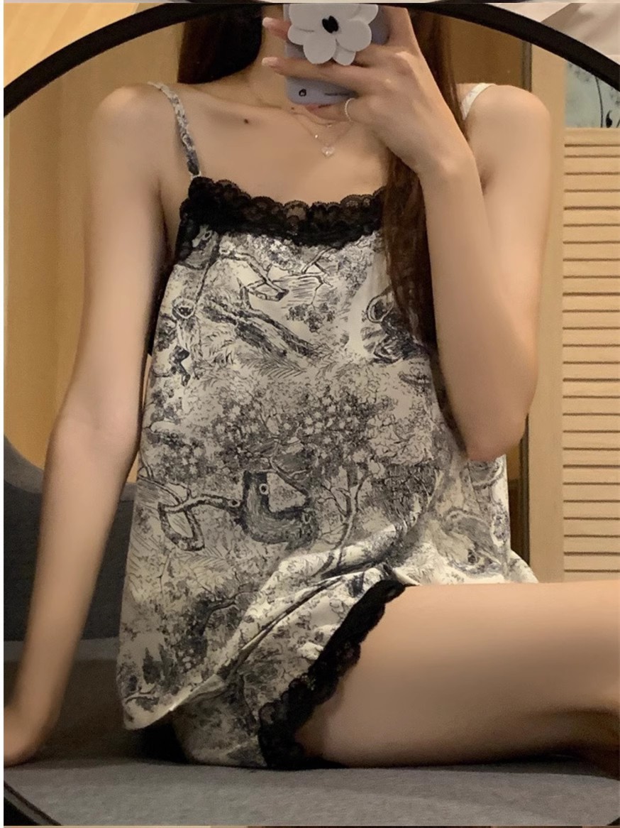 세트 두 조각 순수 아이스 실크 파자마 여성의 여름 소녀 홈 옷 반바지 슬링 아름다운 다시 잉크 그림 파자마 여성