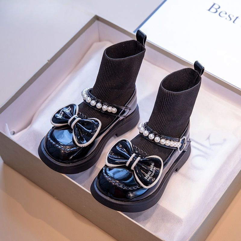 소녀 작은 가죽 신발 2025 가을 새로운 도착 중 및 대형 어린이 소녀 부드러운 하단 짧은 부츠 검은 미끄럼 부츠 공주 양말