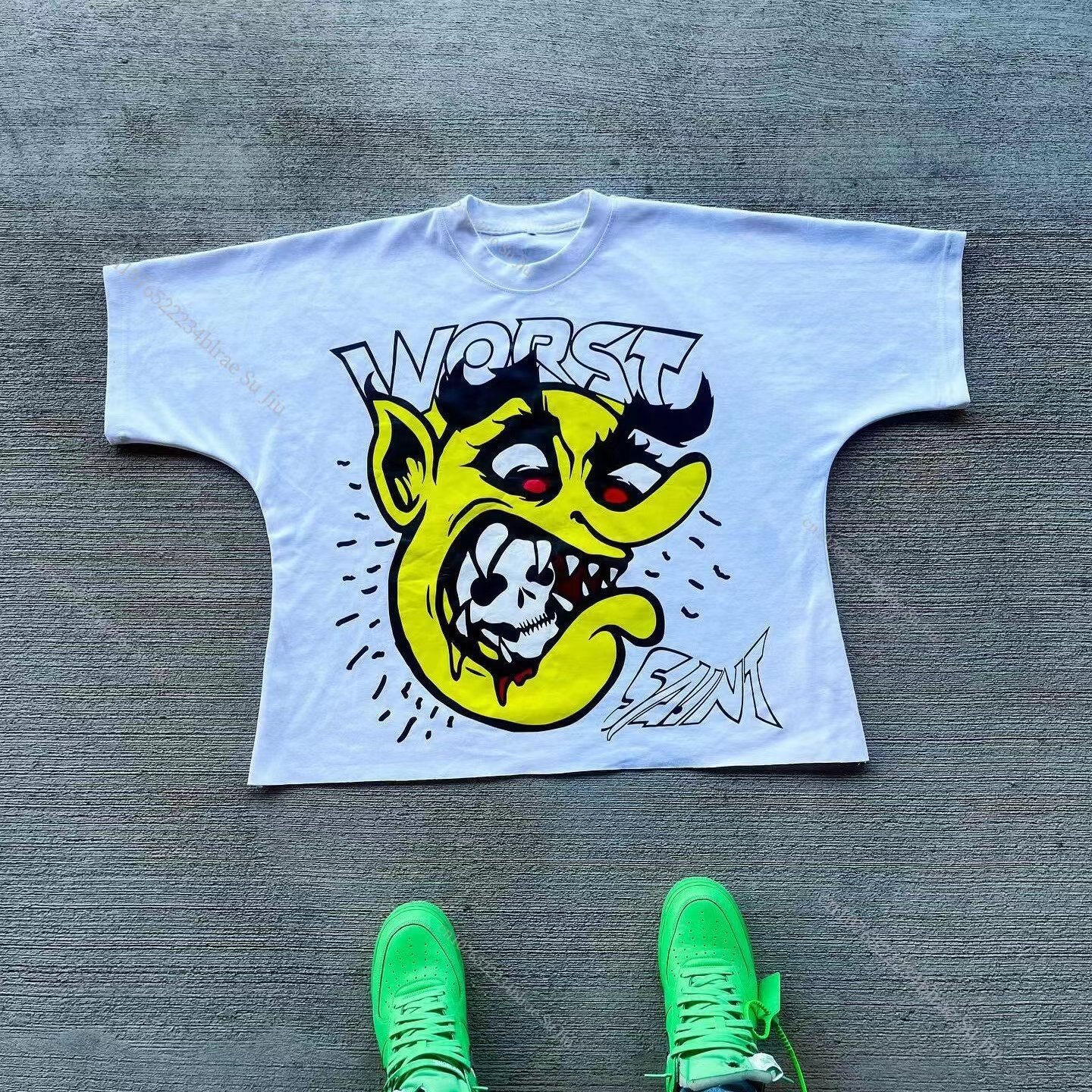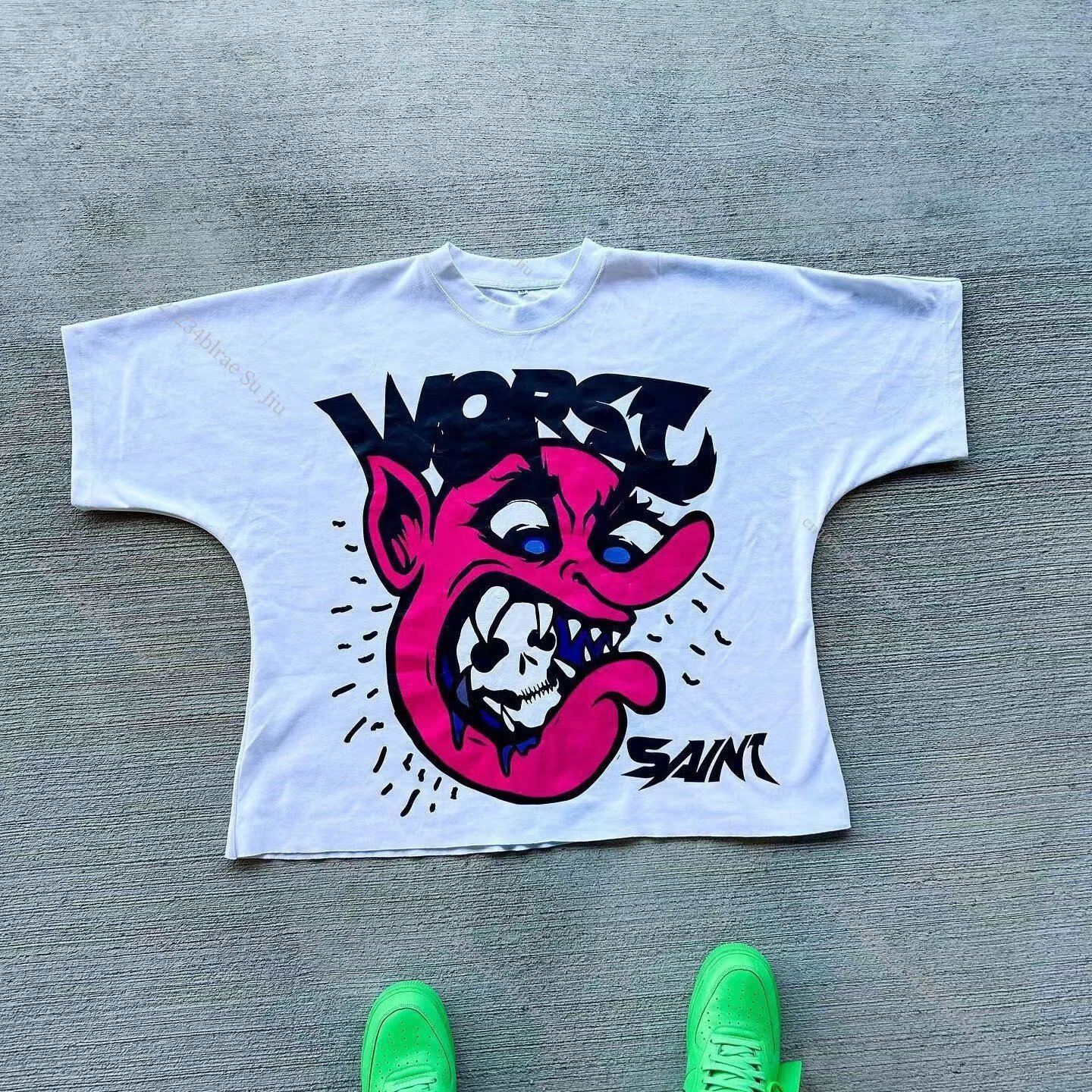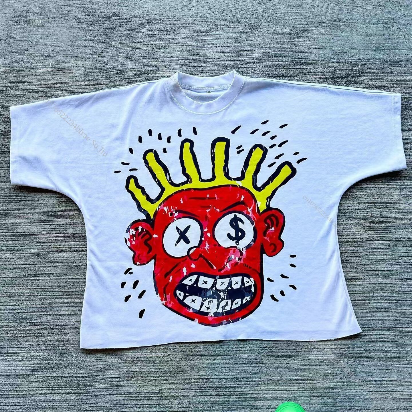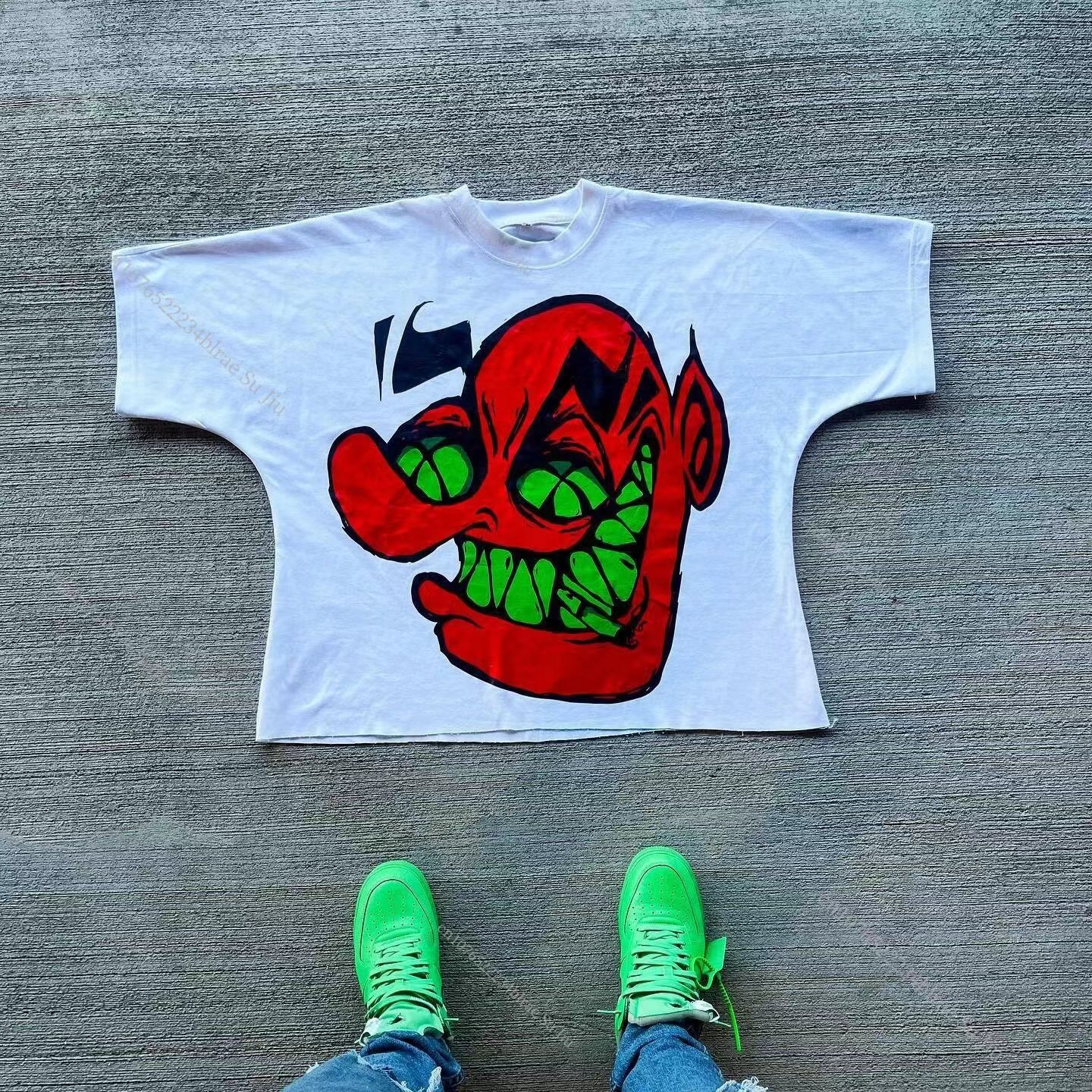 티셔츠 kd는 작은 악마 낙서 힙합 인쇄 거리 반팔 티셔츠 남성 여성 여름 복고풍 느슨한