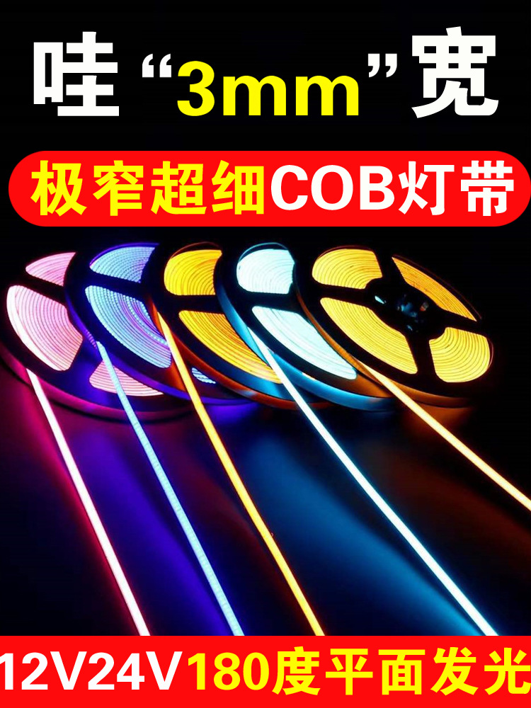 • 3m 24V 평면 180도 발광 COB 조명 스트립 - 3mm 너비, 자체 접착식 뒷면✰★