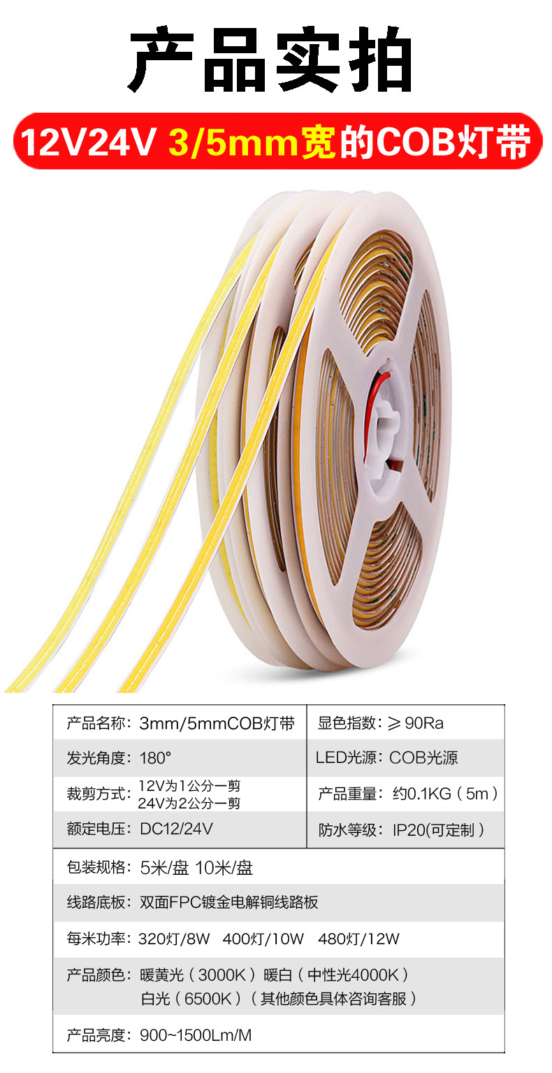 • 5m 12V 평면 180도 발광 COB 조명 스트립 - 폭 3mm, 자체 접착식 뒷면✰★