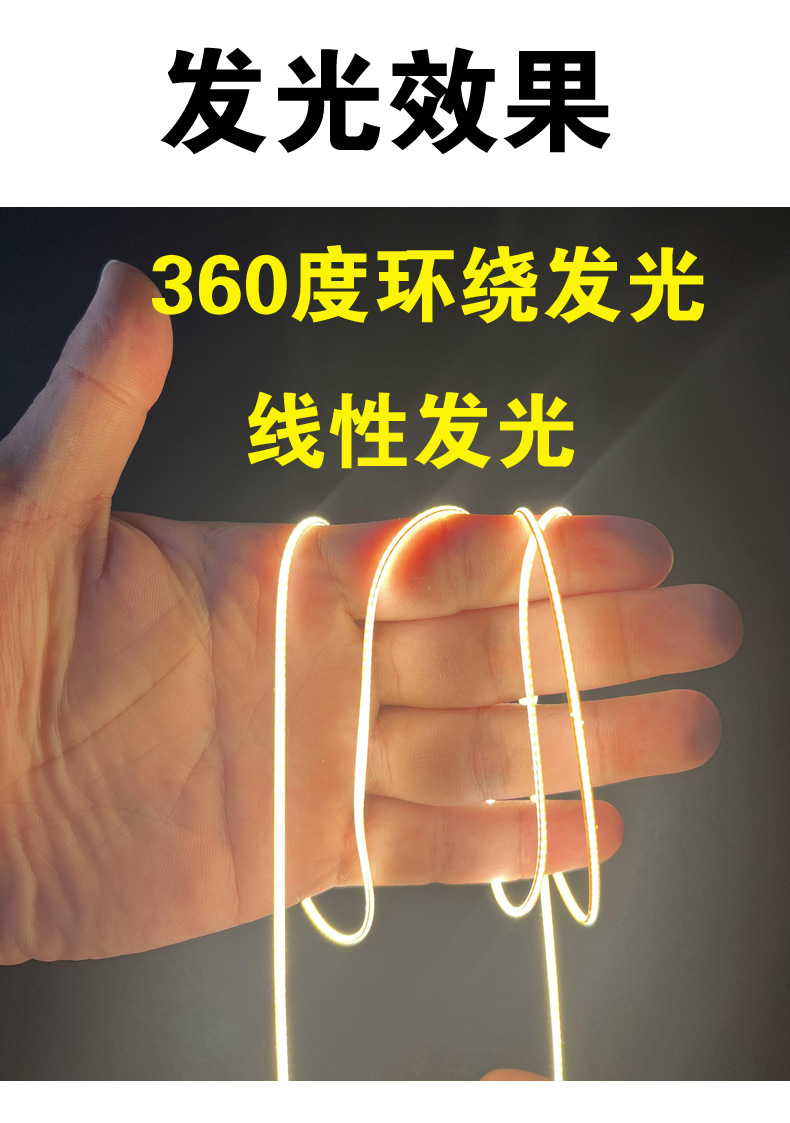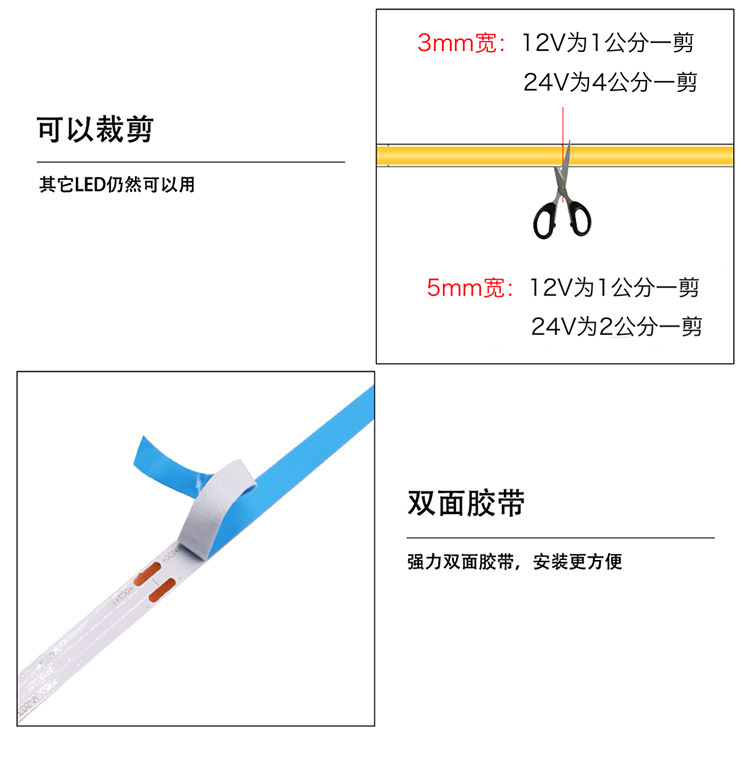 • 2m 12V 평면 180도 발광 COB 조명 스트립 - 폭 3mm, 자체 접착식 뒷면✰★