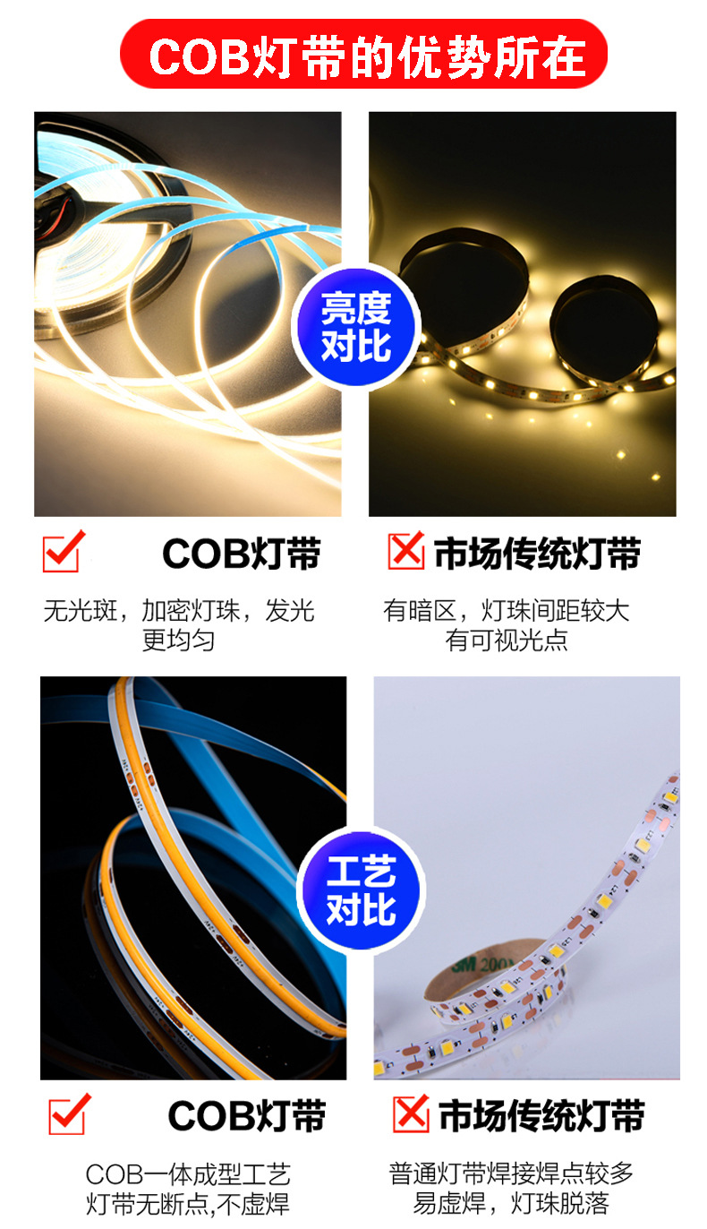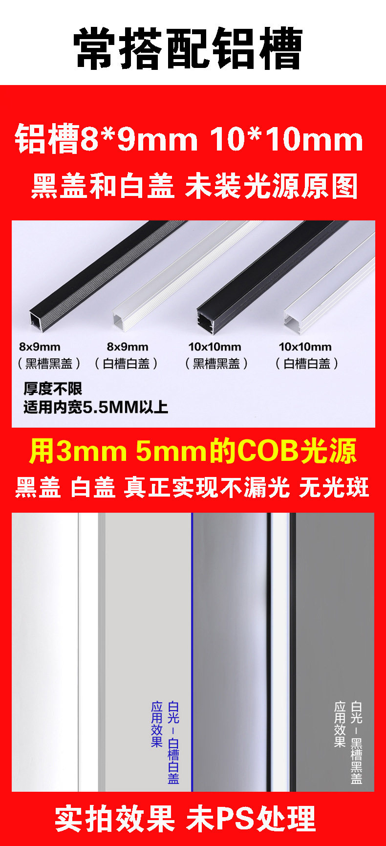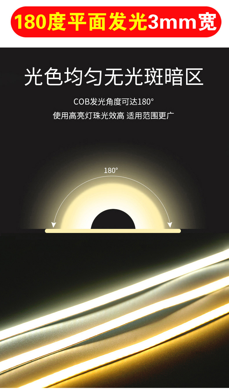 • 1m 12V 평면 180도 발광 COB 조명 스트립 - 폭 3mm, 자체 접착식 뒷면✰★