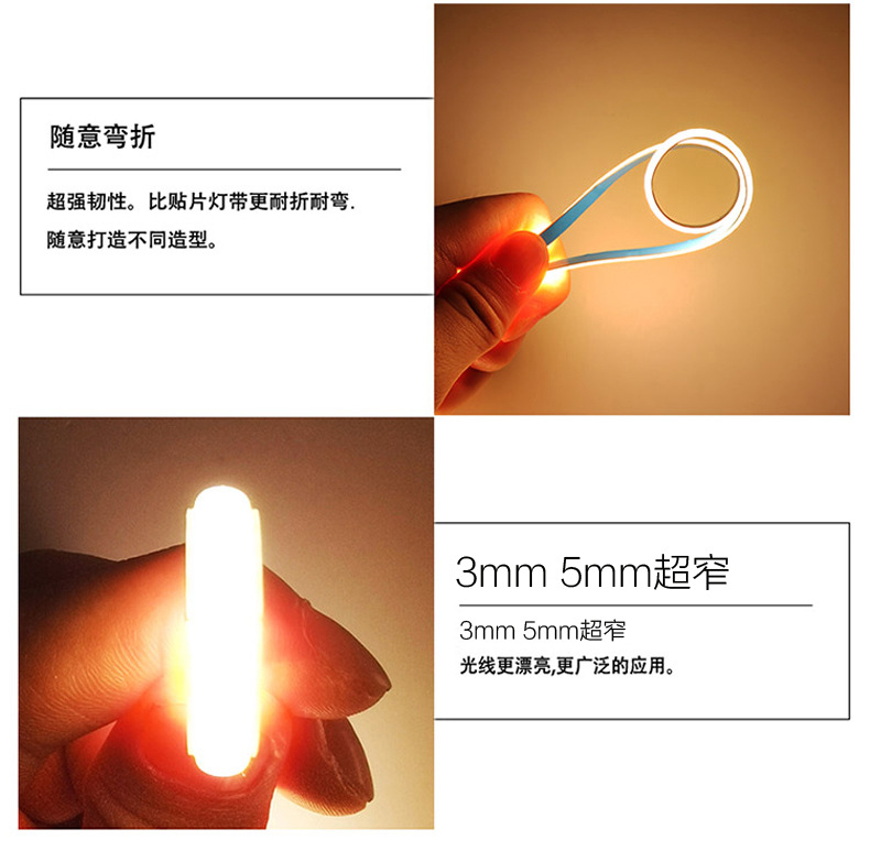 • 1m 5V-USB 케이블 3㎜넓은 cob 조명 스트립 400 조명/미터 평면 180 조명✰★