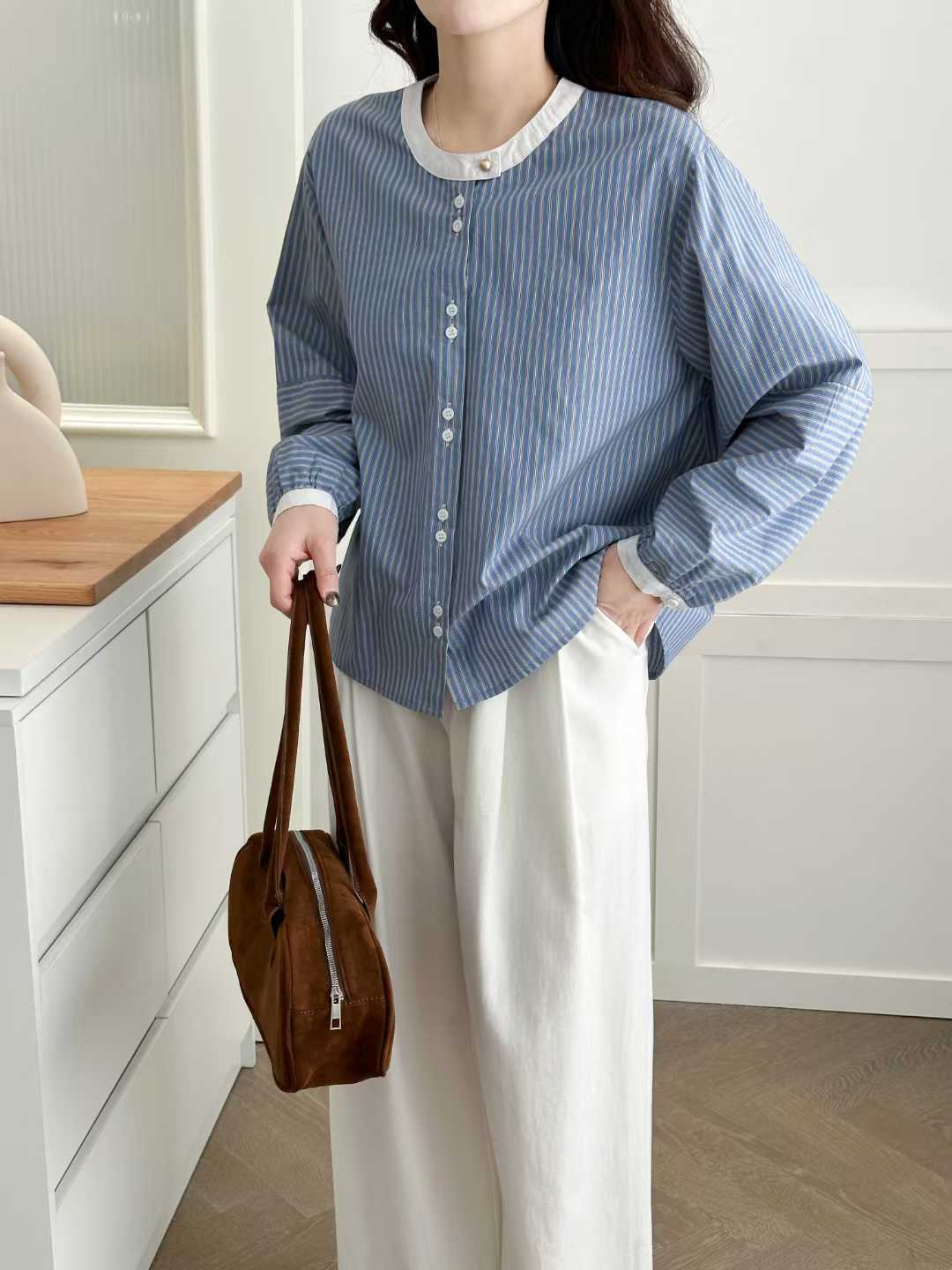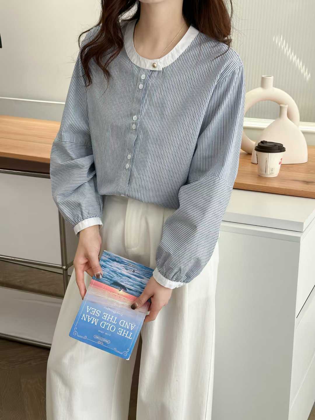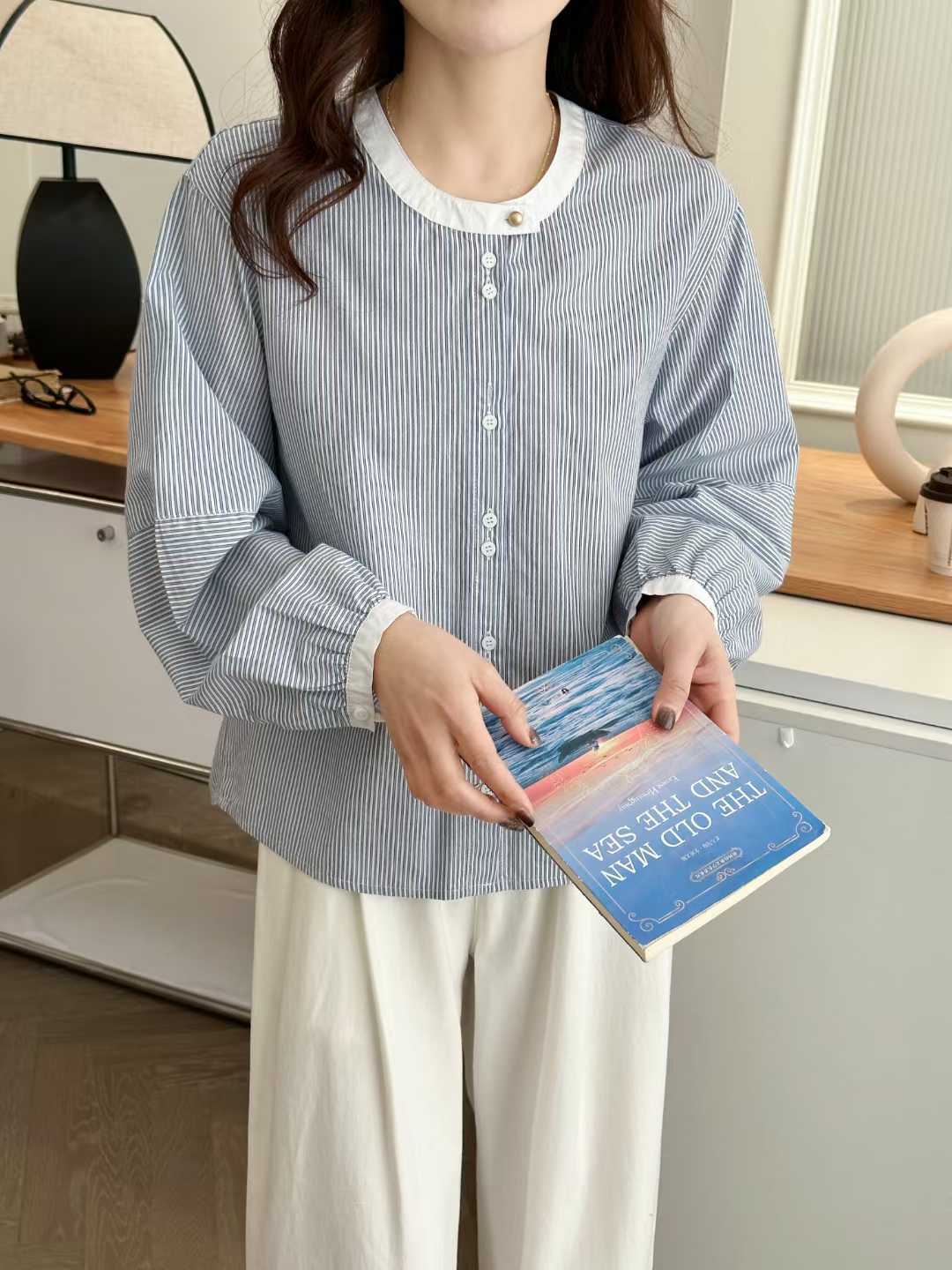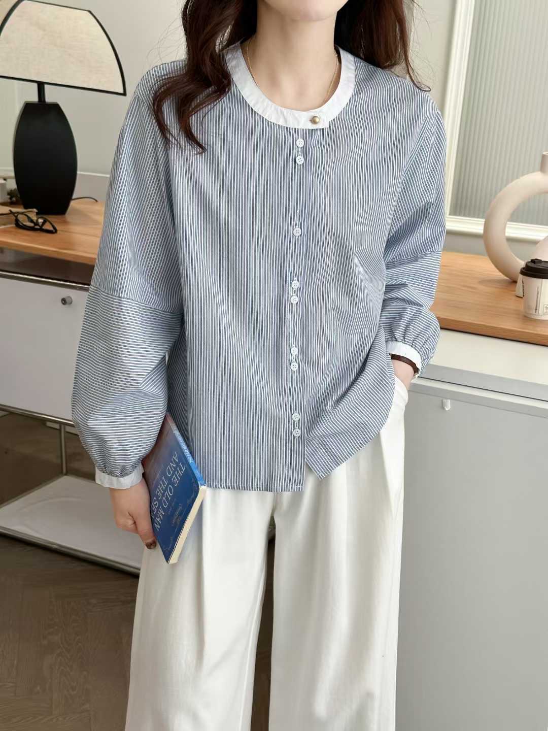 2025 봄 새로운 줄무늬 인쇄 둥근 목 느슨한 숙녀 작은 카디건 탑 셔츠 도매스토어 가기