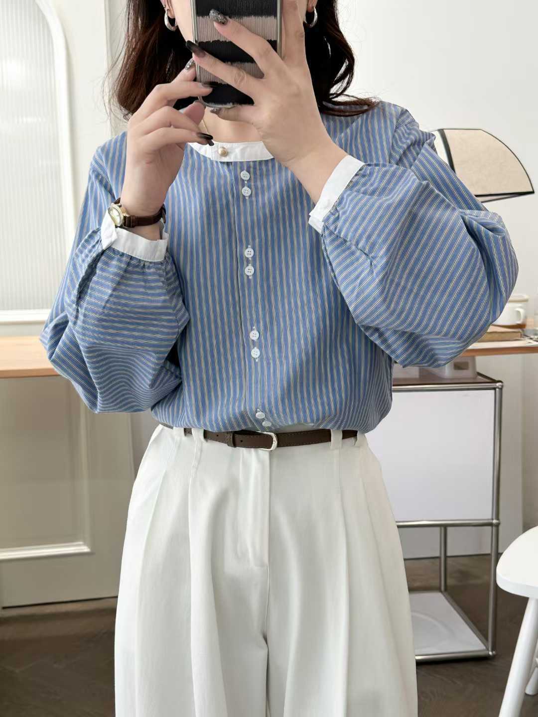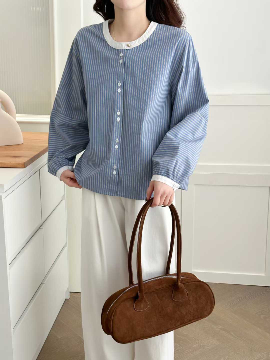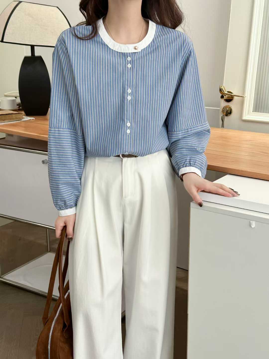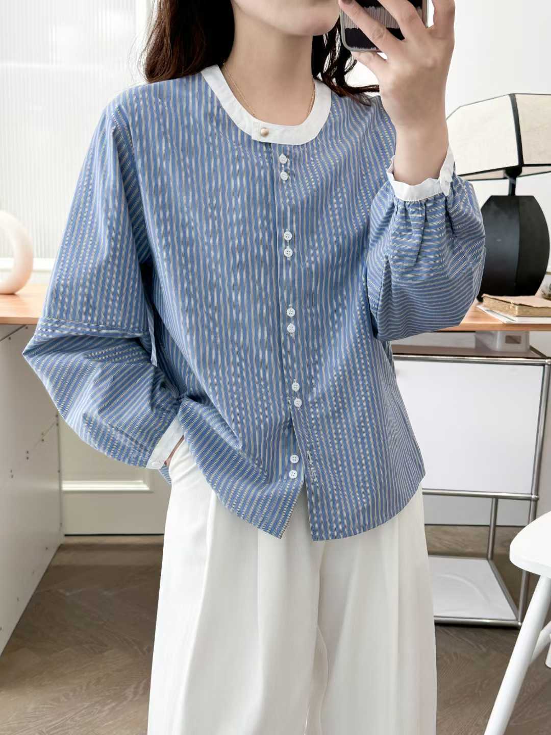 2025 봄 새로운 줄무늬 인쇄 둥근 목 느슨한 숙녀 작은 카디건 탑 셔츠 도매스토어 가기