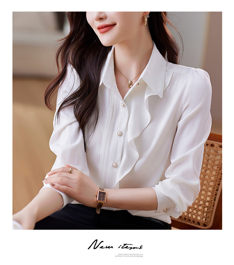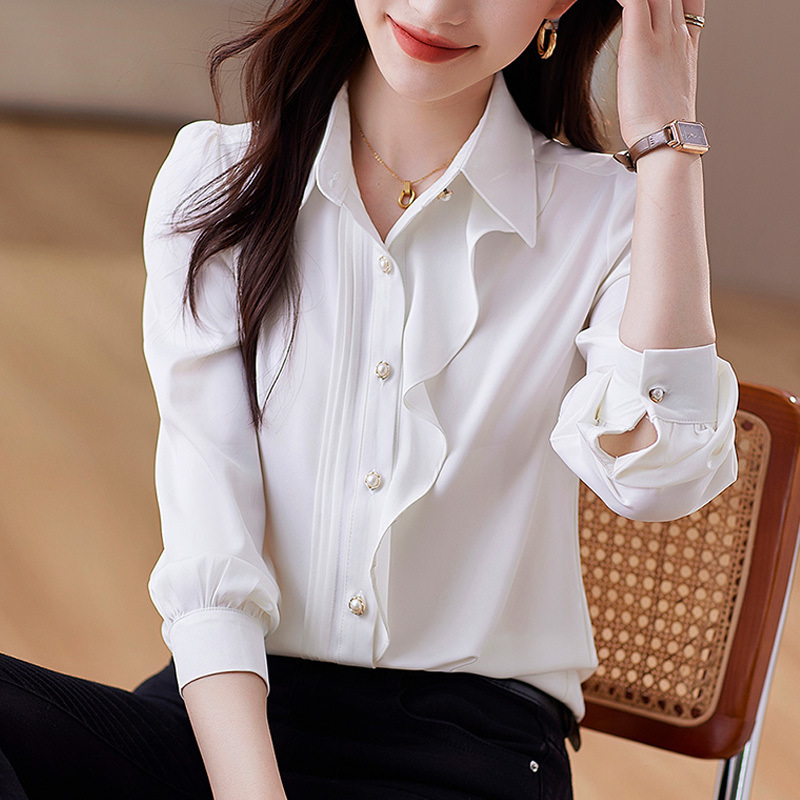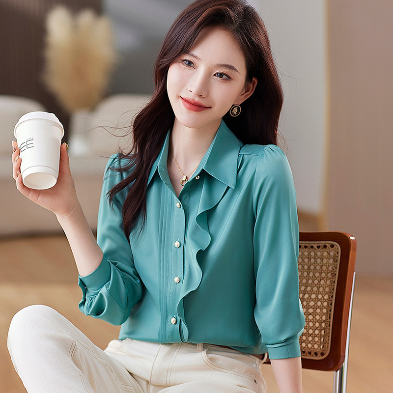 모조 실크 주름진 단색 우아한 셔츠 여성용 긴팔 2024 봄과 가을 새로운 세련된 패셔블 캐주얼 탑 여성