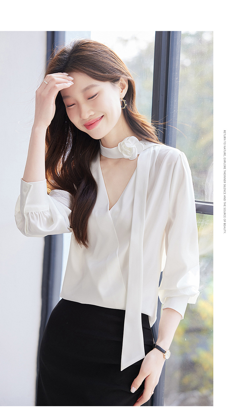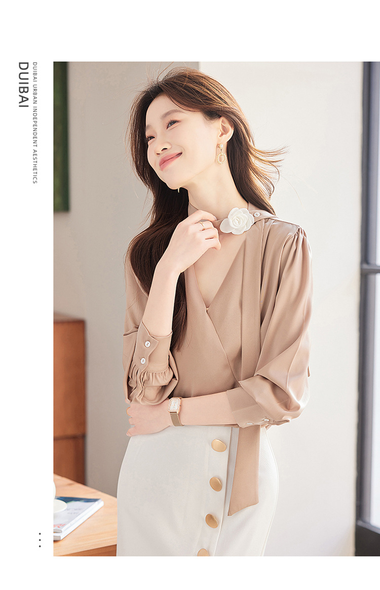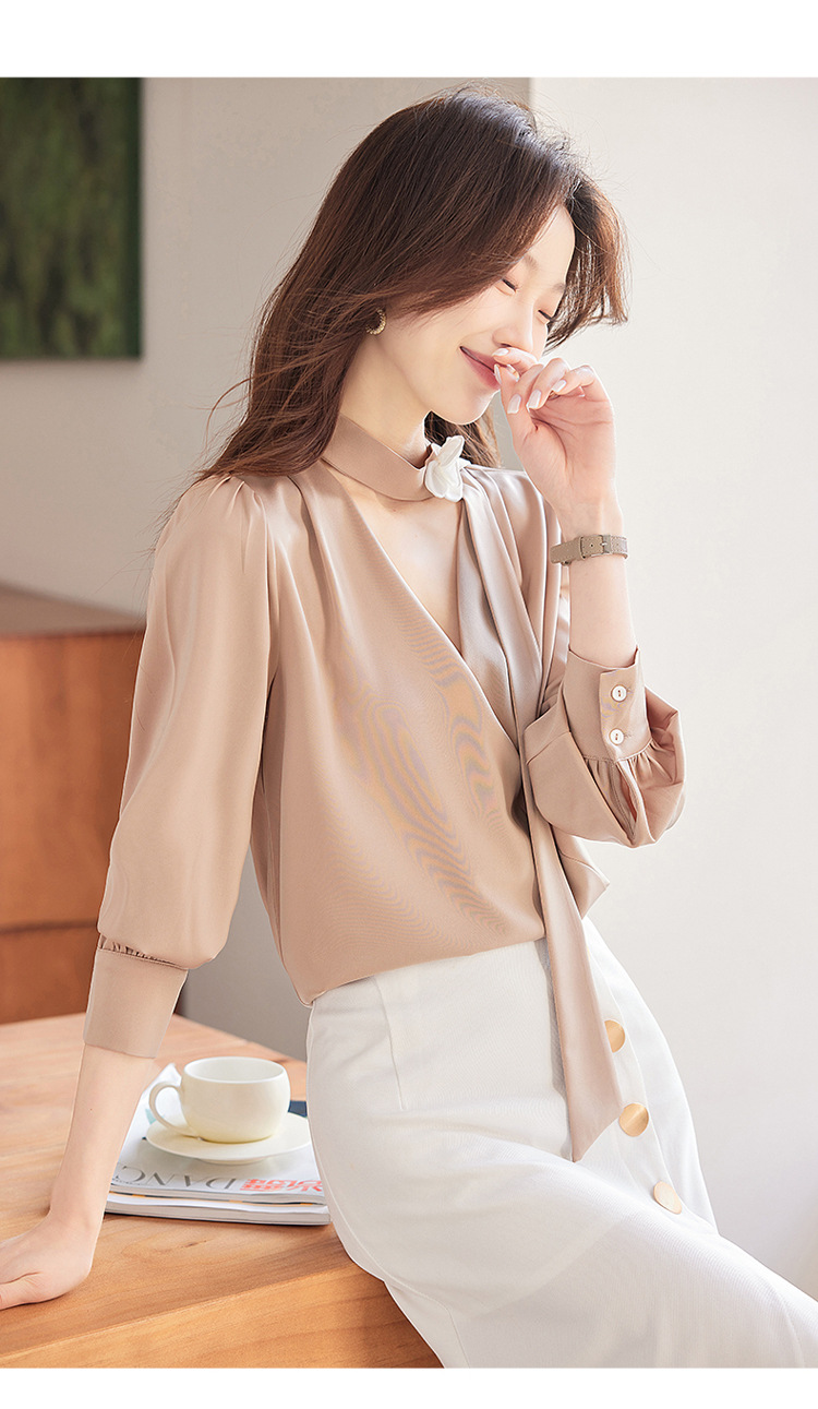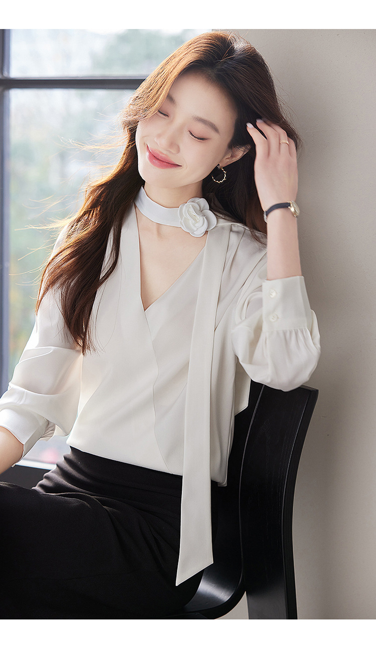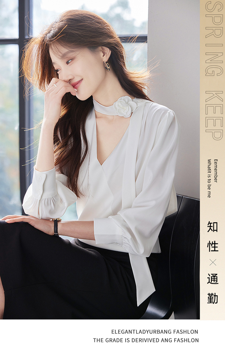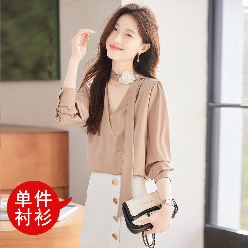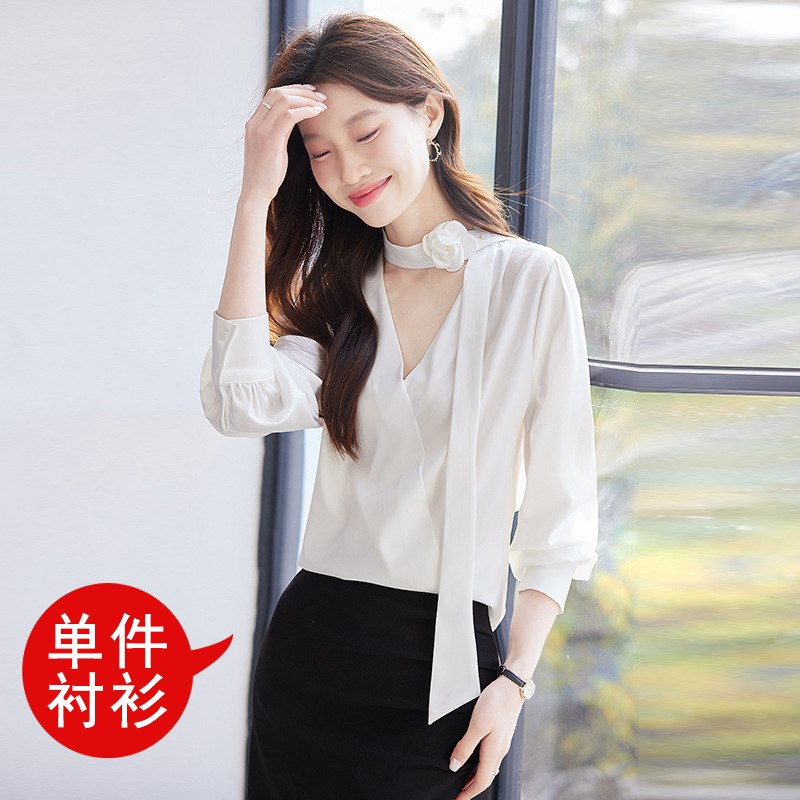 V-Neck 셔츠 여성 프로페셔널 착용 2025 초봄과 가을 러플 스트랩 에이지 감소 프랑스 하이 엔드 긴팔 쉬폰 셔츠스토어 가기