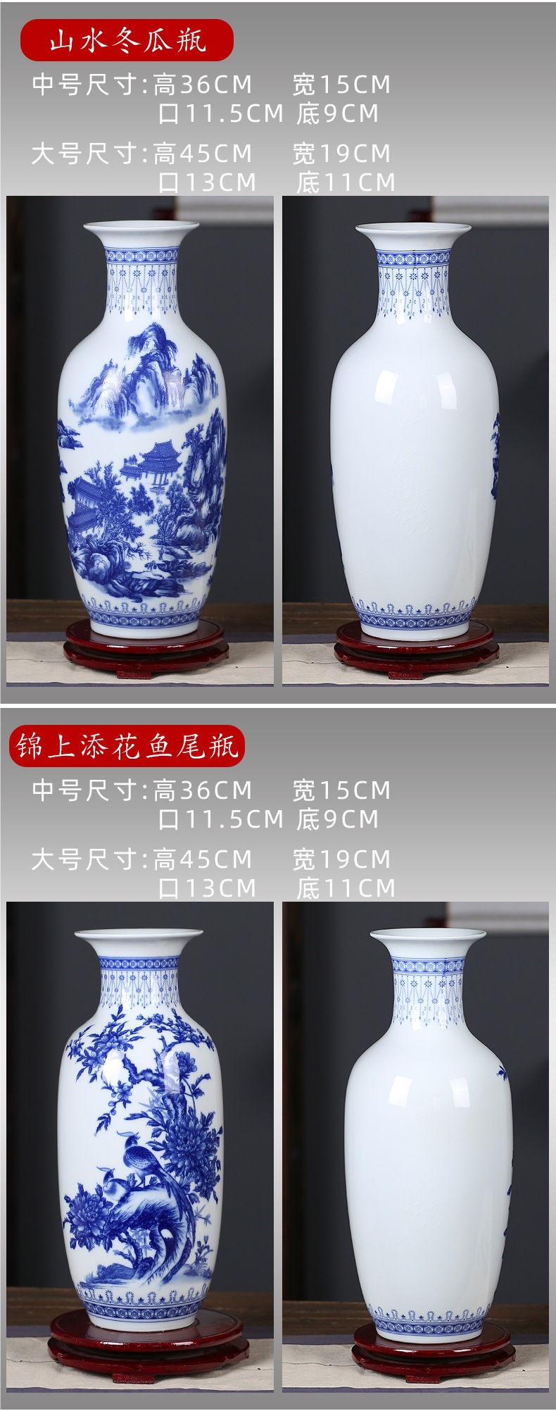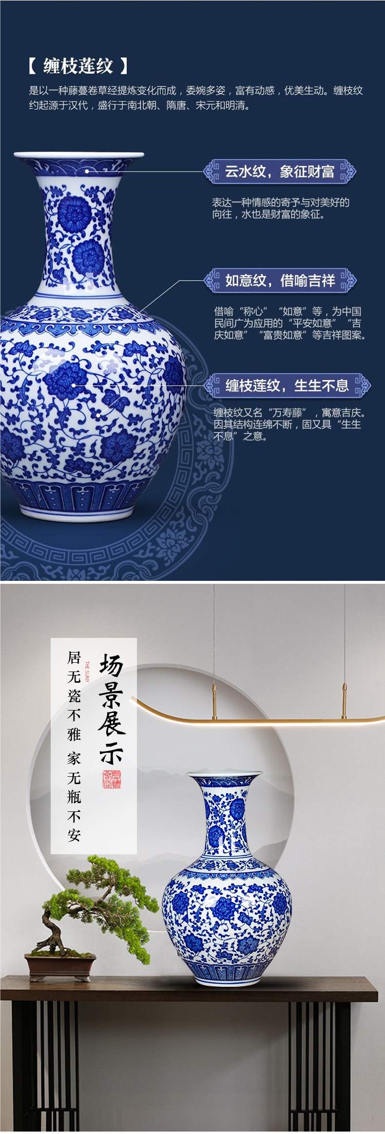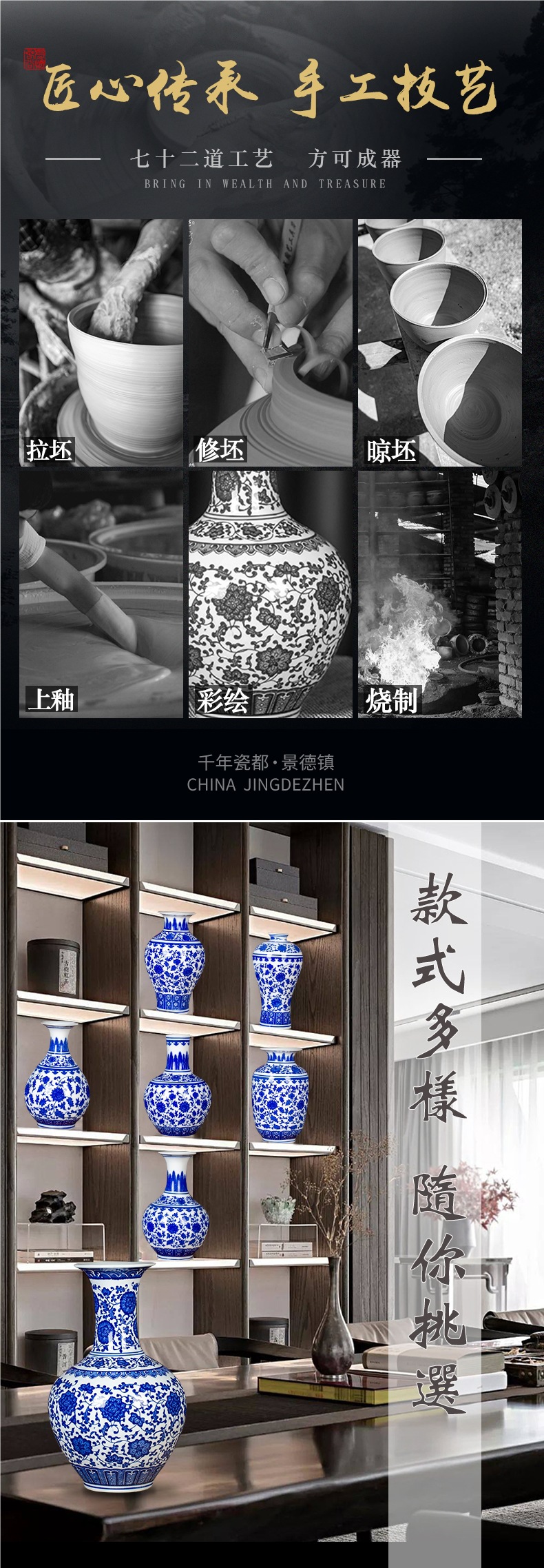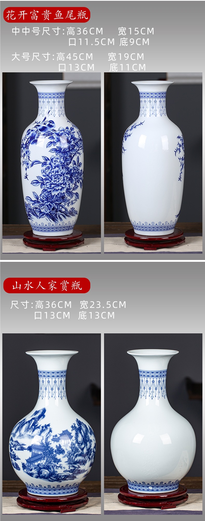 Jingdezhen 도자기 중국 스타일 파란색과 흰색 도자기 꽃병 거실 풍부한 대나무 입구 꽃 장식품