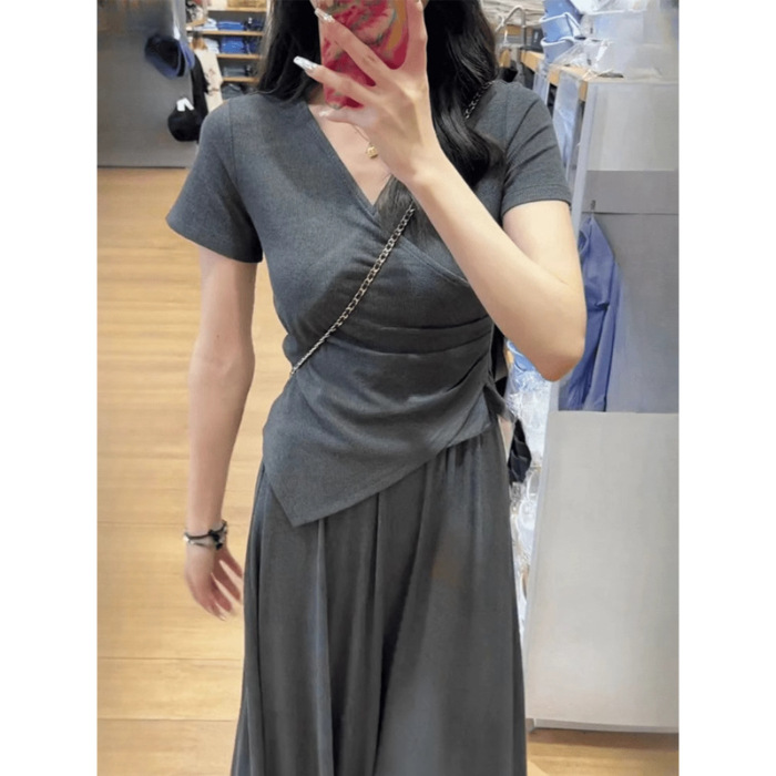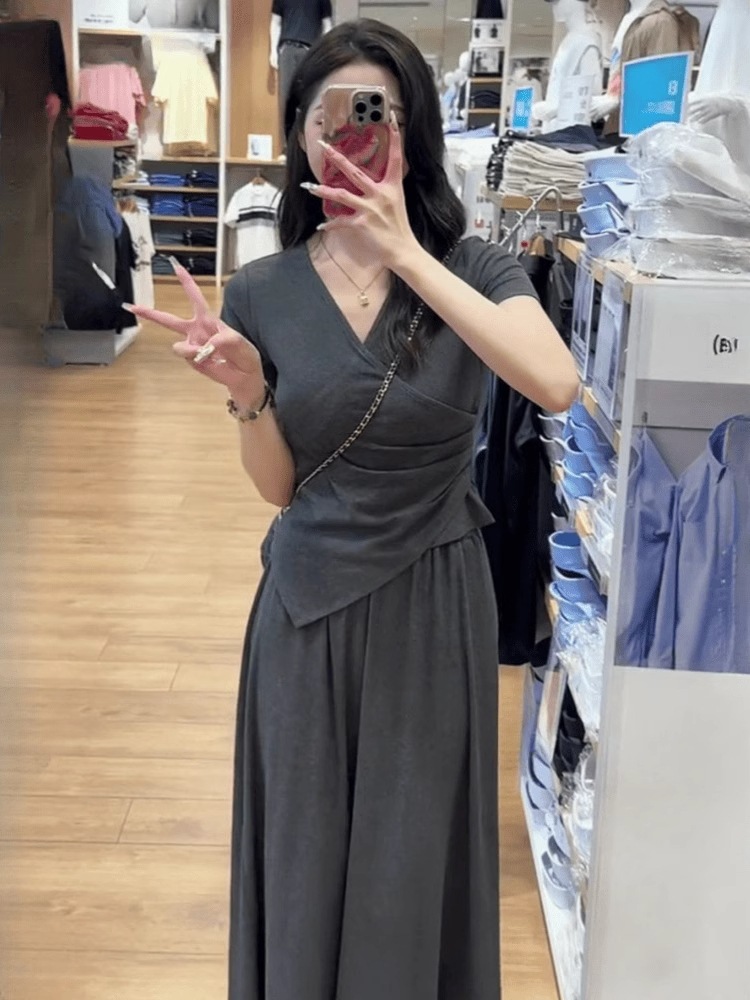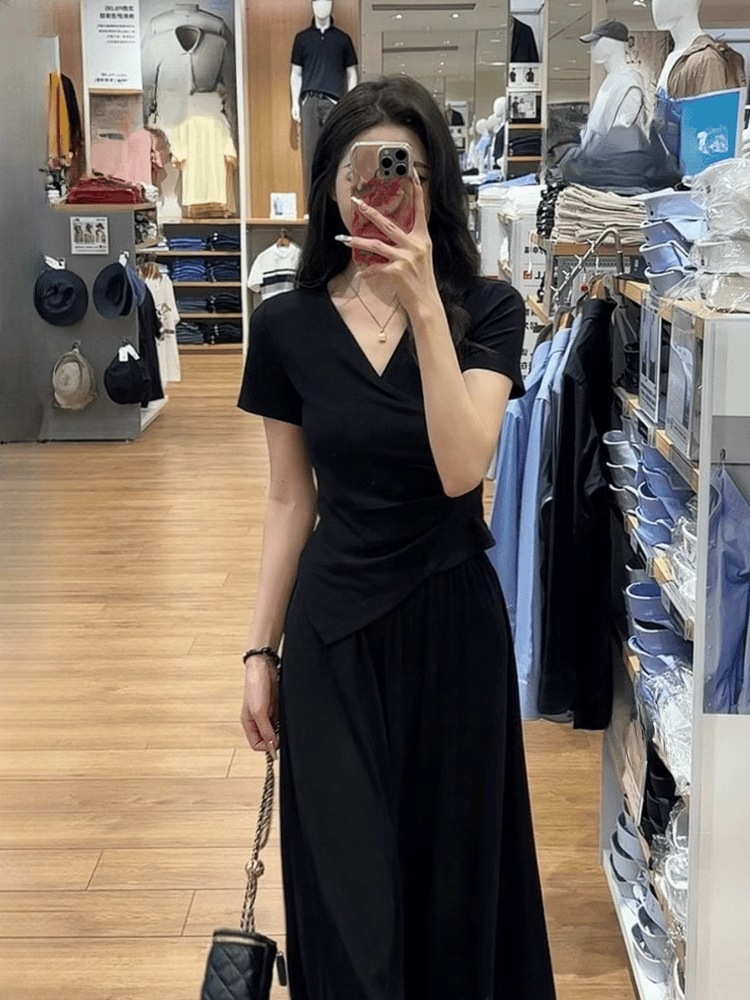 프랑스 하이 엔드 캐주얼 세트 2025 여름 새로운 슬림 핏 슬리밍 육체로 덮인 반팔 탑 스커트 투피스 세트