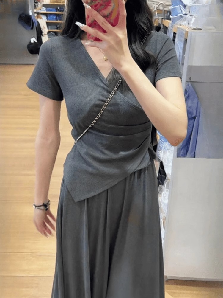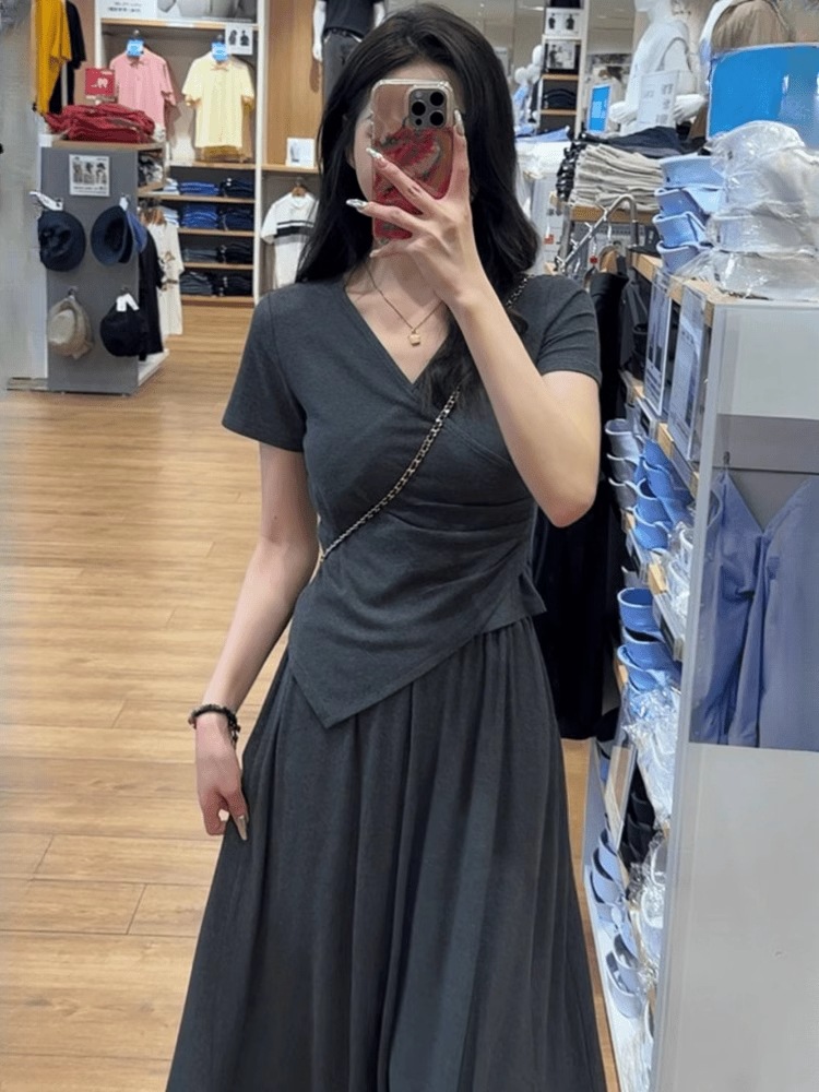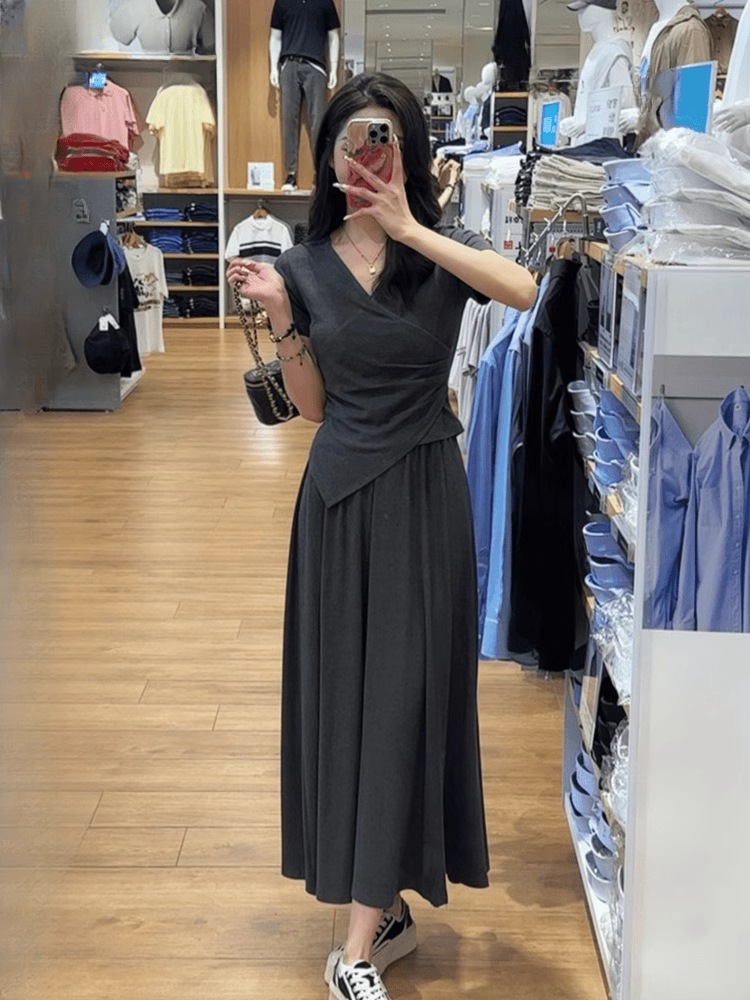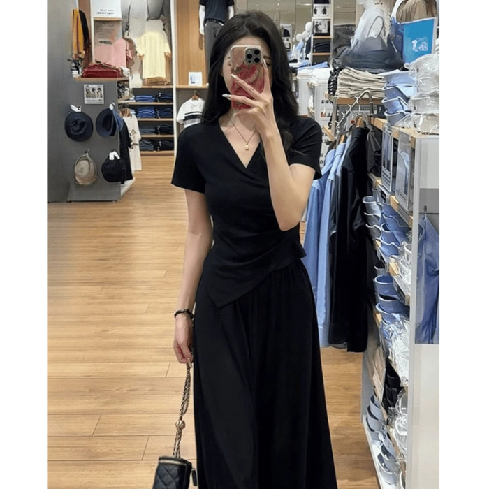 프랑스 하이 엔드 캐주얼 세트 2025 여름 새로운 슬림 핏 슬리밍 육체로 덮인 반팔 탑 스커트 투피스 세트스토어 가기