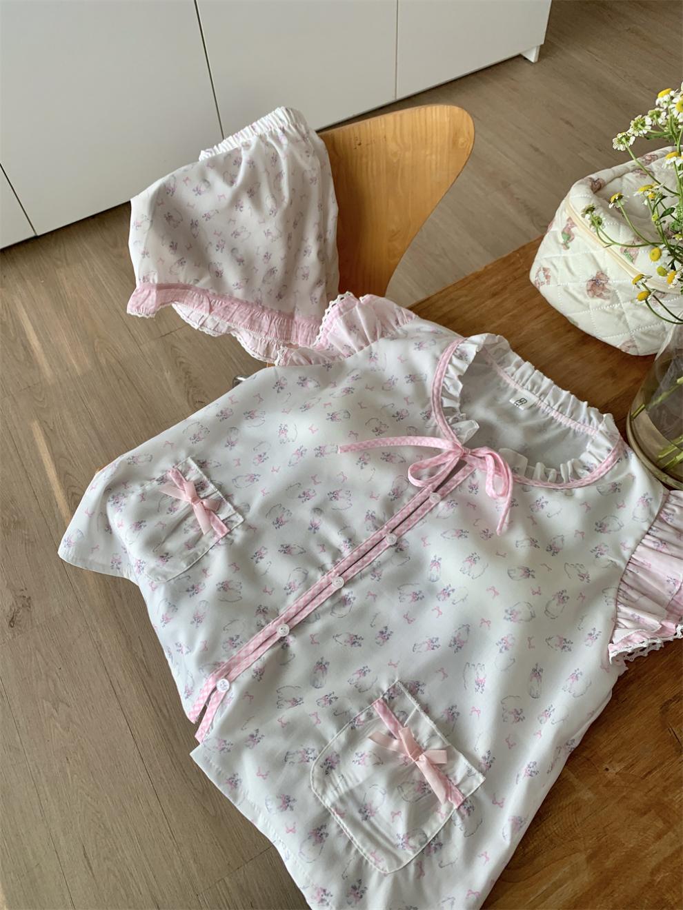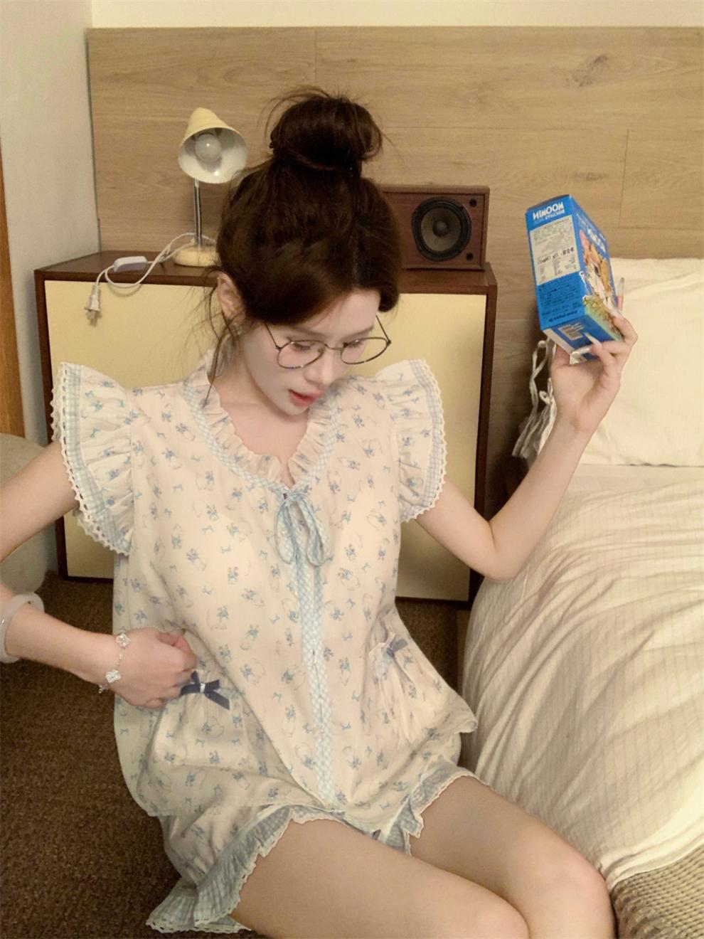 한국, 여성 새 도착 한국 스타일 스위트 캐리 레이스 여름 플라잉 슬리브 반바지 파자마 홈 의류 여성