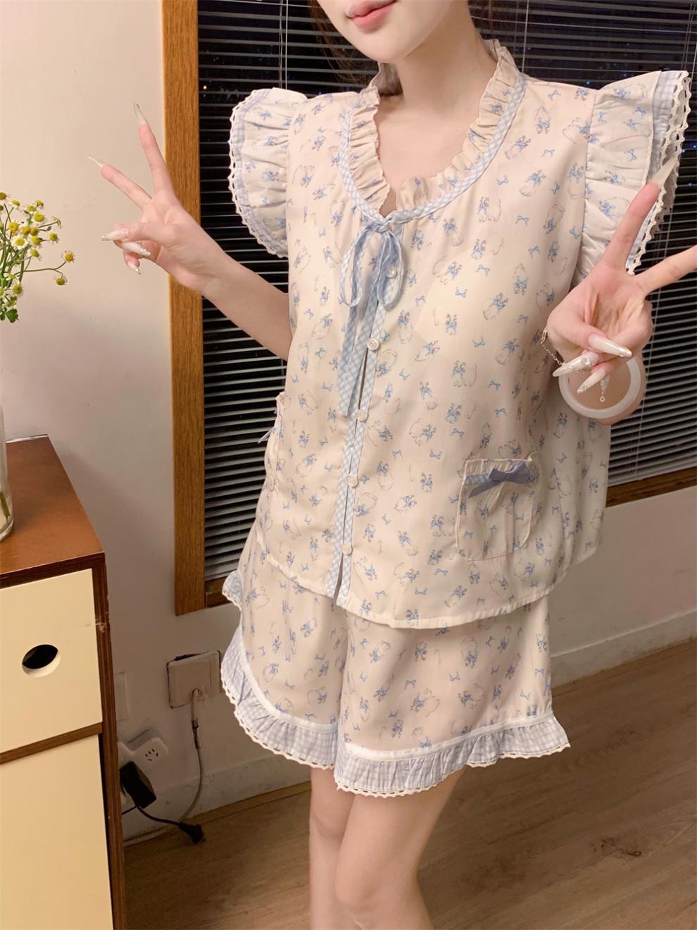 한국, 여성 새 도착 한국 스타일 스위트 캐리 레이스 여름 플라잉 슬리브 반바지 파자마 홈 의류 여성스토어 가기