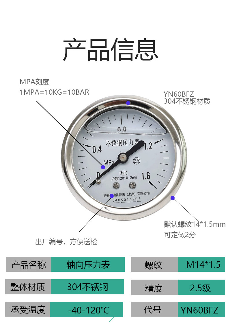 304 스테인레스 스틸 축 지진 압력 게이지 YN60BFZ 압력 게이지 수압 게이지 오일 압력 게이지 유압 압력 게이지 증기 게이지