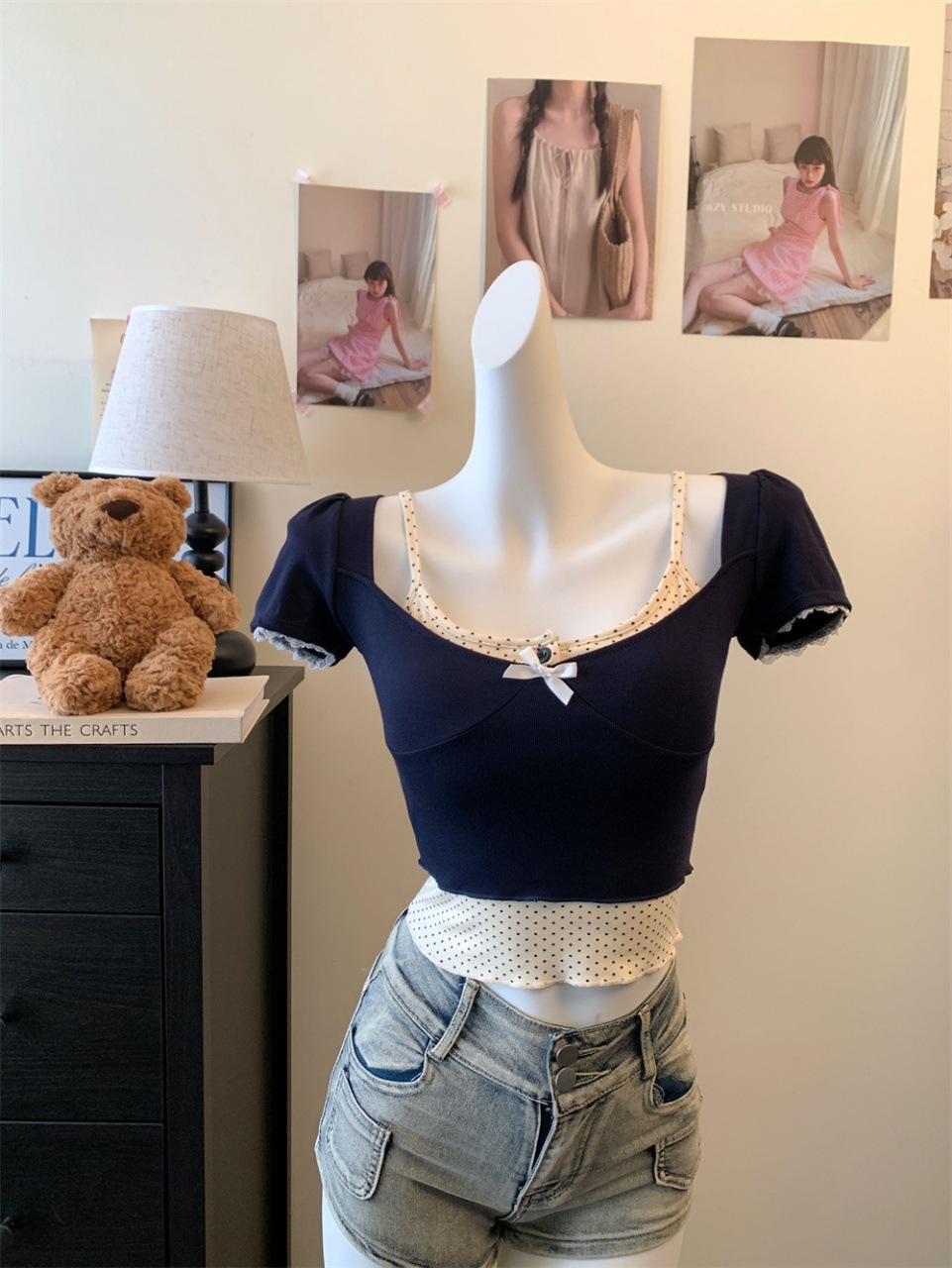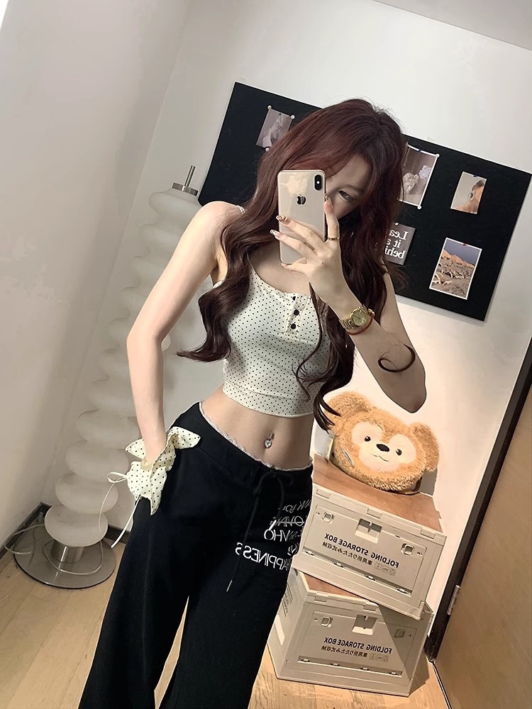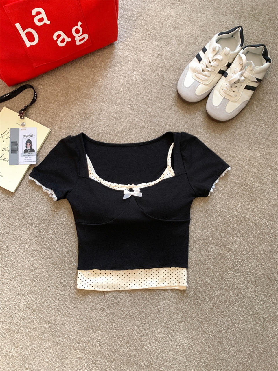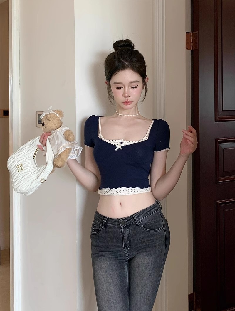 램 투피스 프랑스 스타일 Bm 도트 버클 스퀘어 칼라 버블 슬리브 달콤한 소녀 활 명암 슬림 핏 탑
