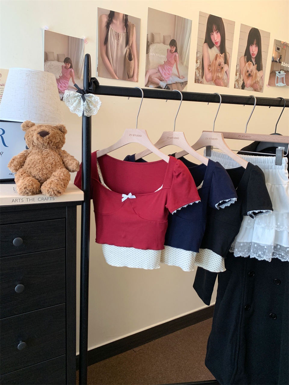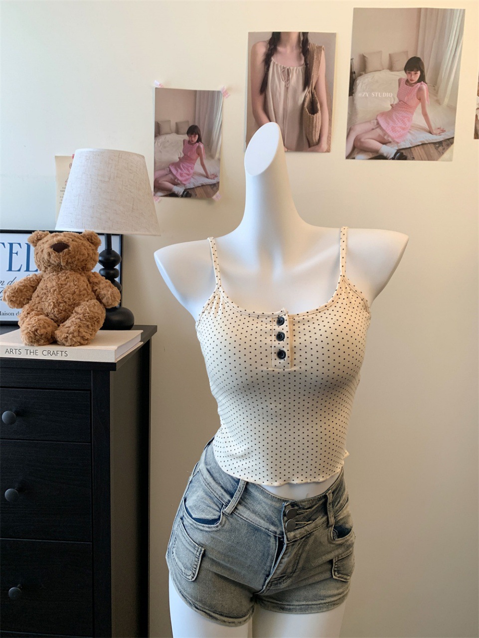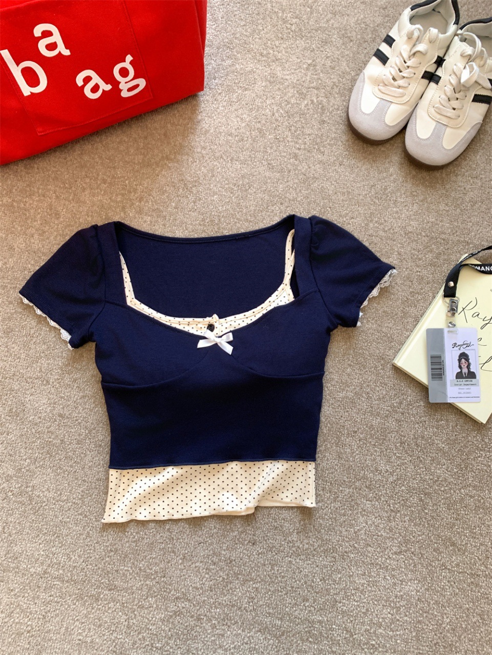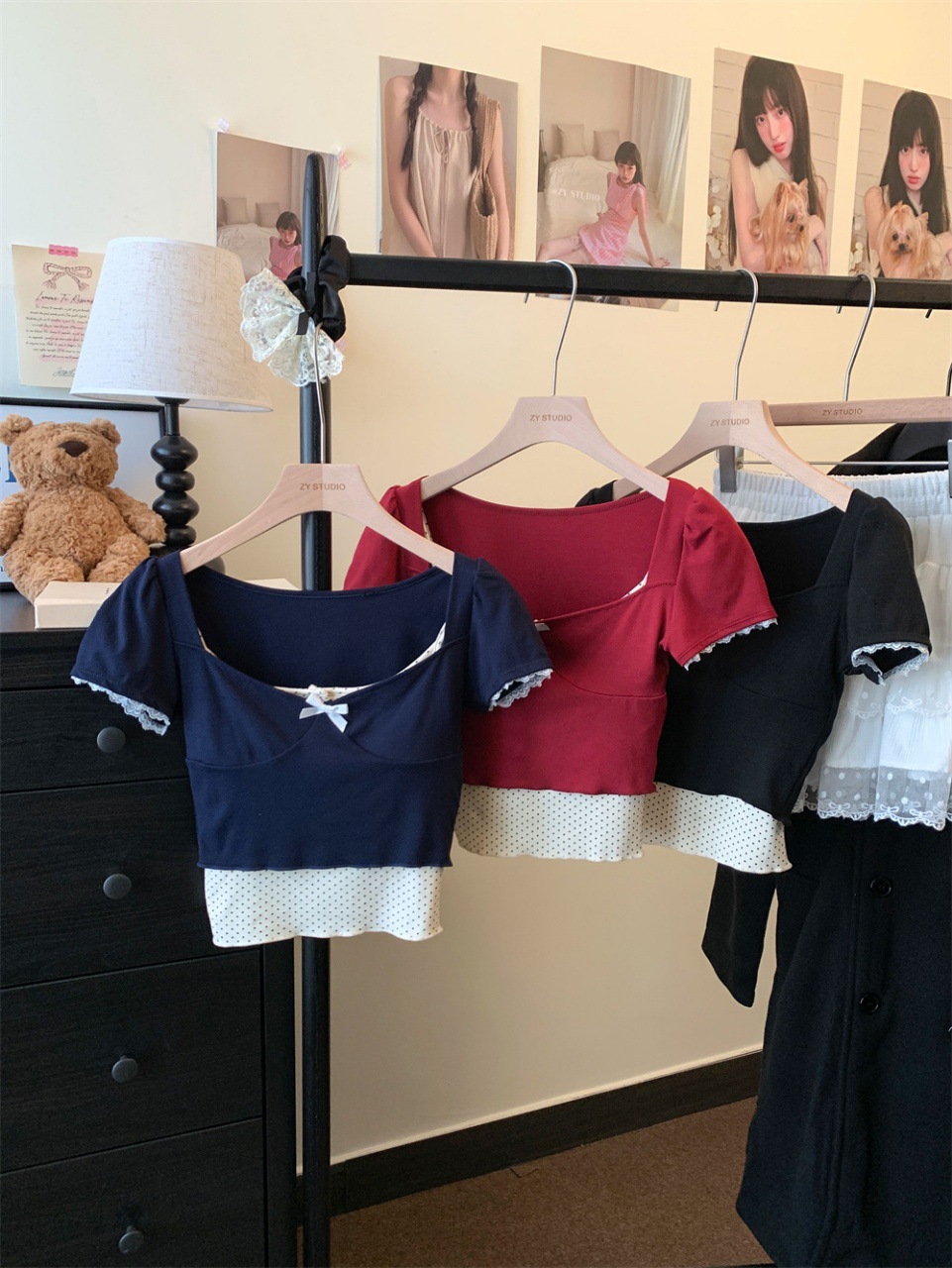 램 투피스 프랑스 스타일 Bm 도트 버클 스퀘어 칼라 버블 슬리브 달콤한 소녀 활 명암 슬림 핏 탑