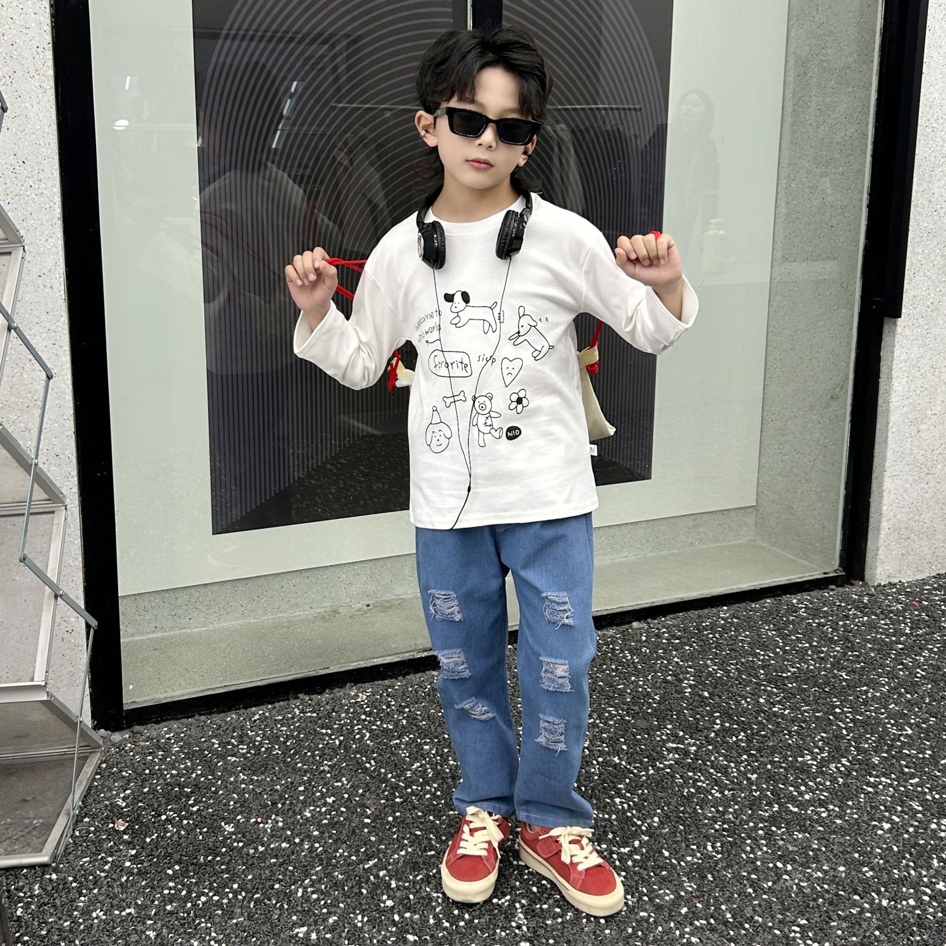 소년 세트 봄과 가을 어린이 2025 년 소년 코튼 쿨 핸디 미드 빅 어린이 크루 넥 긴 소매 청바지스토어 가기