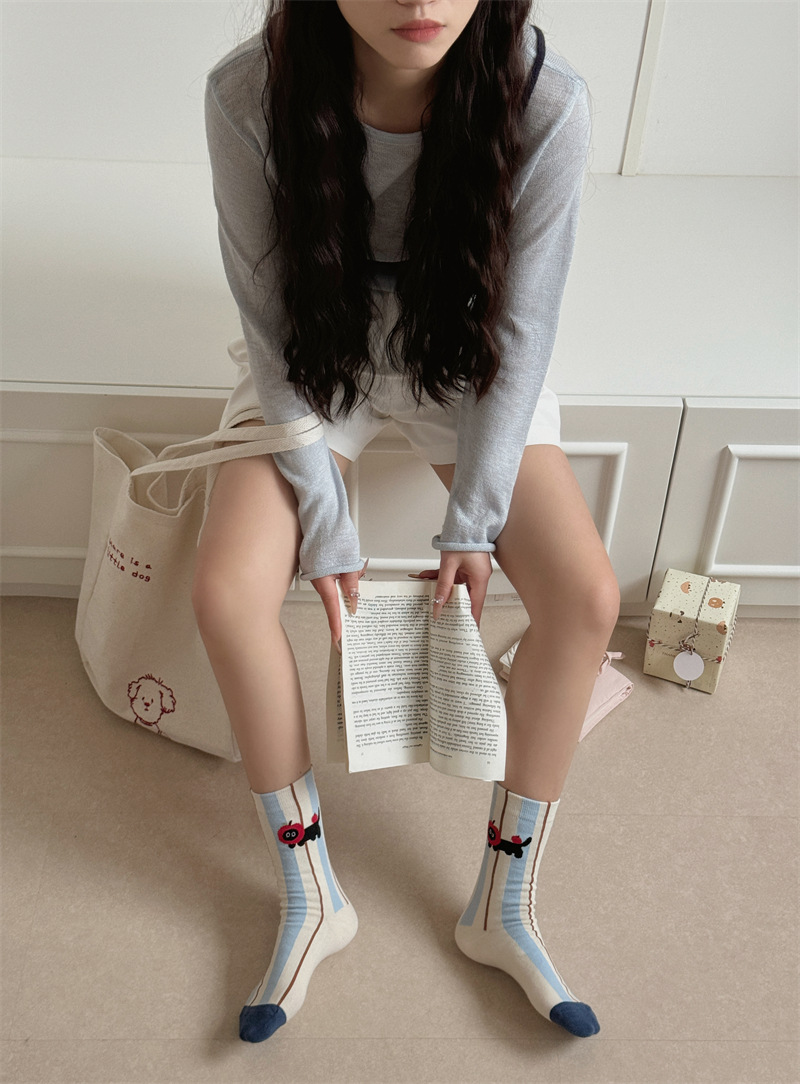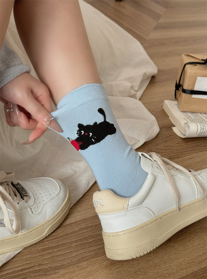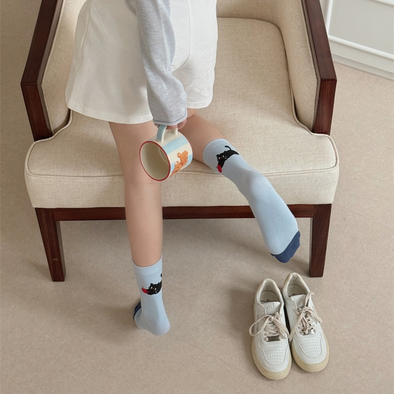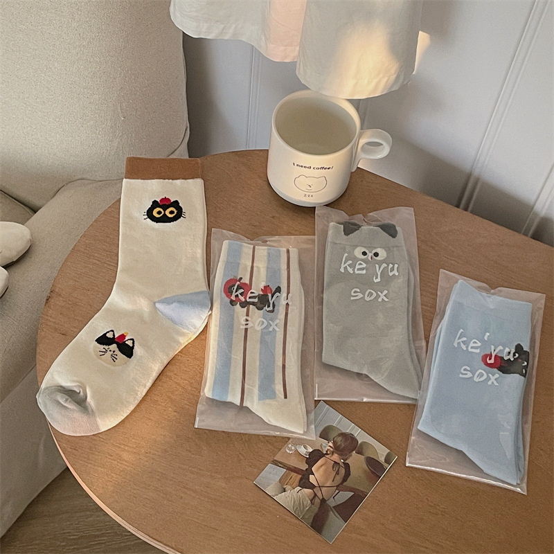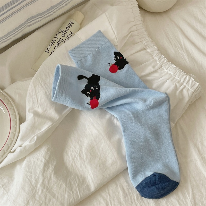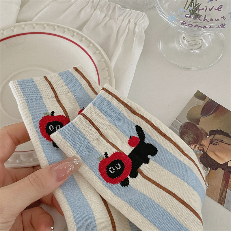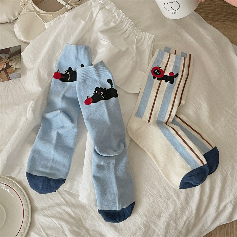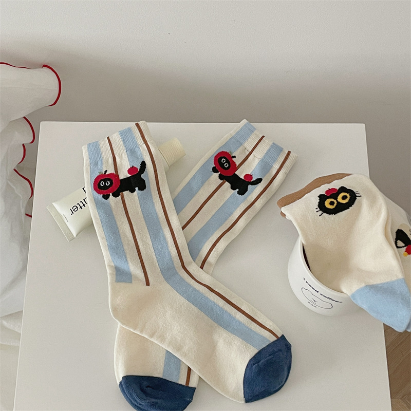한국식 만화 사과 새끼 고양이 양말 여성의 수직 중간 섹션 양말 트렌디 한 일본 스타일 귀여운 대학 스타일 봄 및 가을 양말