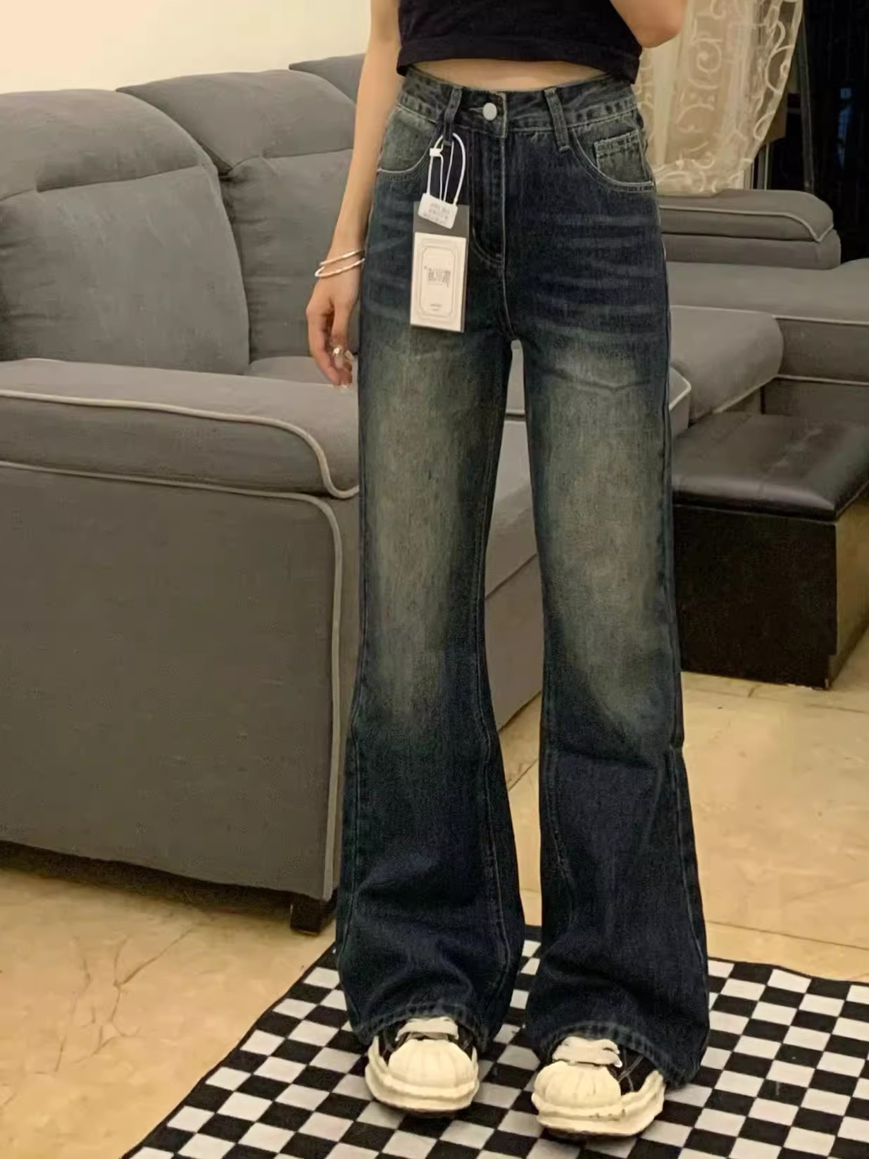 배 모양의 복고풍 마이크로 플레어 청바지 여성의 2025 봄 플러스 사이즈 통통녀 높은 허리 슬리밍 스트레이트 다리 바지스토어 가기