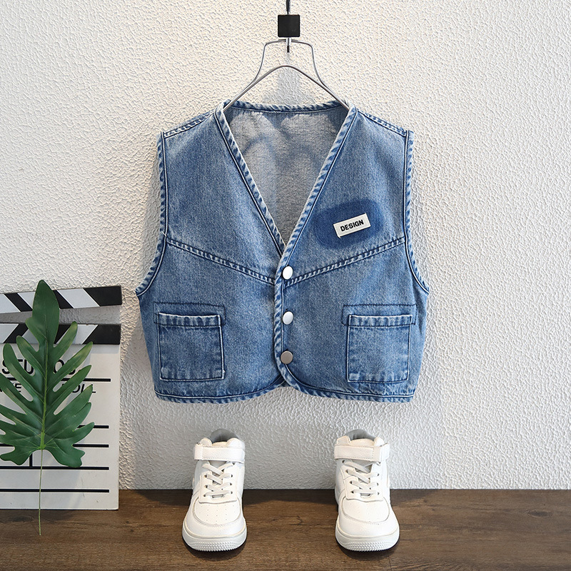 남학생 데님 조끼 어린이 봄 · 가을 조끼 트렌디 더블포켓 아우터웨어 어린이 서양식 싱글 브레스트 가을 한국 스타일