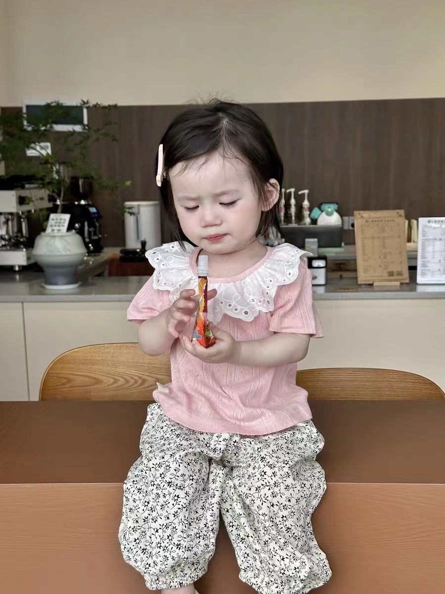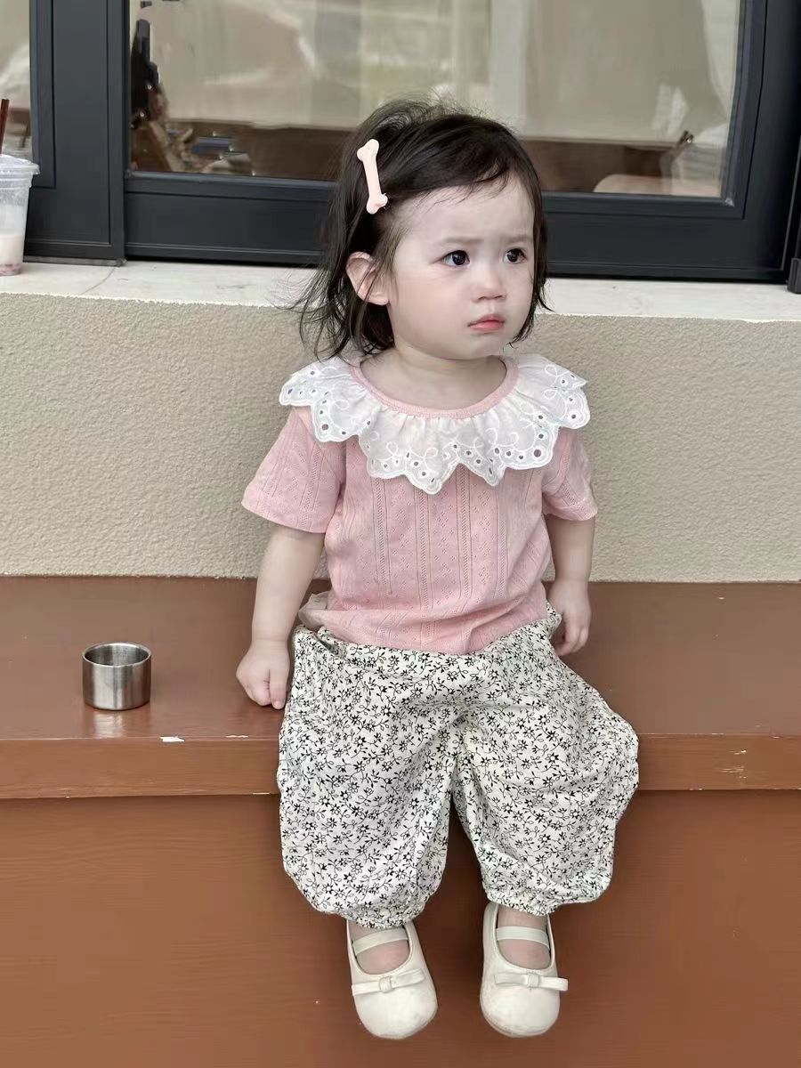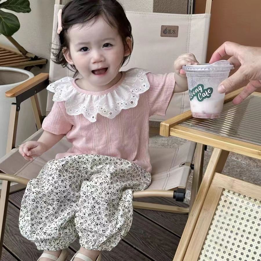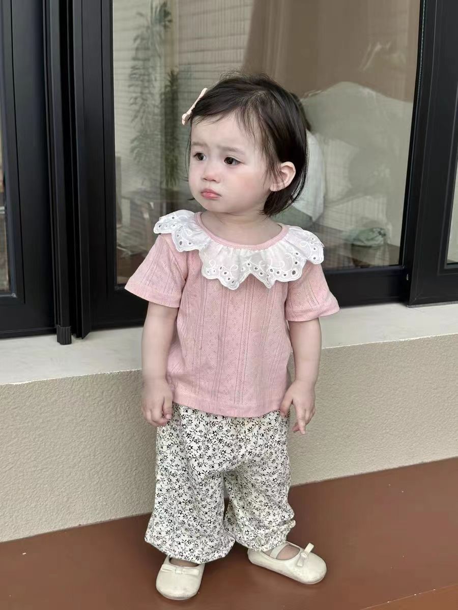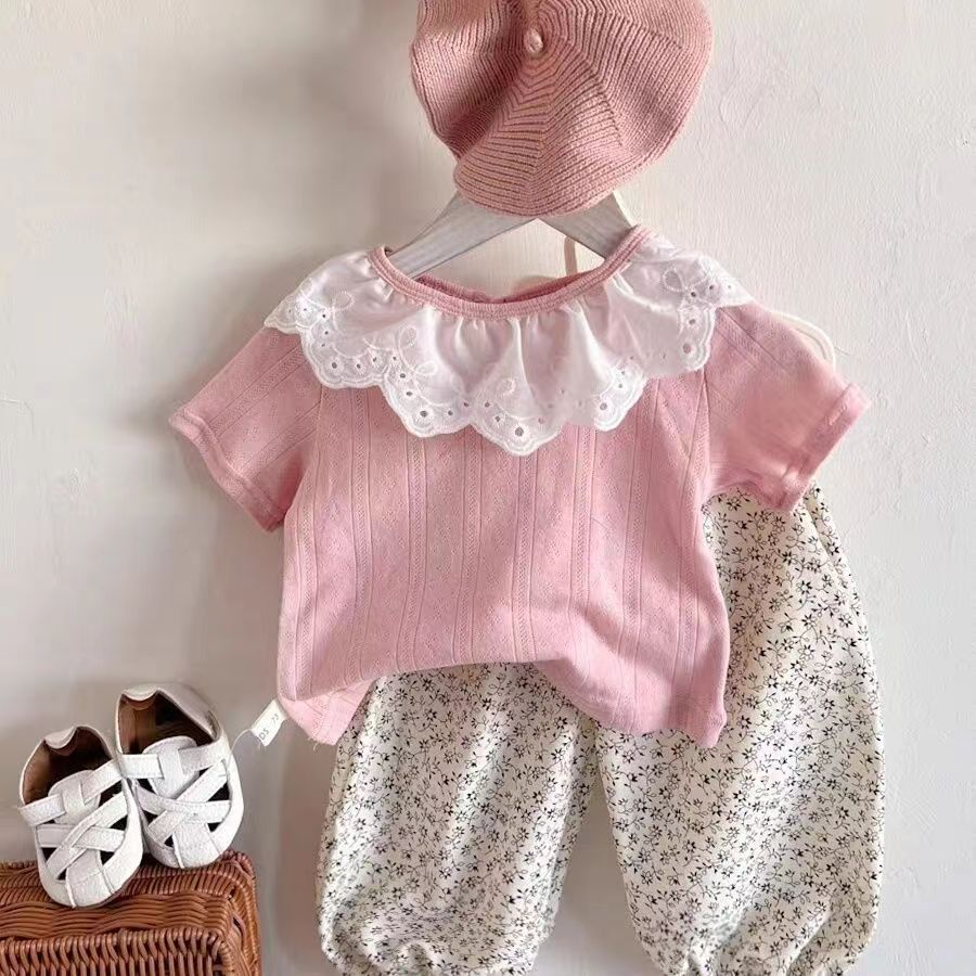 Ins 여름 투피스 레이스 칼라 얇은 메쉬 통기성 반팔 티셔츠 여성의 여름 안티 모기 바지 스타일라인 세트스토어 가기