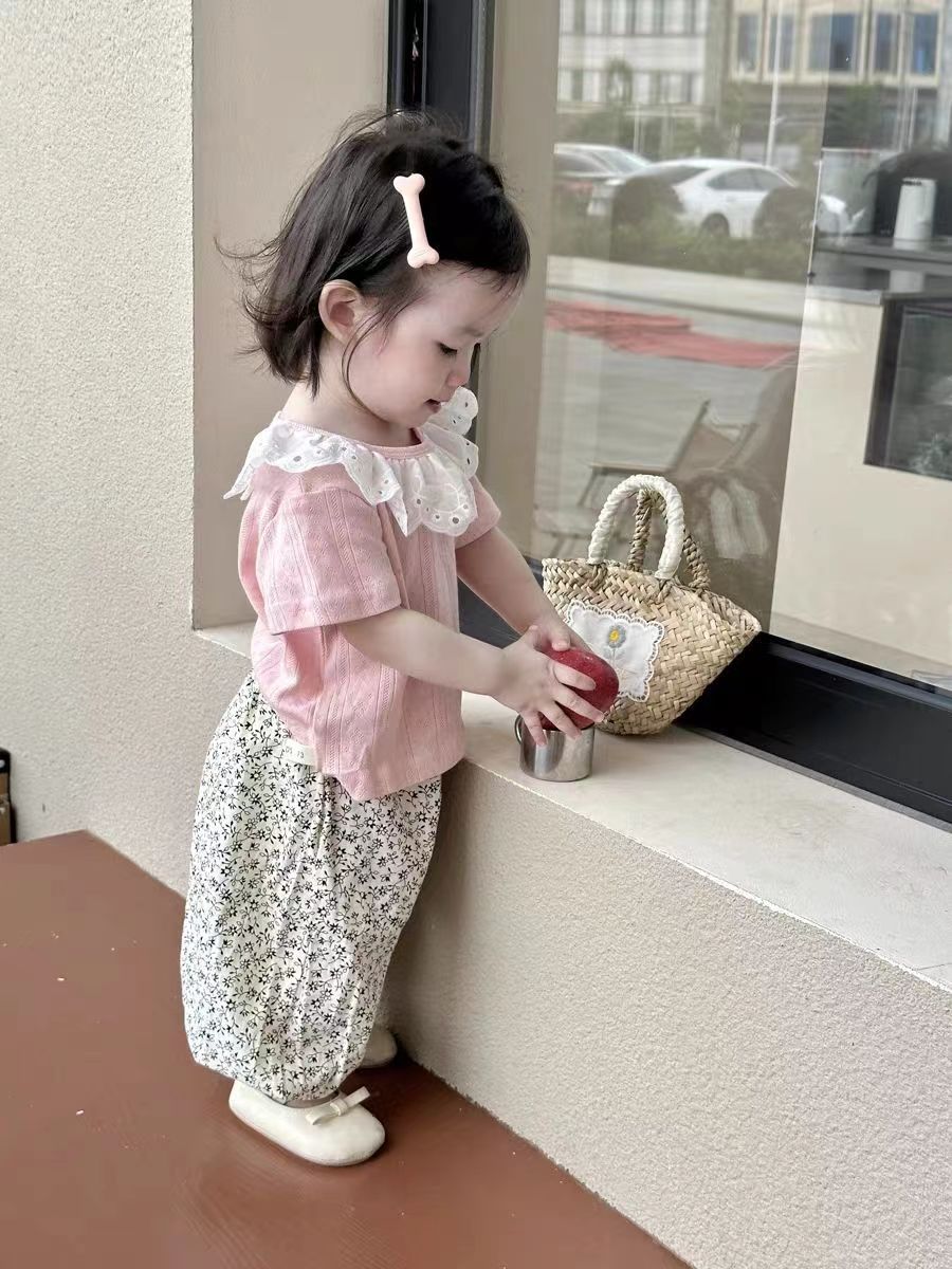 Ins 여름 투피스 레이스 칼라 얇은 메쉬 통기성 반팔 티셔츠 여성의 여름 안티 모기 바지 스타일라인 세트