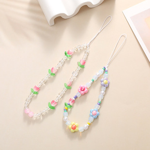 新款水晶郁金香花朵串珠手机链少女粉色手机壳挂饰挂件防丢手腕带