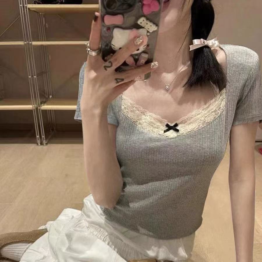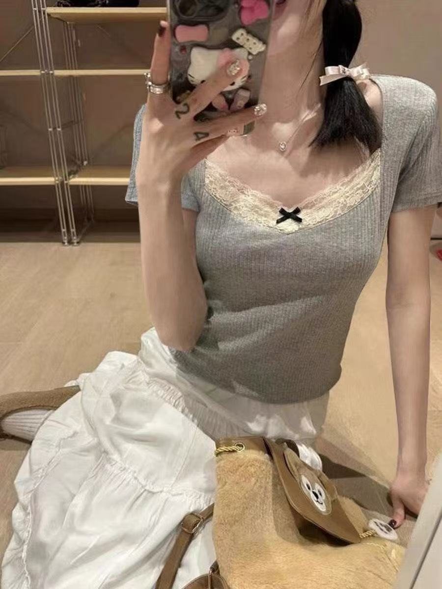 [비스코스 섬유 소재] 순수한 스티칭 발레 레이스 레이스 슬림 그레이 숄더 티셔츠 짧은 소매 여름스토어 가기