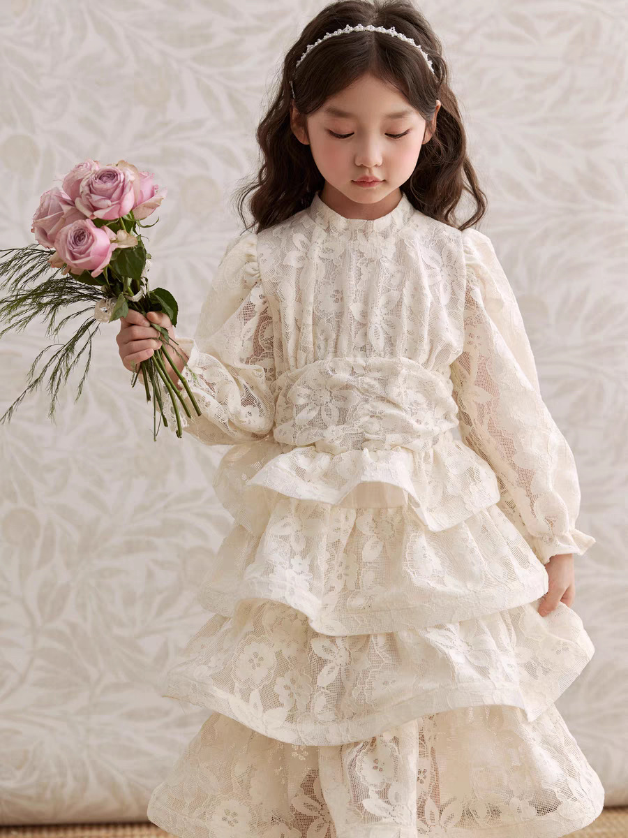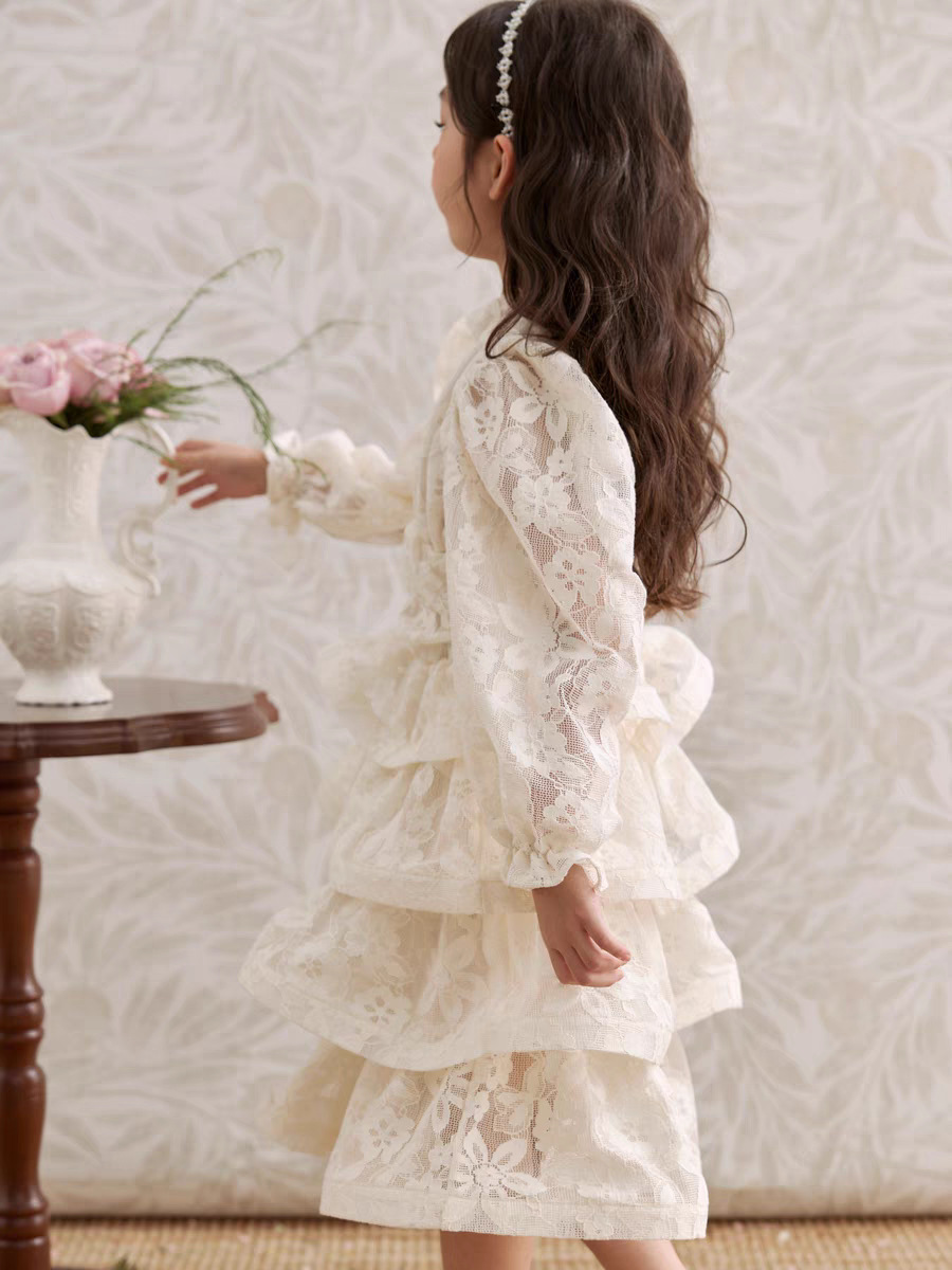 2025 봄 여아 프렌치 스타일 긴팔 원피스, 니치 레트로 궁전풍 레이어드 케이크 스커트 레이스