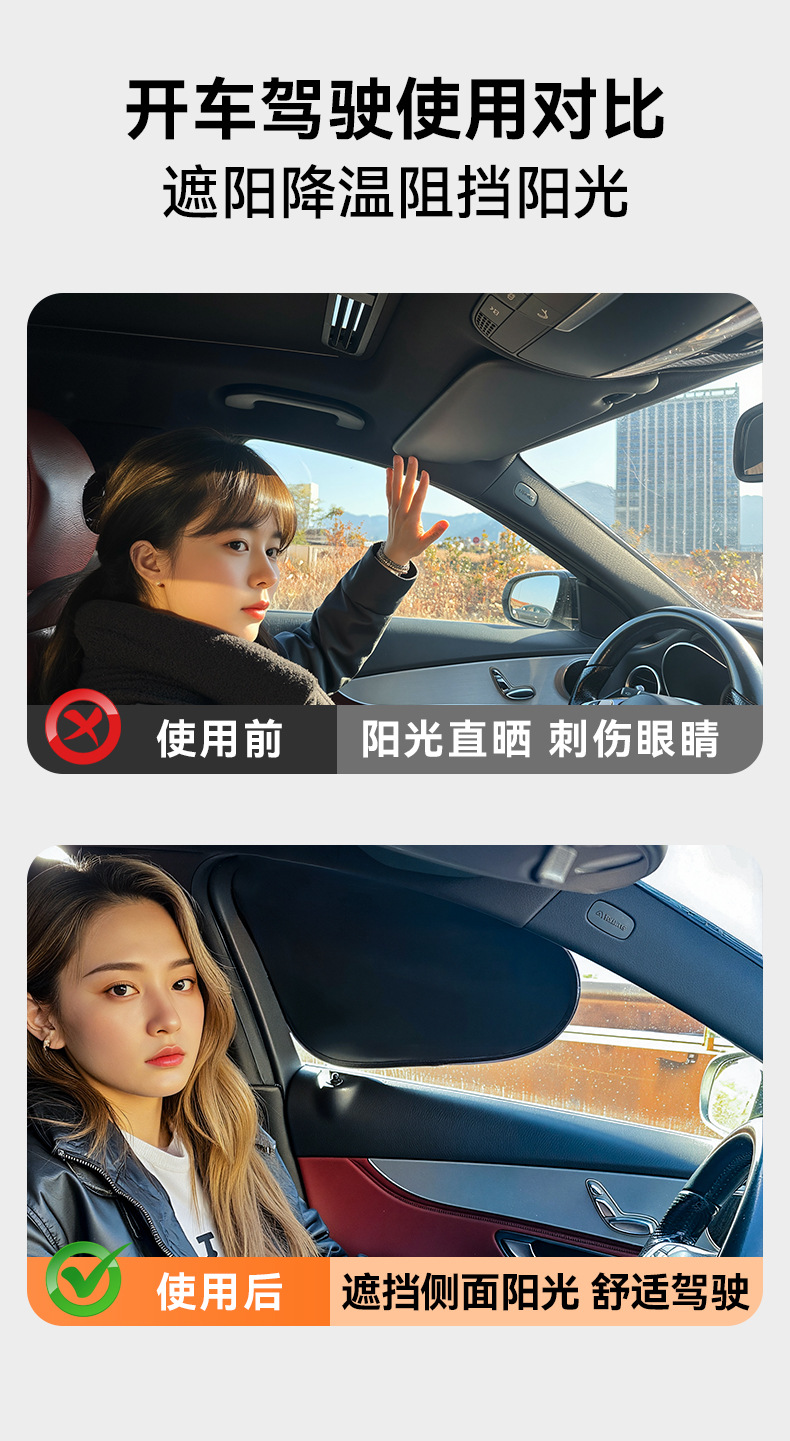 1※ 汽车侧窗。 ※ 可有效降低车内温度。吸附在汽车玻璃上,使用和取下都很方便,前后玻璃通用。