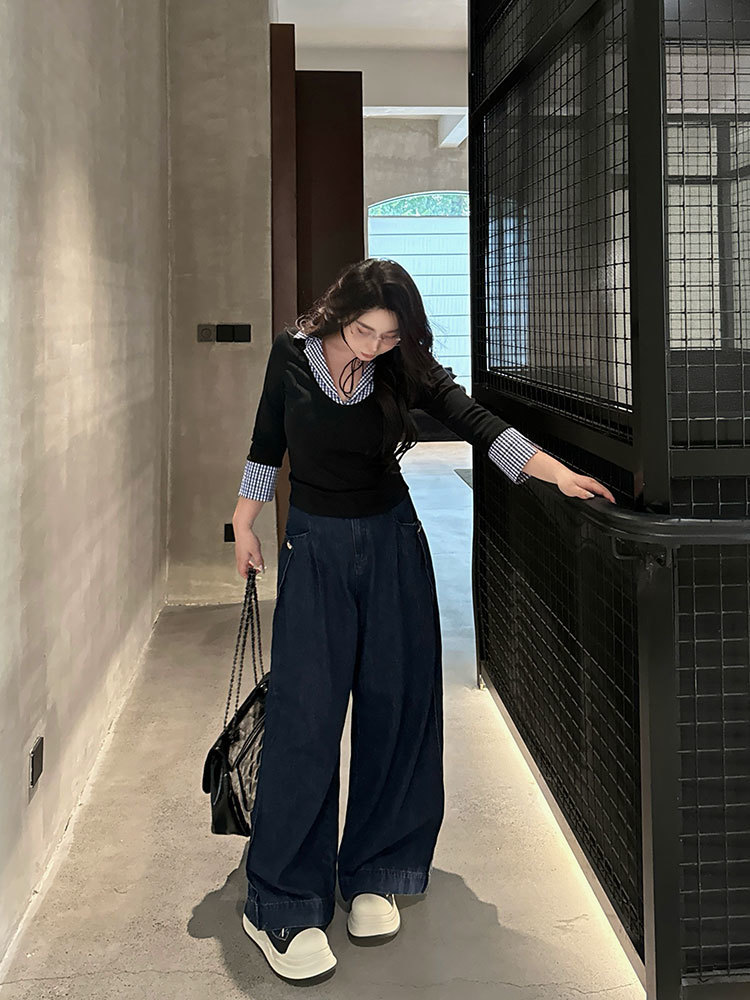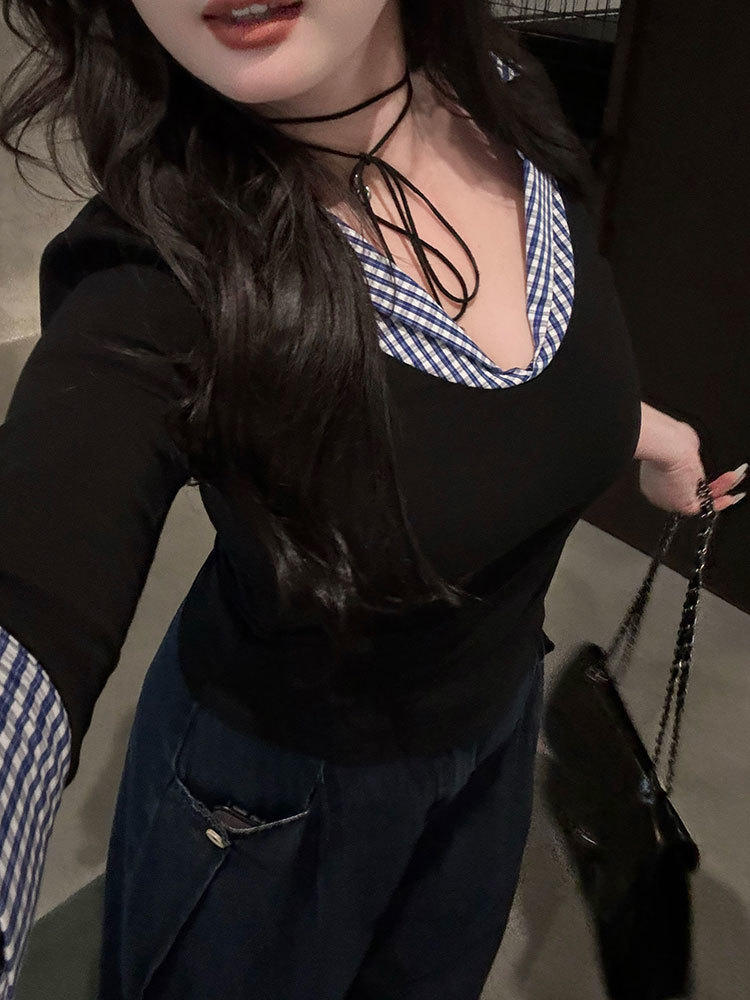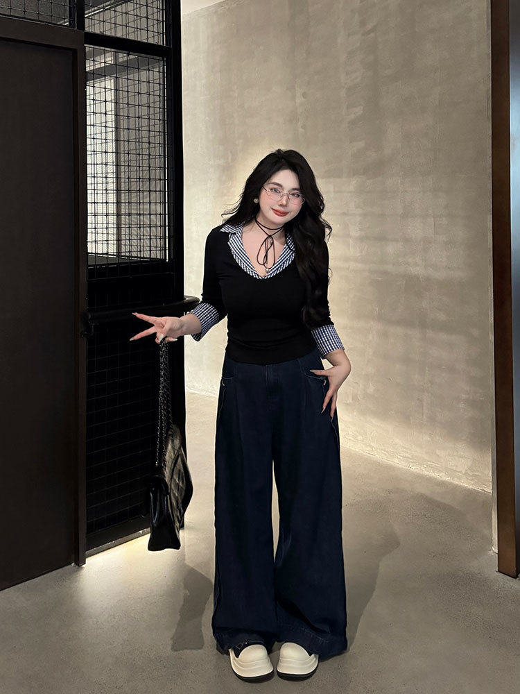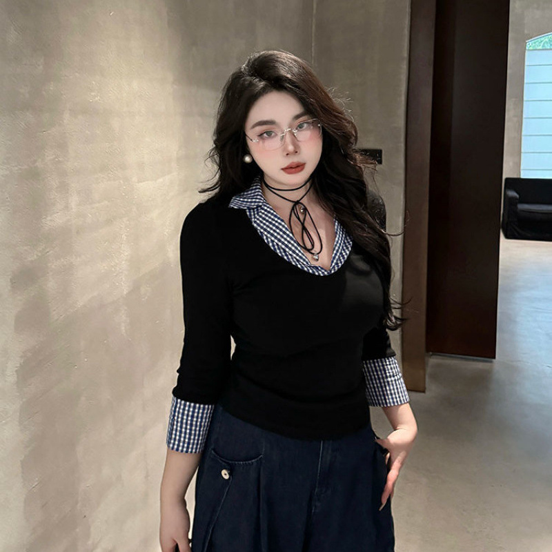 약간의 통통한 플러스 사이즈 대학 스타일의 가짜 투피스 격자 무늬 스티칭 폴로 칼라 긴팔 최고 여성 가을 슬림 올 매치 티셔츠