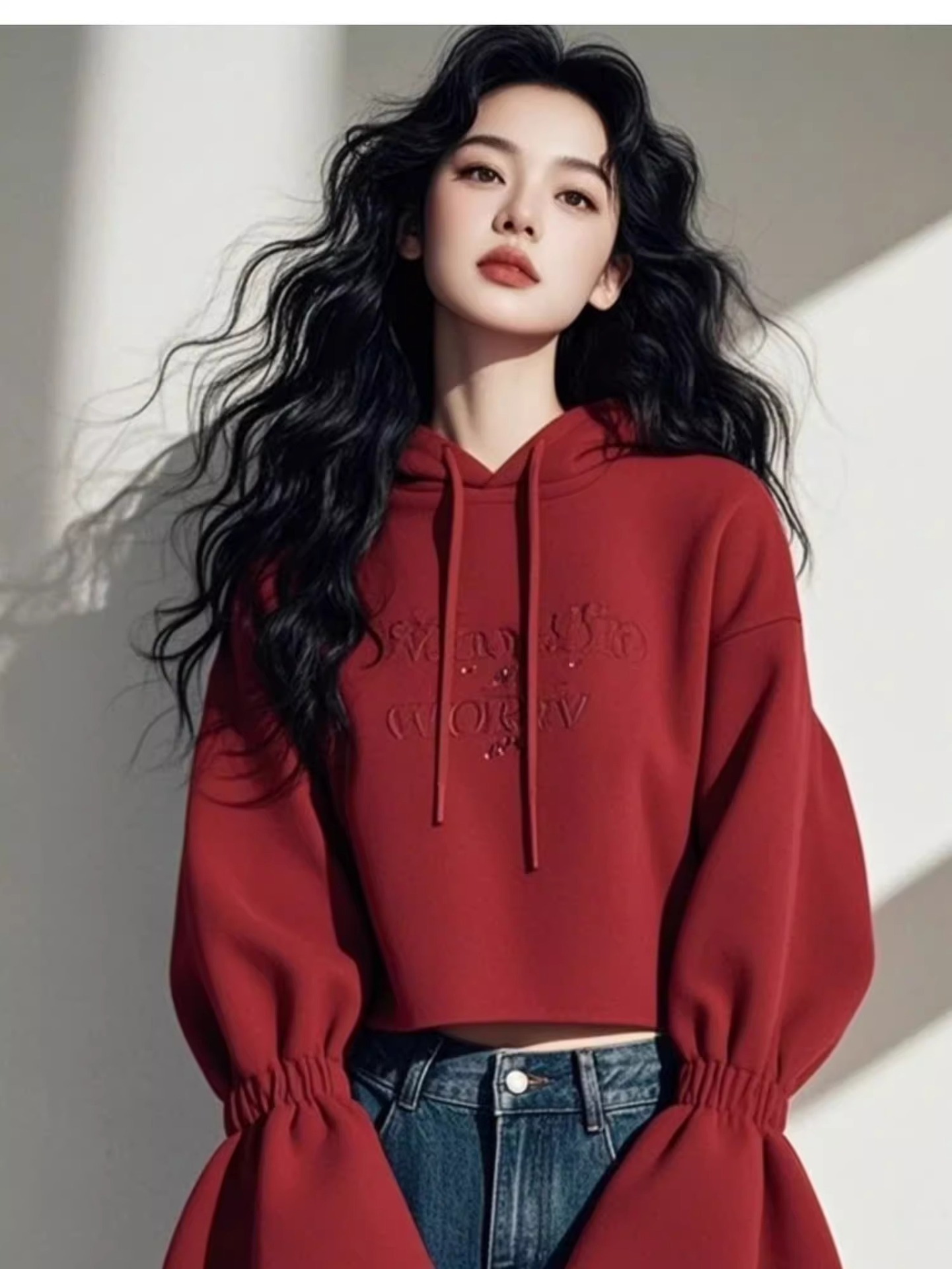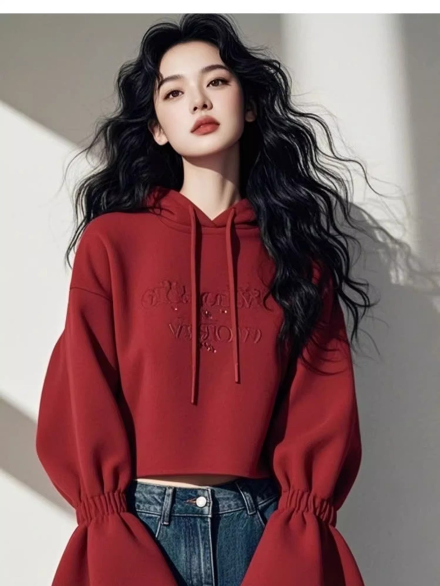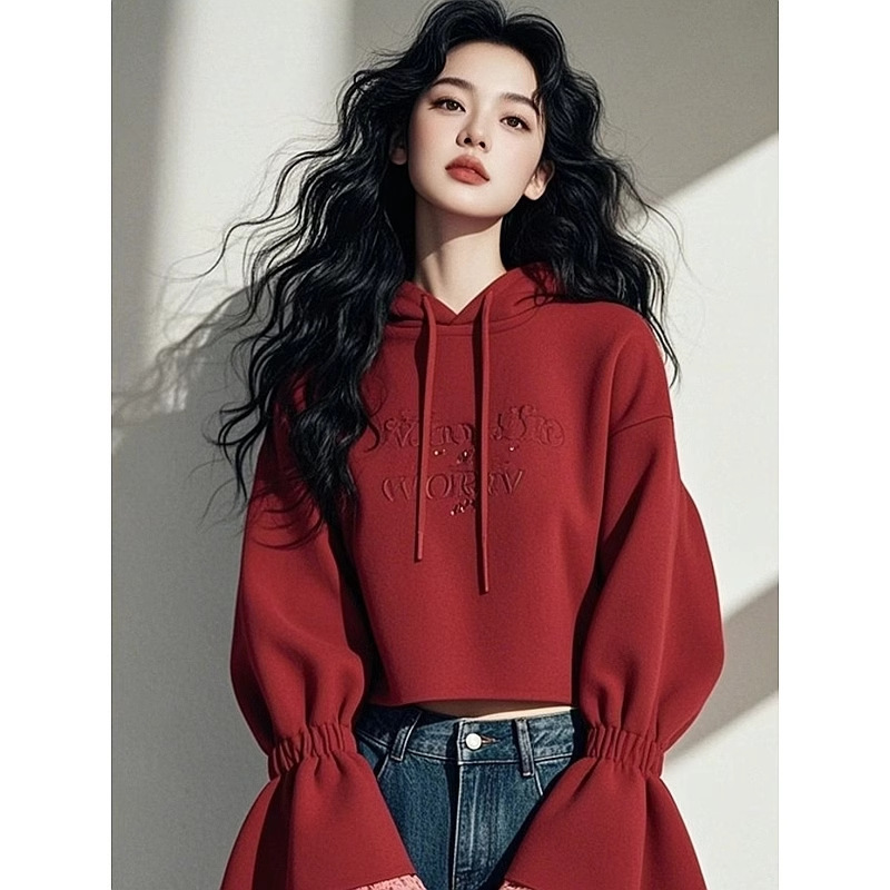 플러스 사이즈 레이스 바느질 뿔 슬리브 후드 레드 스웨트 여성 봄 새로운 패션 웨스턴 스타일 통통녀 쇼트 탑스토어 가기