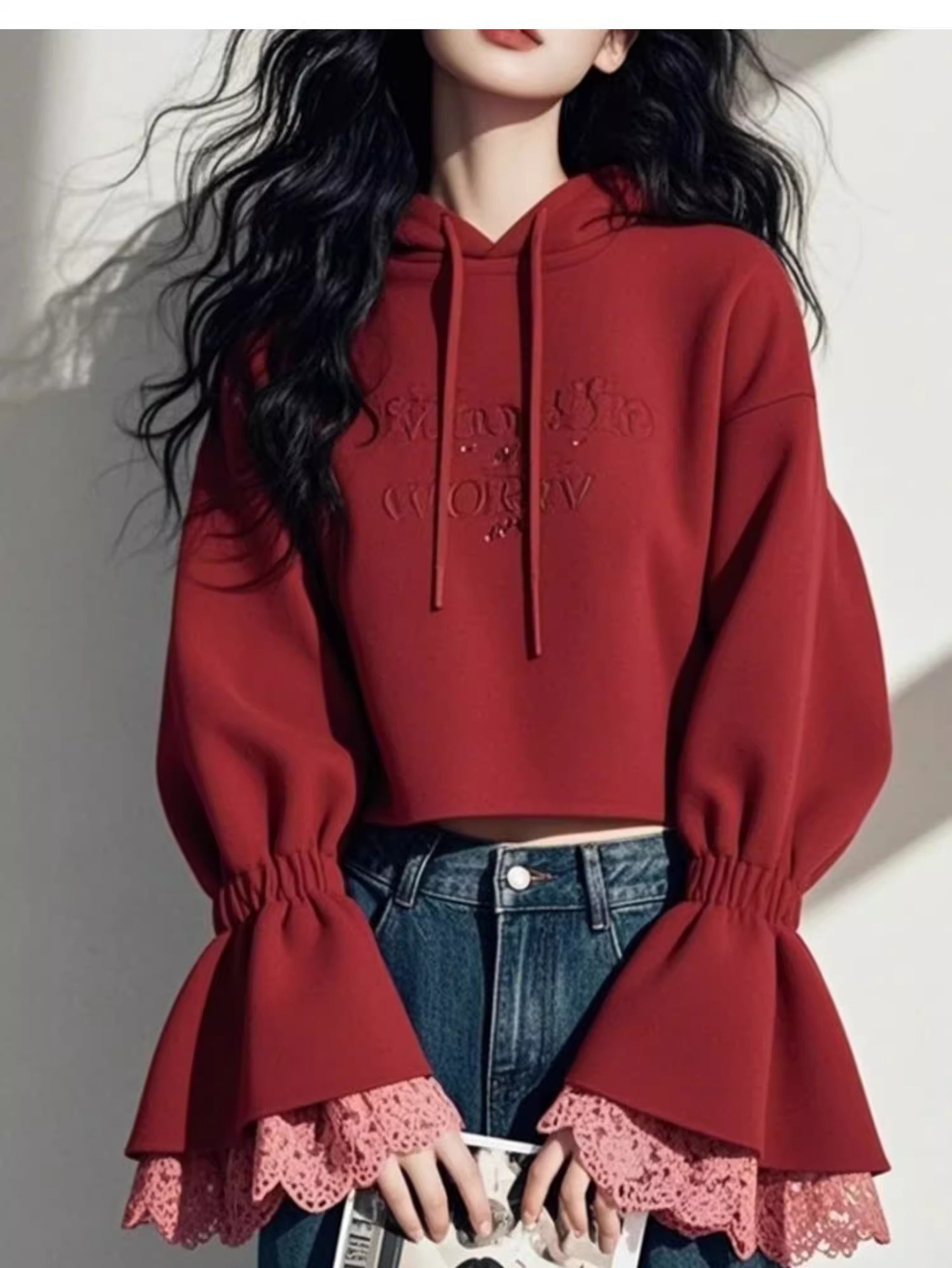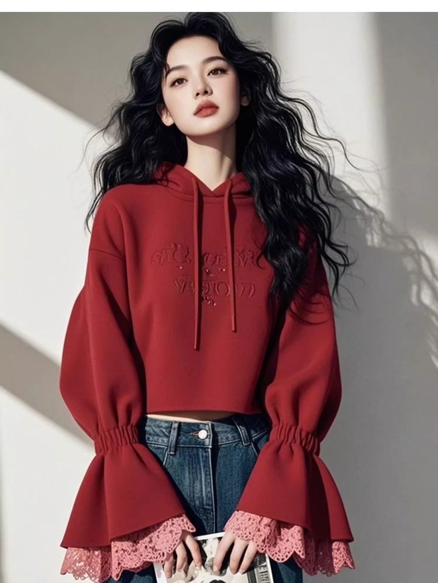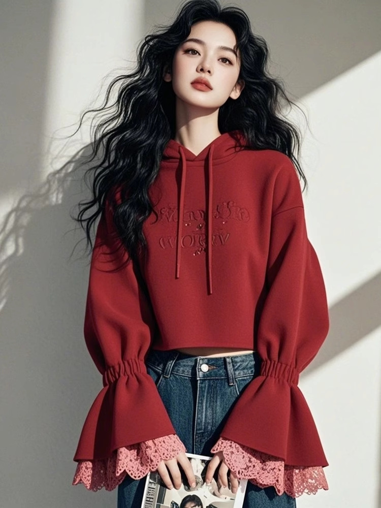 플러스 사이즈 레이스 바느질 뿔 슬리브 후드 레드 스웨트 여성 봄 새로운 패션 웨스턴 스타일 통통녀 쇼트 탑