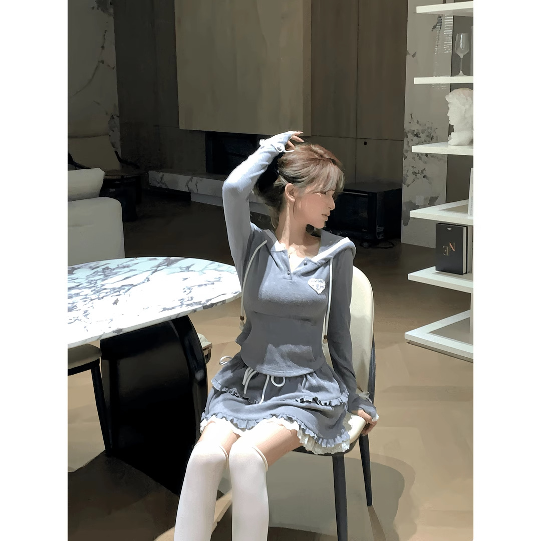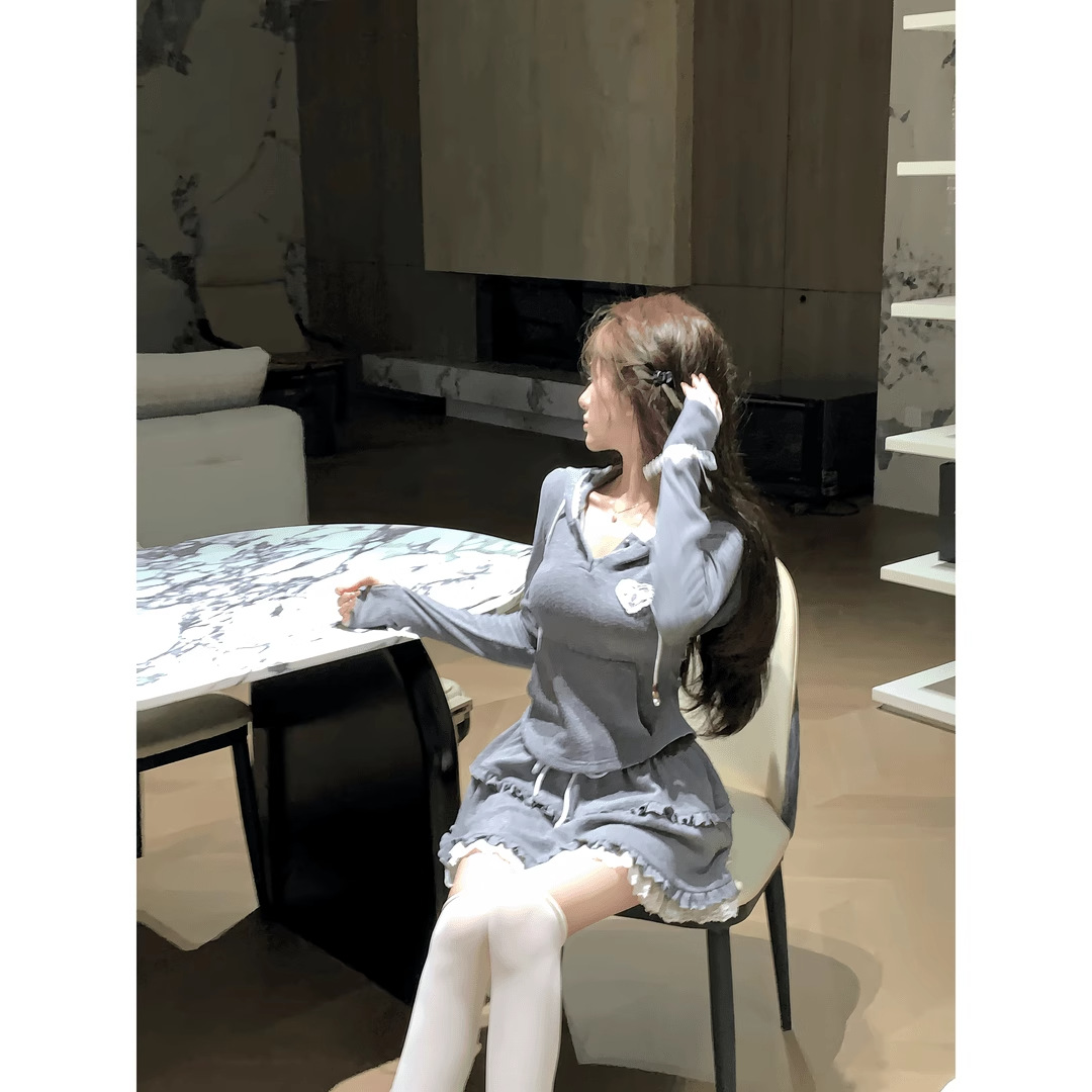 플러스 사이즈 통통녀 달콤한 향신료 소녀 순수한 욕망 스타일 세트 여성용 봄 슬림 슬리밍 후드 탑 스커트 투피스 세트