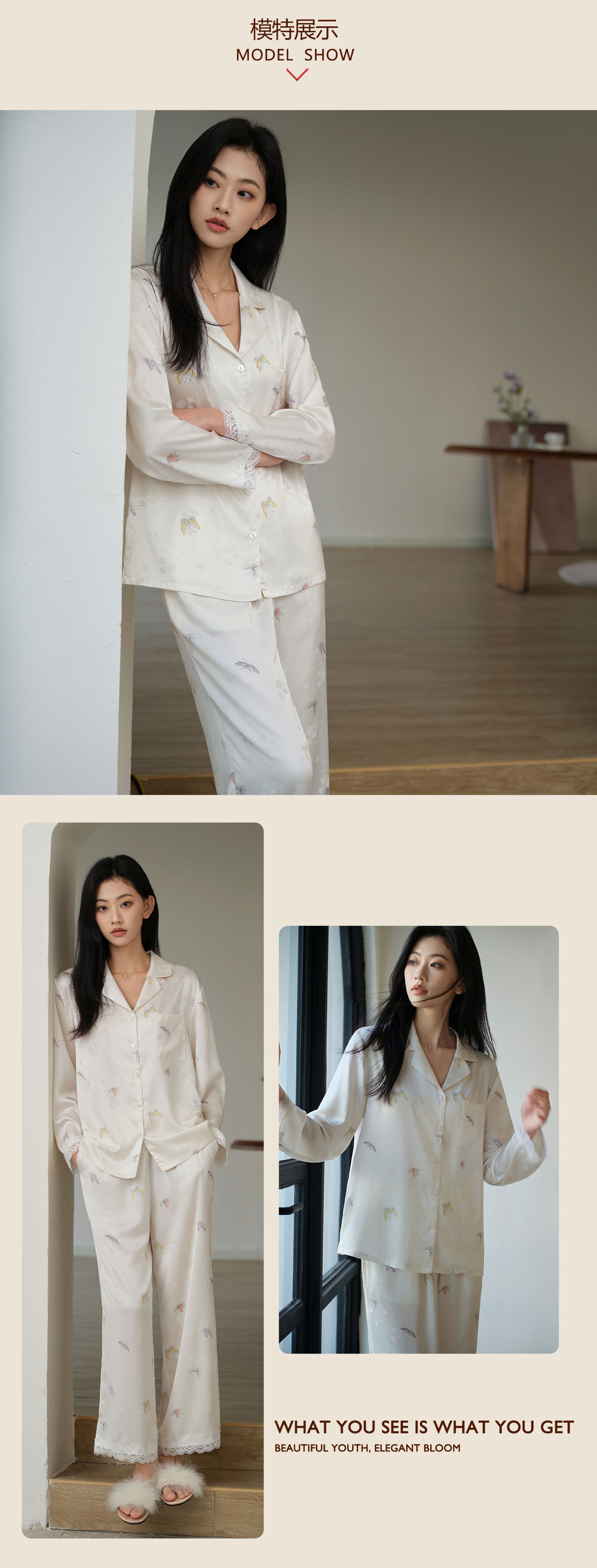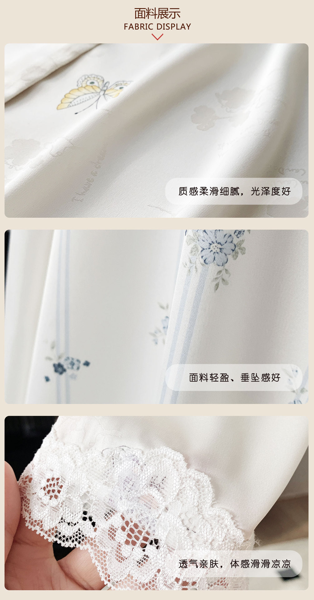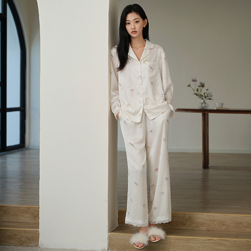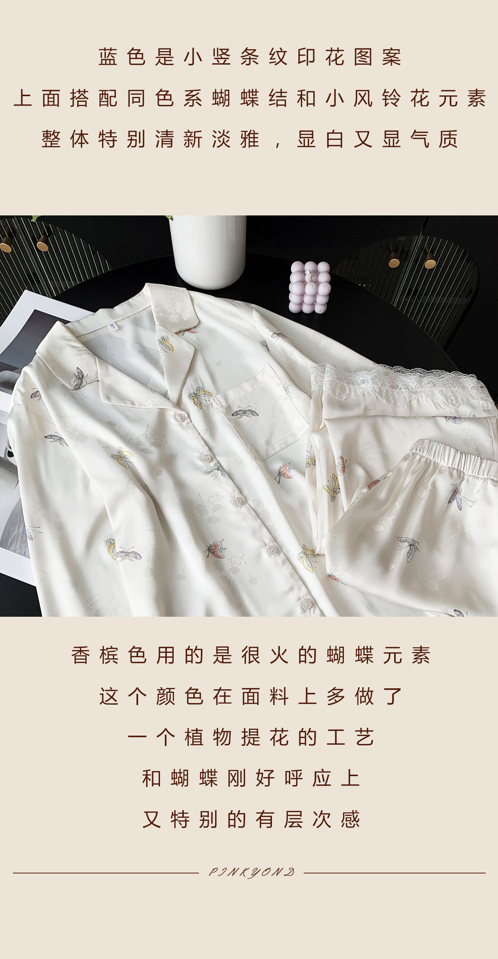 새로운 도착 봄과 여름 아이스 실크 긴 소매 간단한 절묘한 달콤한 실크 홈 착용 레이스 소매 파자마스토어 가기