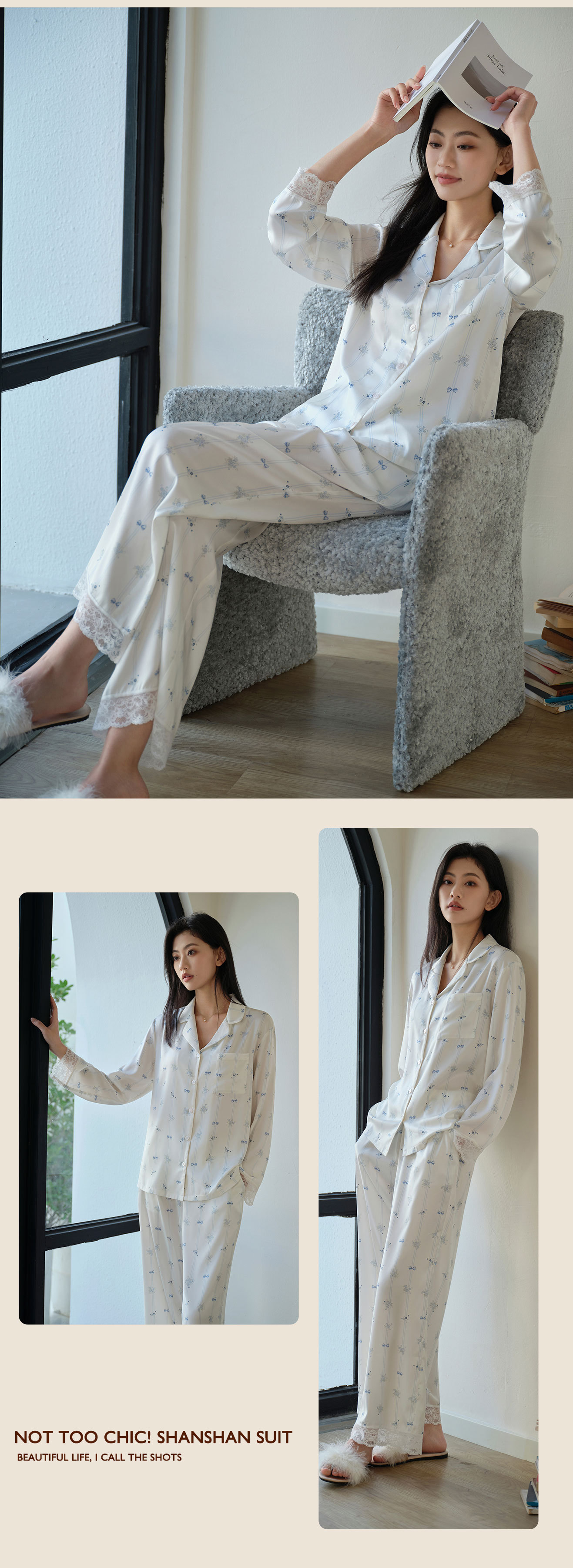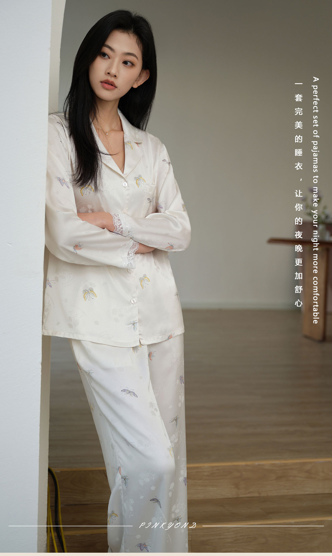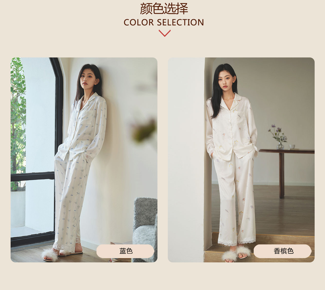 새로운 도착 봄과 여름 아이스 실크 긴 소매 간단한 절묘한 달콤한 실크 홈 착용 레이스 소매 파자마스토어 가기