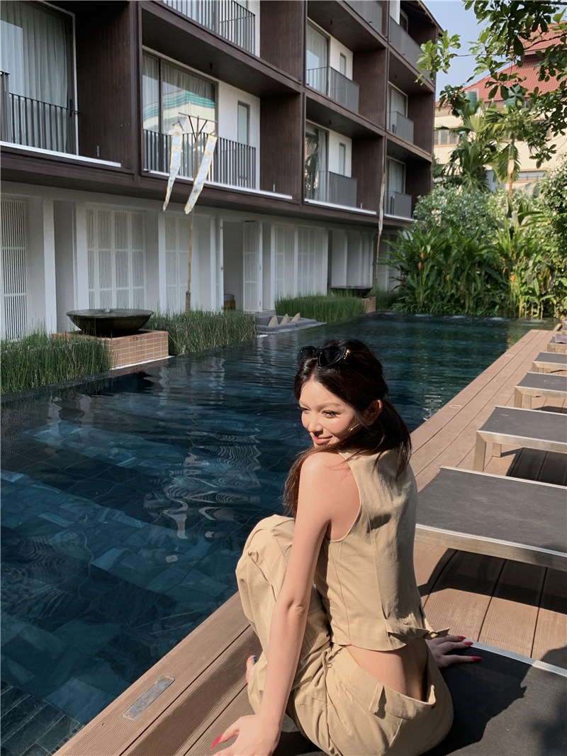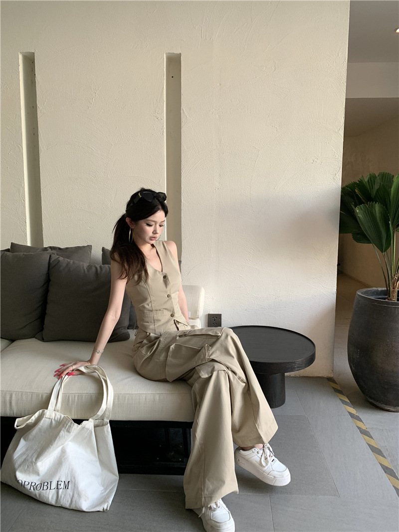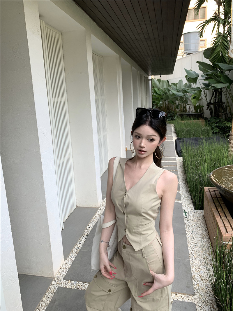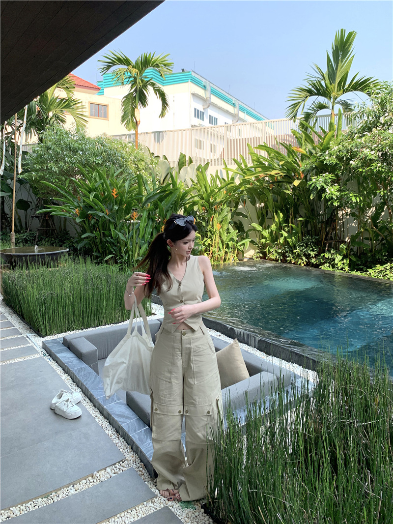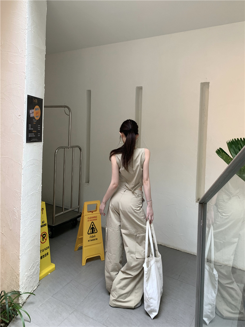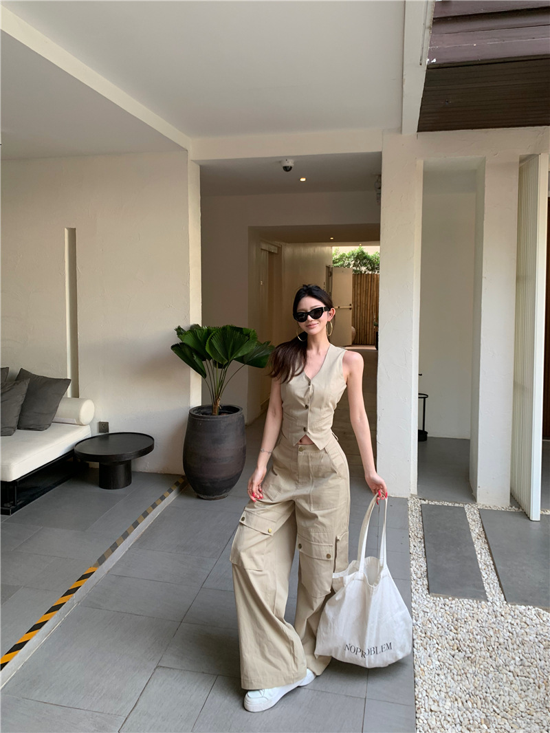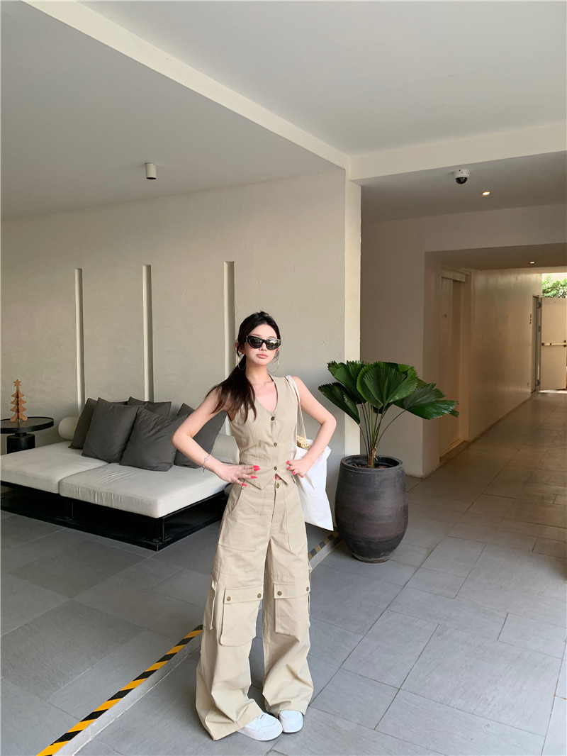 하이 엔드 아메리칸 레트로 낮은 허리 포켓 크레인 바지 슬리밍 조끼 패션 세트 투피스 세트스토어 가기