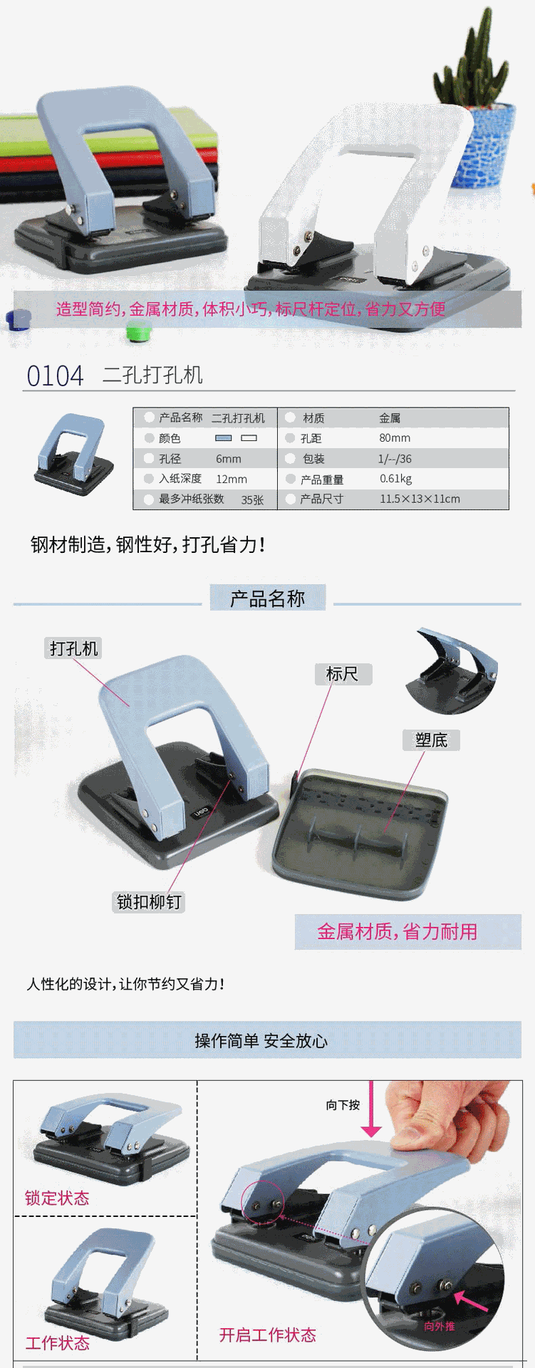 델리 0104 펀처 2 홀 종이 펀처 수동 펀처 루스 리프 폴더 학생 바인딩 클립