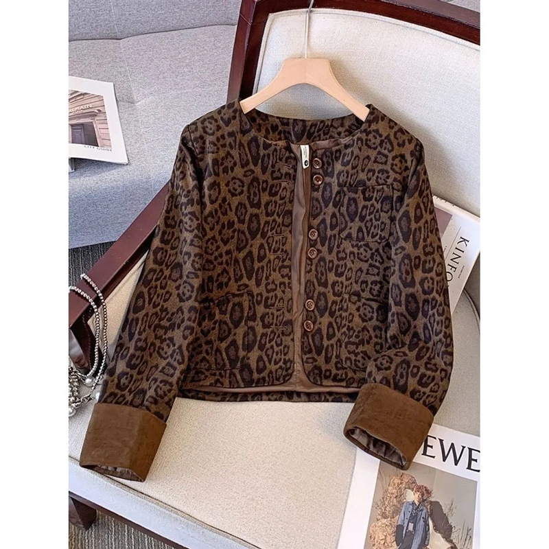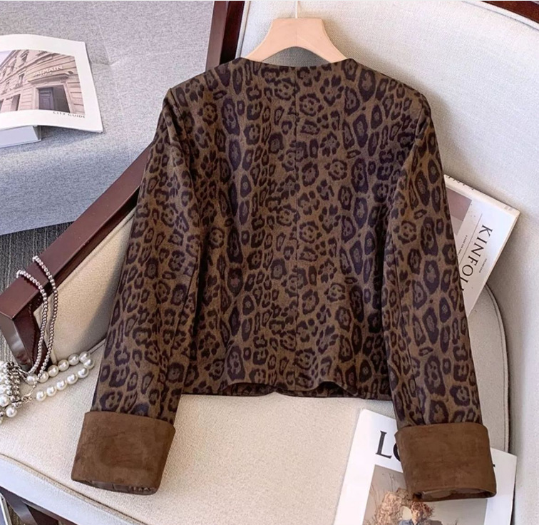 레오파드 무늬 짧은 바느질 대비 컬러 샤넬 스타일 코트 여성의 봄과 가을 새로운 마일 라드 하이 엔드 웨스턴 스타일 탑 재킷