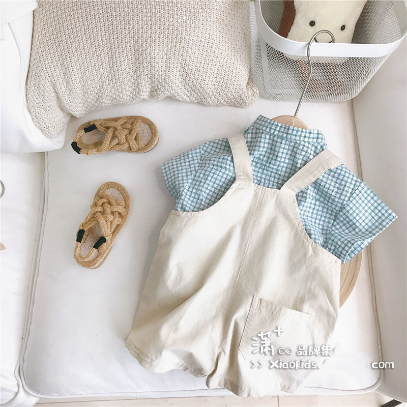 여름 작은 신선한 ~ 중소형 어린이 한국어 버전의 격자 무늬 셔츠 멜빵 세트 여름 소년 세트 얇은 인 스타일스토어 가기