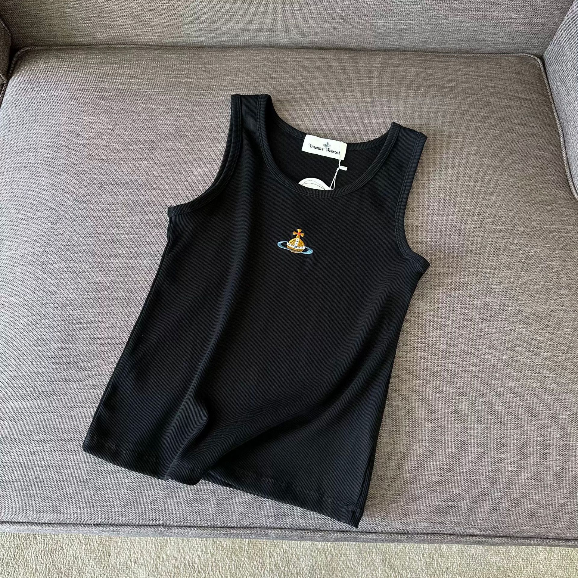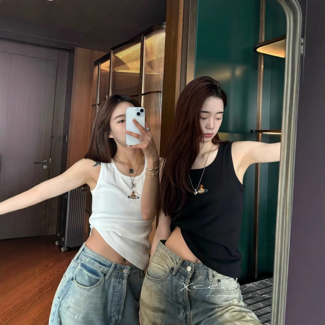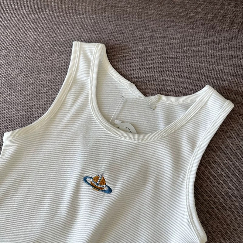 틈새 2025 봄과 여름 새로운 간단한 다채로운 자수 토성 슬림 핏 스트레치 리브 코튼 조끼 남자와 여자를위한 탑스토어 가기