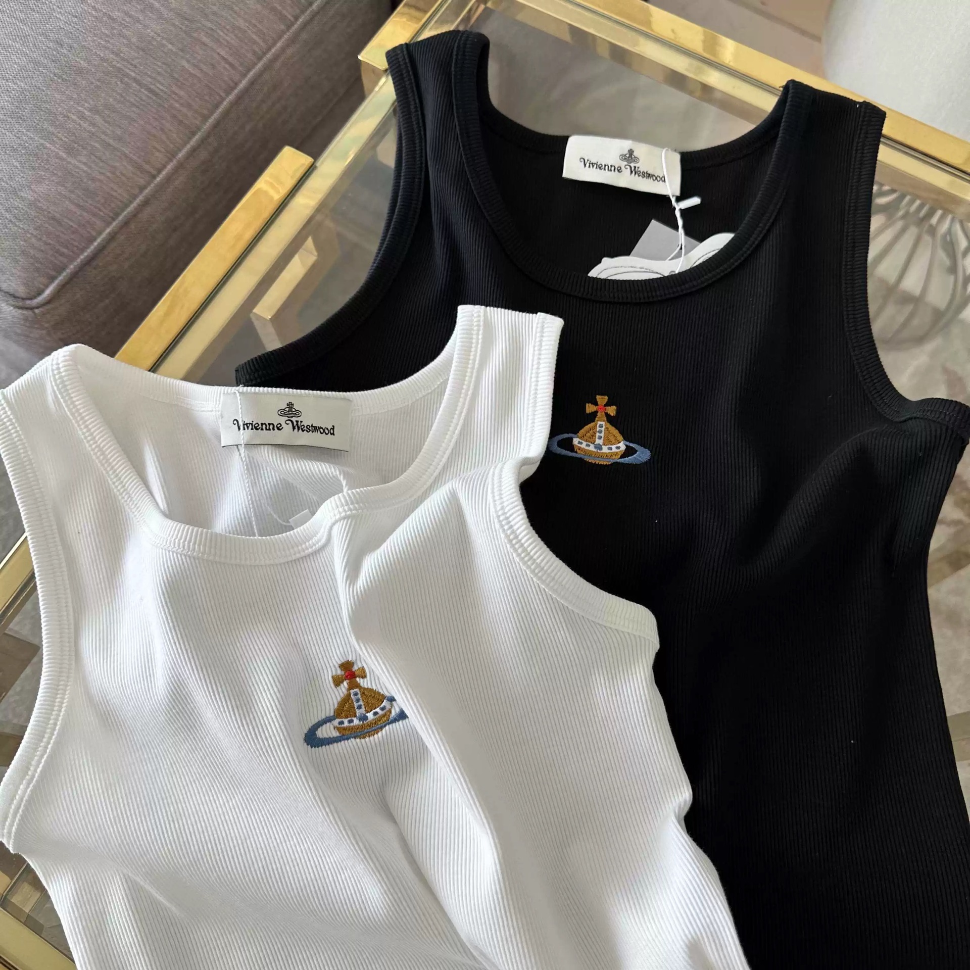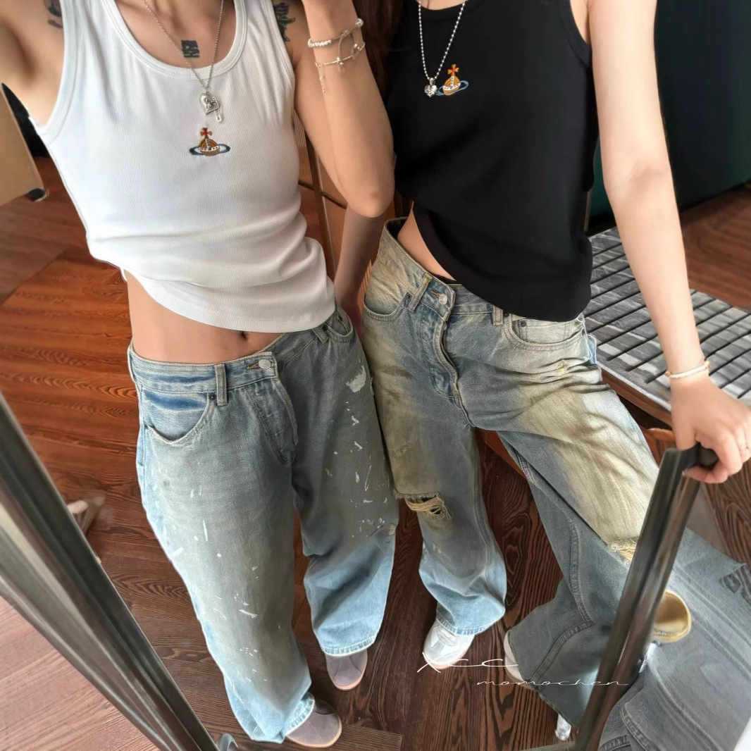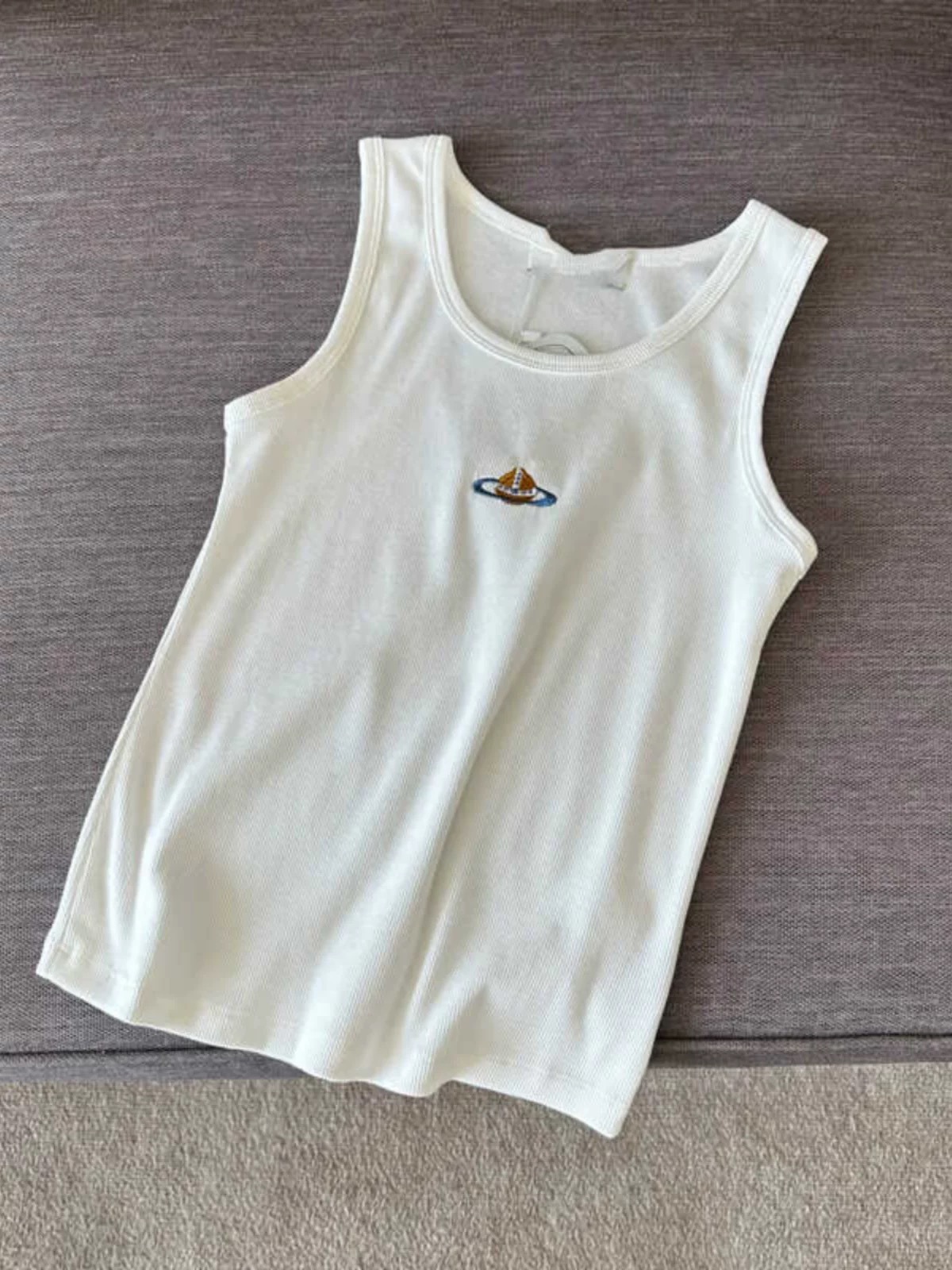틈새 2025 봄과 여름 새로운 간단한 다채로운 자수 토성 슬림 핏 스트레치 리브 코튼 조끼 남자와 여자를위한 탑스토어 가기